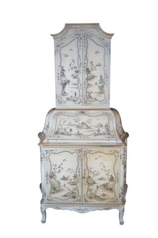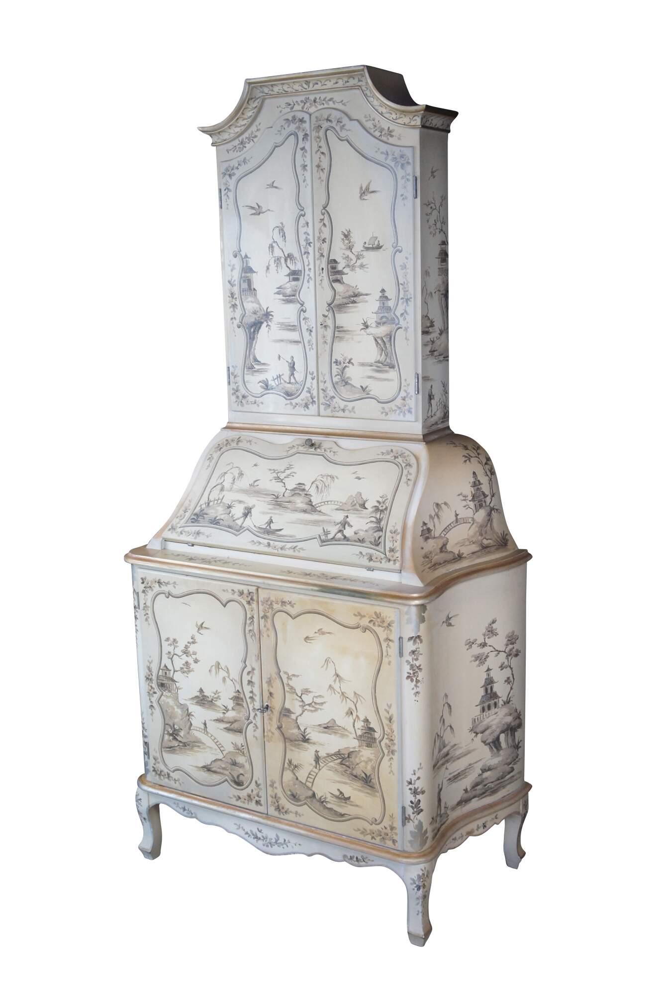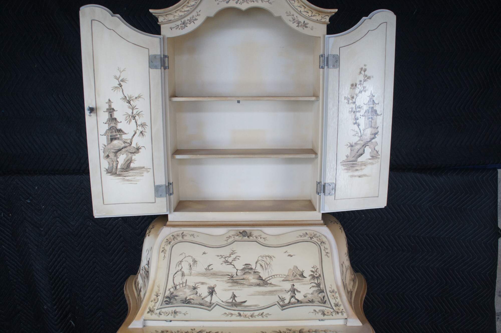 A beautiful Venetian style secretary desk, circa 1970s. Features classic Italian form with an off-white finish and chinoiserie toile landscapes. The piece includes a petite bookcase along the top with two shelves over a drop front secretary desk that opens to cubies and drawers. The cabinet base opens to one shelf. The case is supported by cabriole legs. A fun addition to any space.