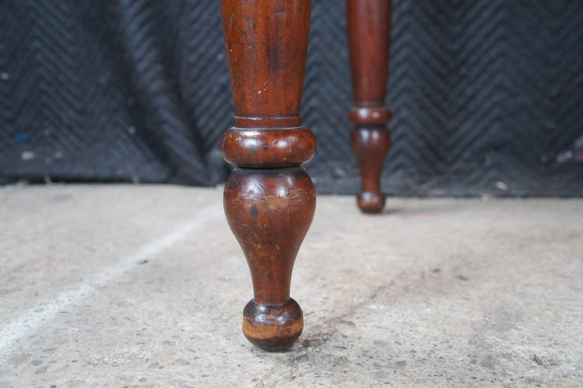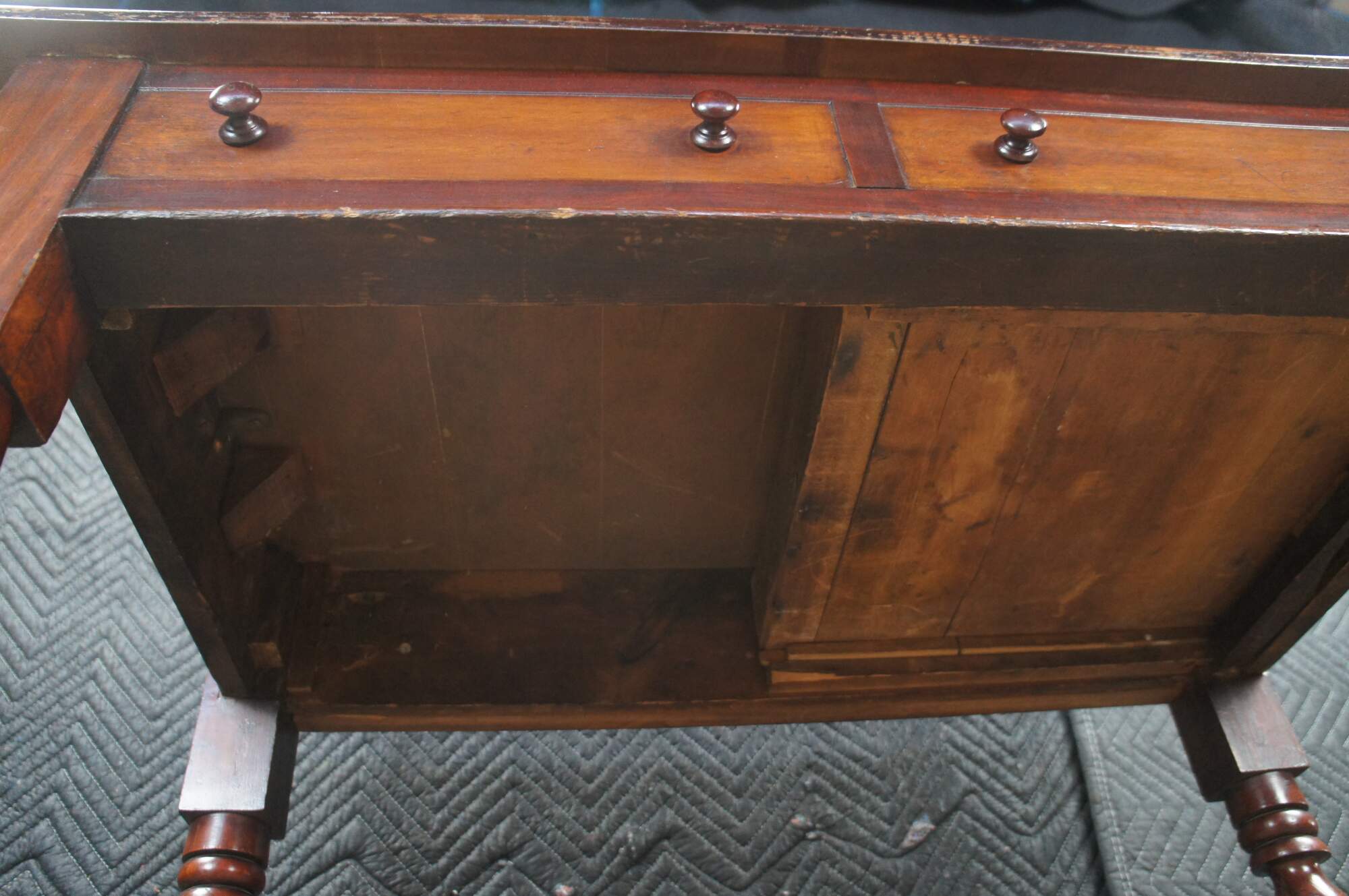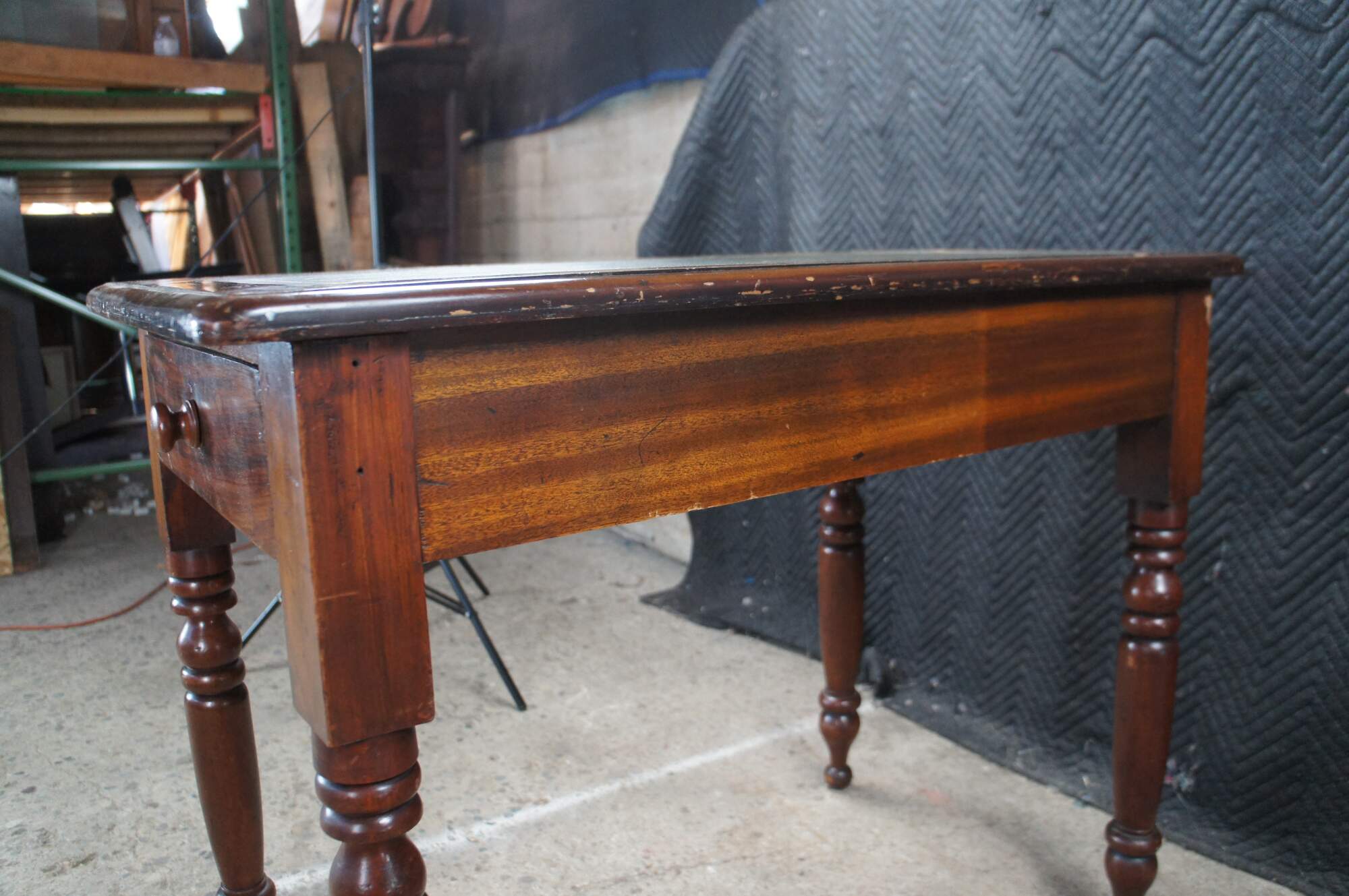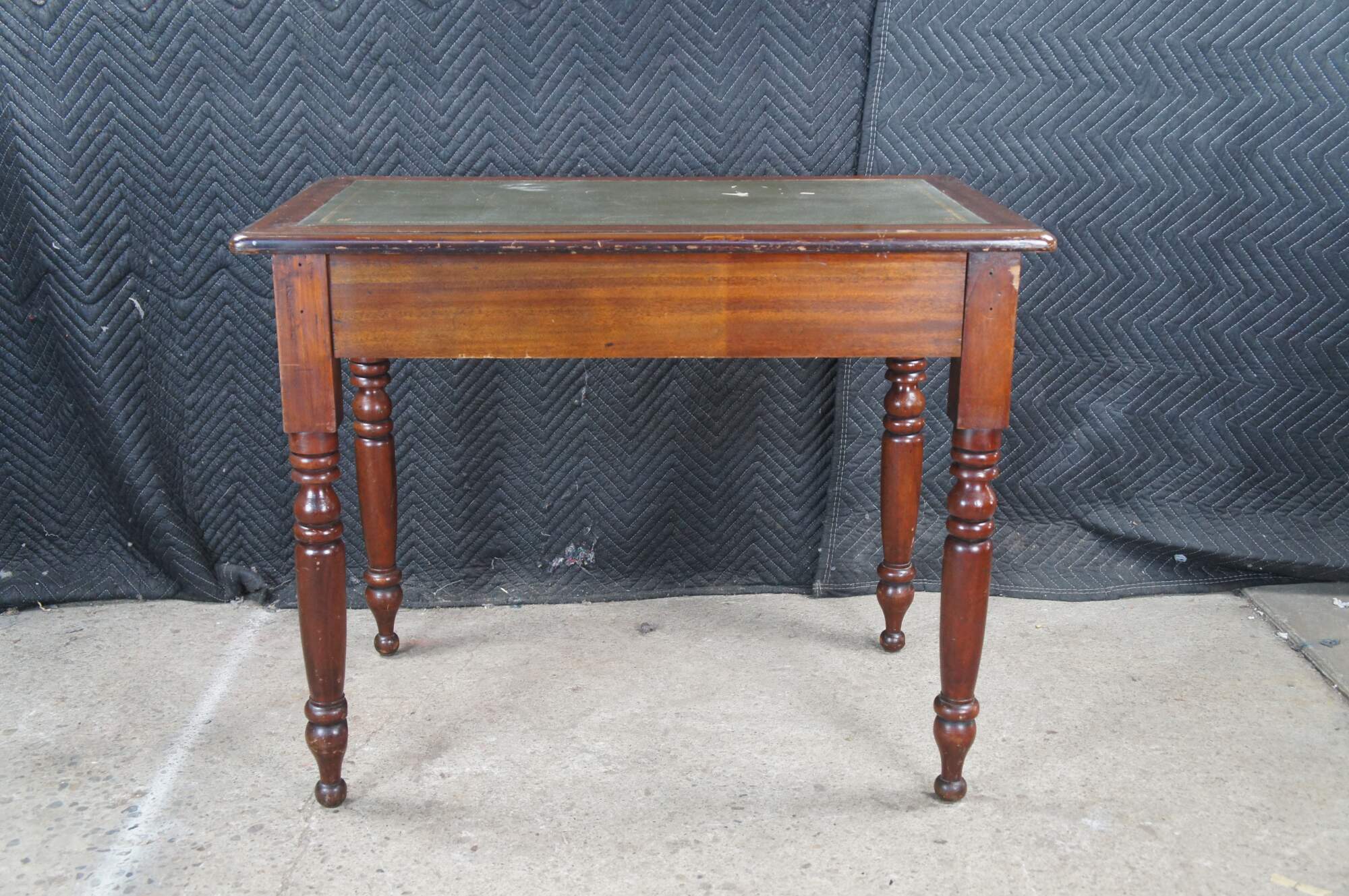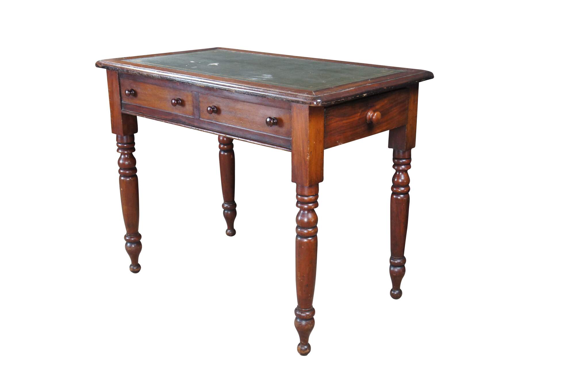An exceptional early 19th Century William IV Writing Table. Features a rectangular form with green tooled leather inset top over a frieze of two false drawers. Along the right side of the desk is a pull for a hand dovetailed drawer with compartment. This drawer originally was hidden and would have been accessed via the groove along its underside. At some point in the 20th century a hand turned wooden pull was added. The desk is supported by four turned legs with ribbed accents and arrow feet. Whether it is used as a library table. writing desk, console it'll make a charming addition to any space.