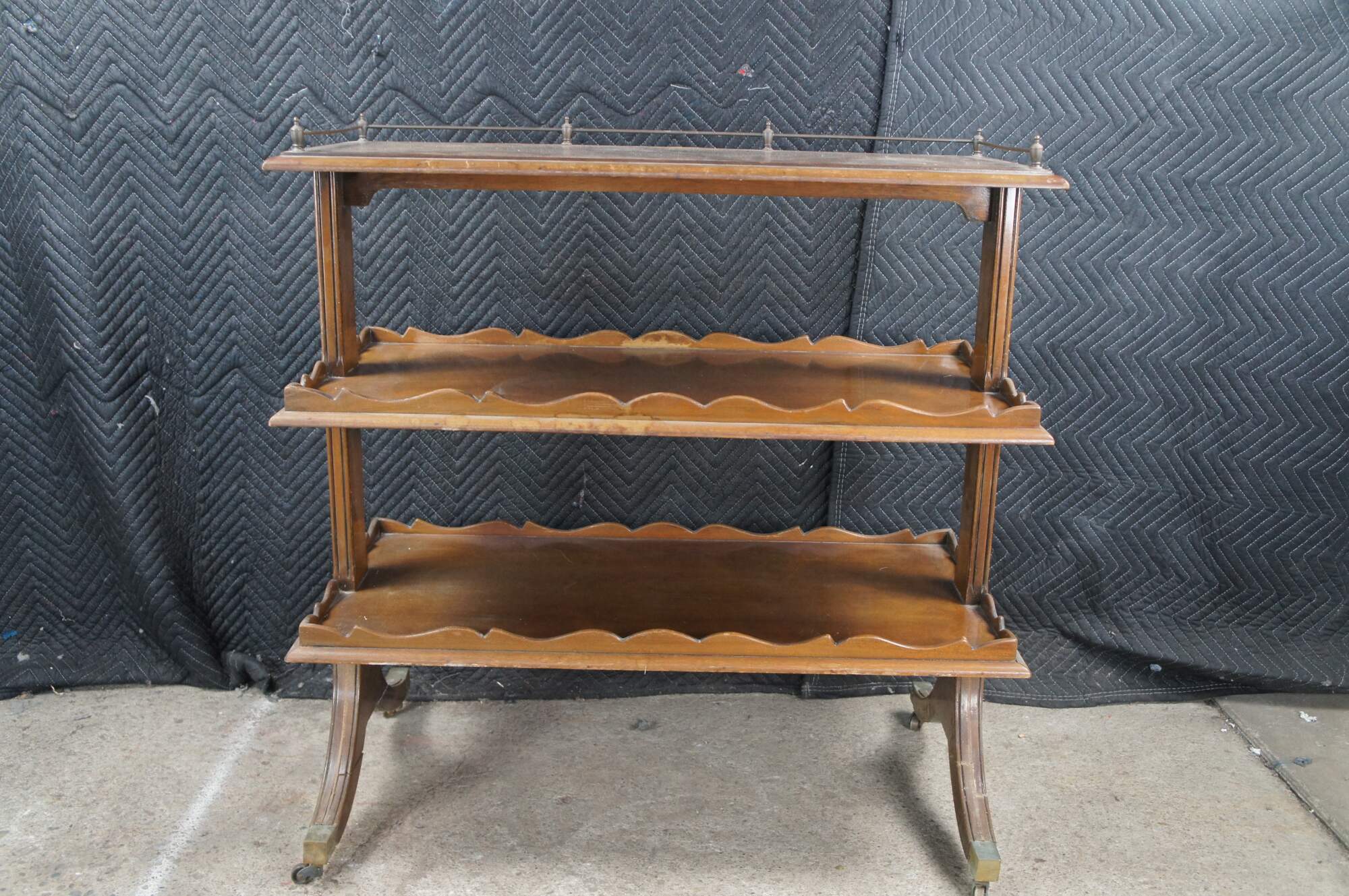 Early 20th Century English Regency / Duncan Phyfe style serving table. Made from mahogany with three tiers, a brass gallery and saber legs with brass casters. The second and third level showcase a serpentine gallery.