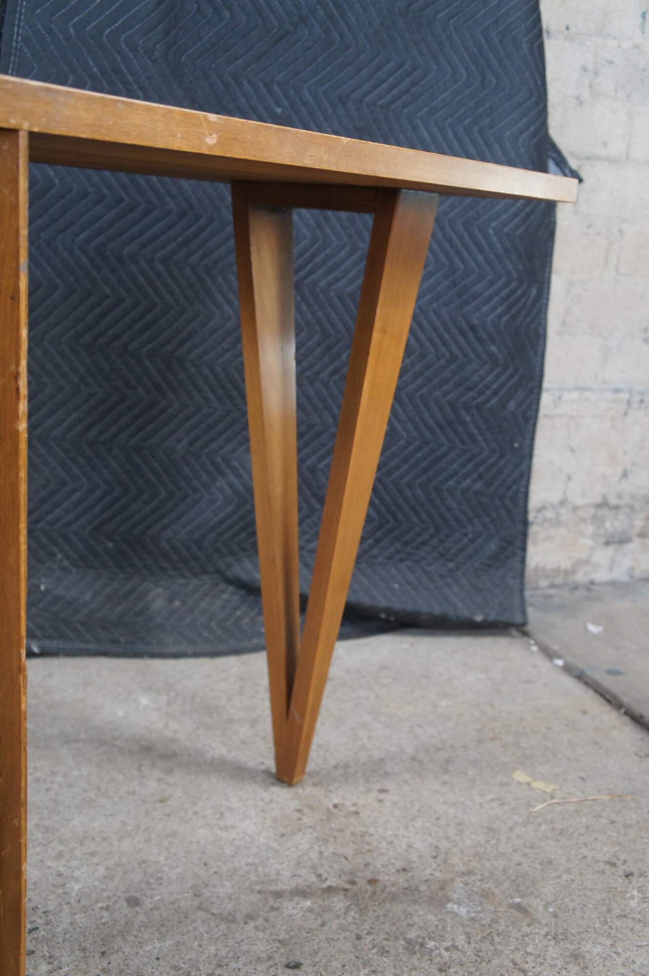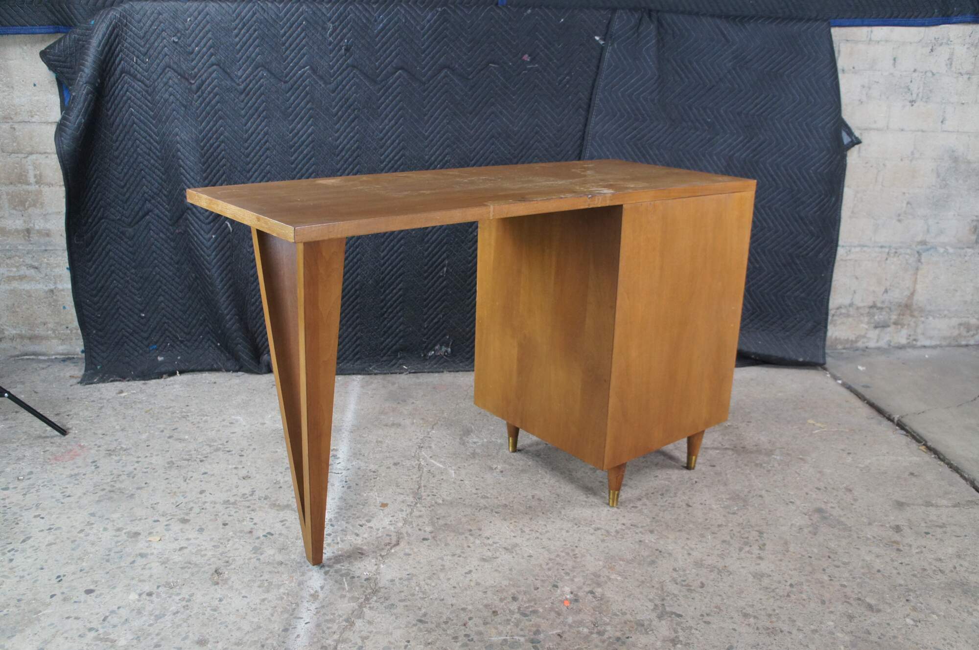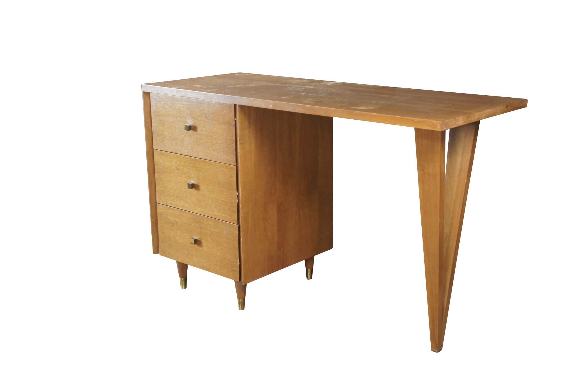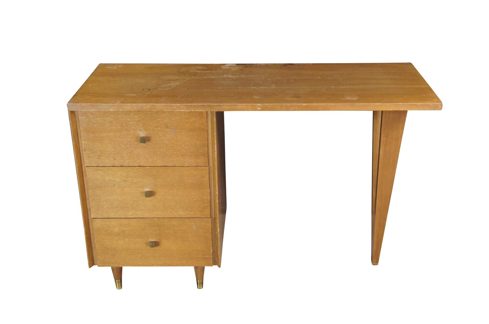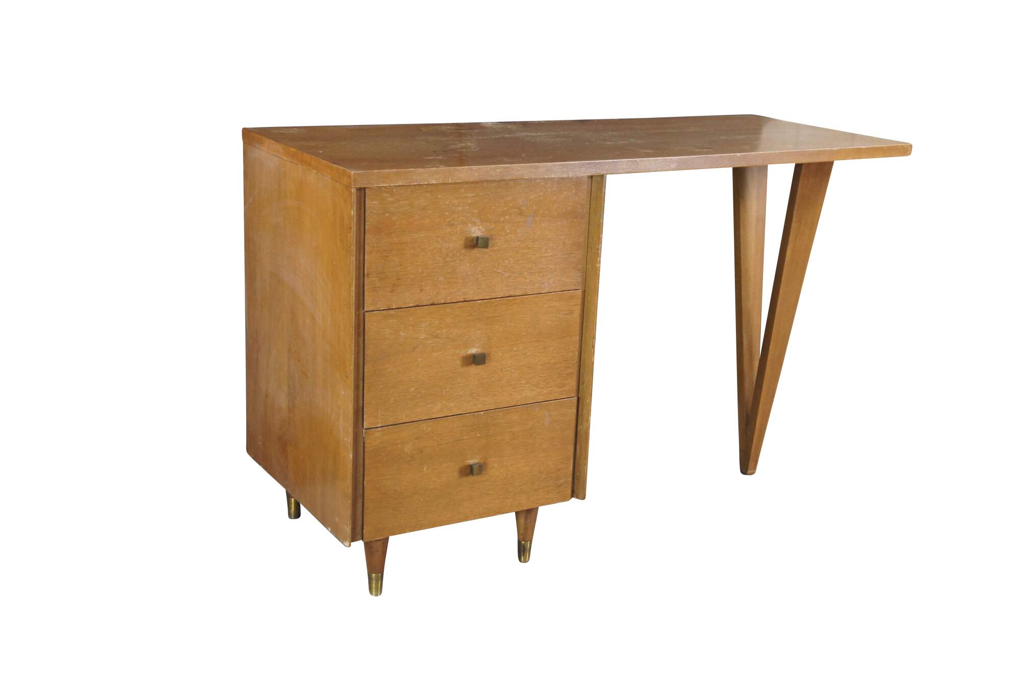 John Stuart Hairpin Desk, circa 1960s. Features a minimalist open form with plank top set between three dovetailed oak drawers set on turned and tapered legs with brass feet and a hairpin leg along the outside.