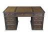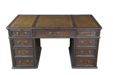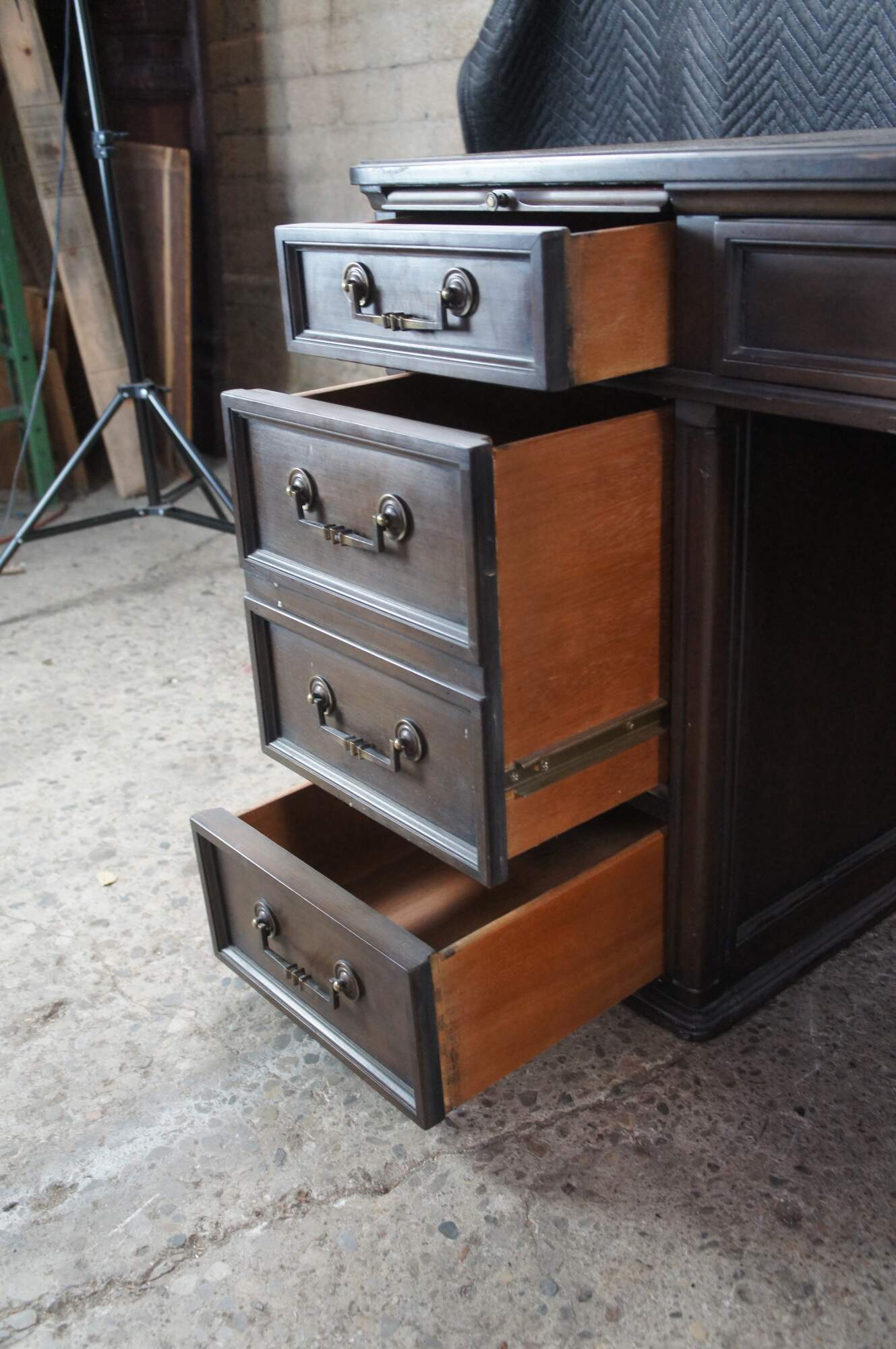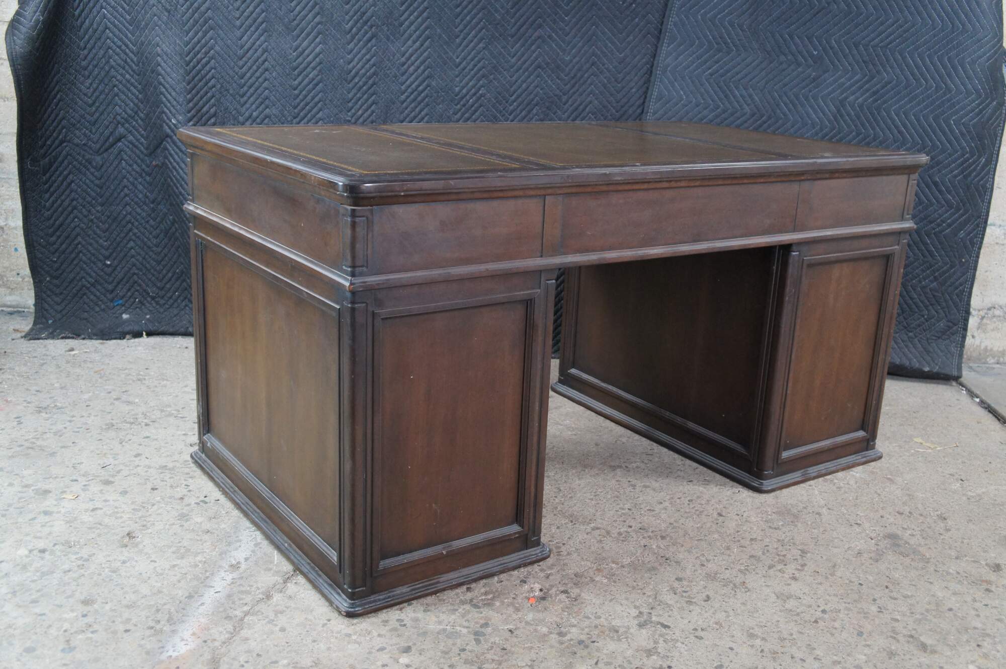 Vintage Sligh Office Desk. Features a distressed walnut finish with a green tooled leather top. The desk has eight dovetailed drawers including one filed drawer along the left. Manufactured in Holland Michigan.