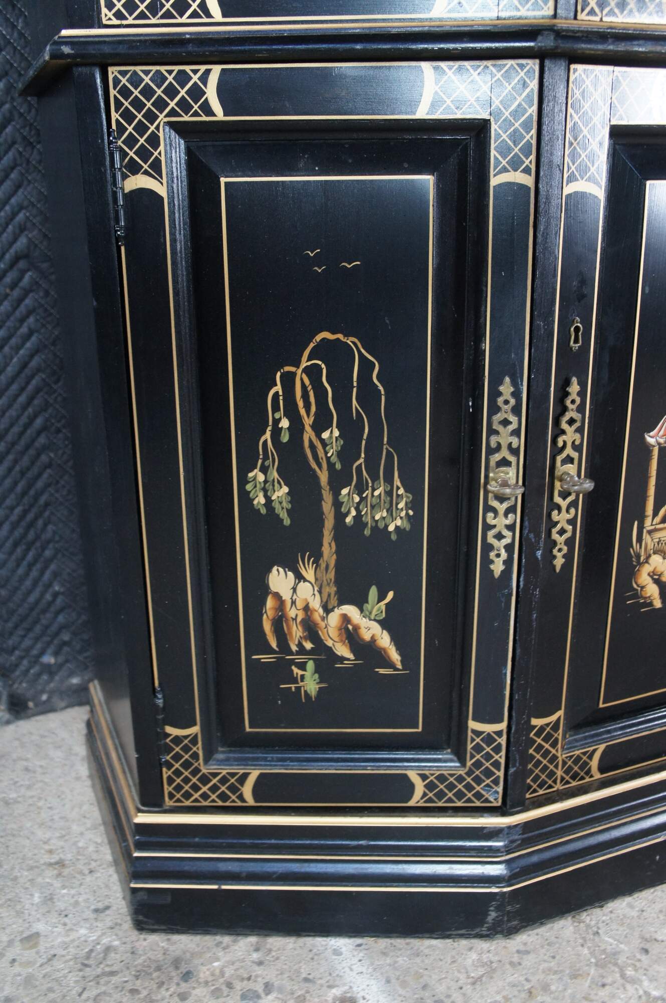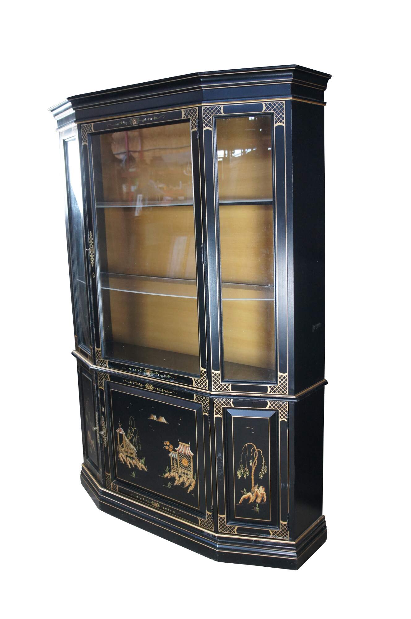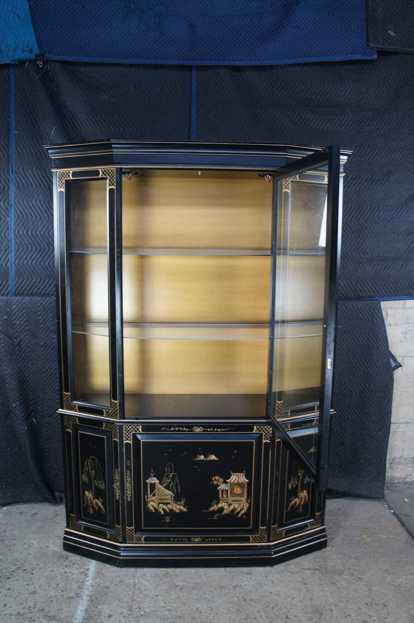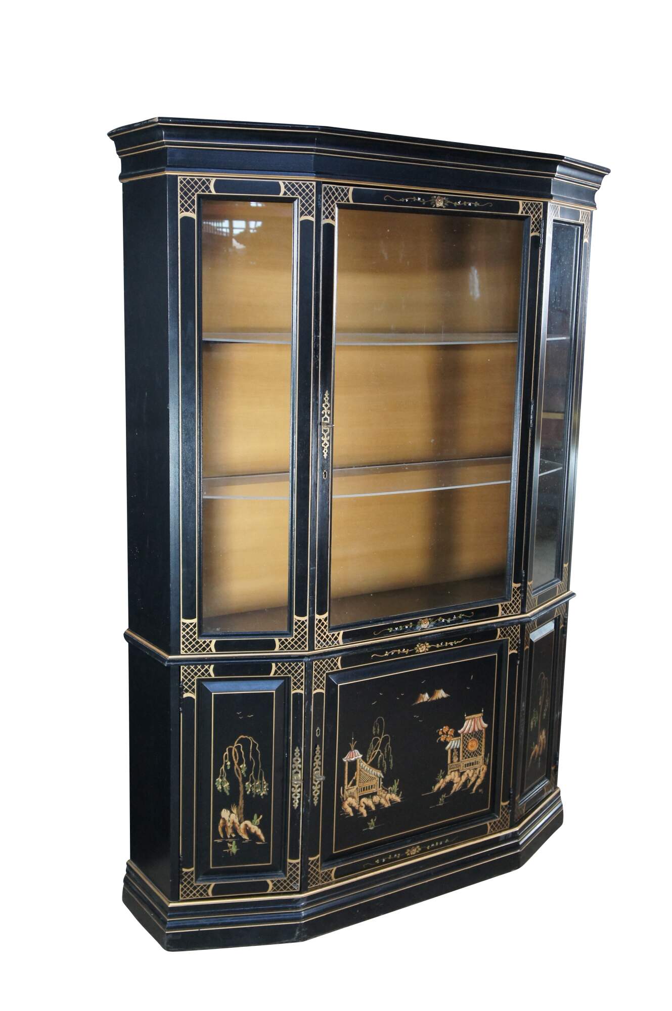 Late 20th Century Chinoiserie Display Cabinet, By Jasper Cabinet Company of Jasper Indiana. Features and black and gold finish with traditional oriental motifs. The cabinet has an upper display section with two shelves over a pagoda landscape decorated base. The base has three cabinets for accessory storage.