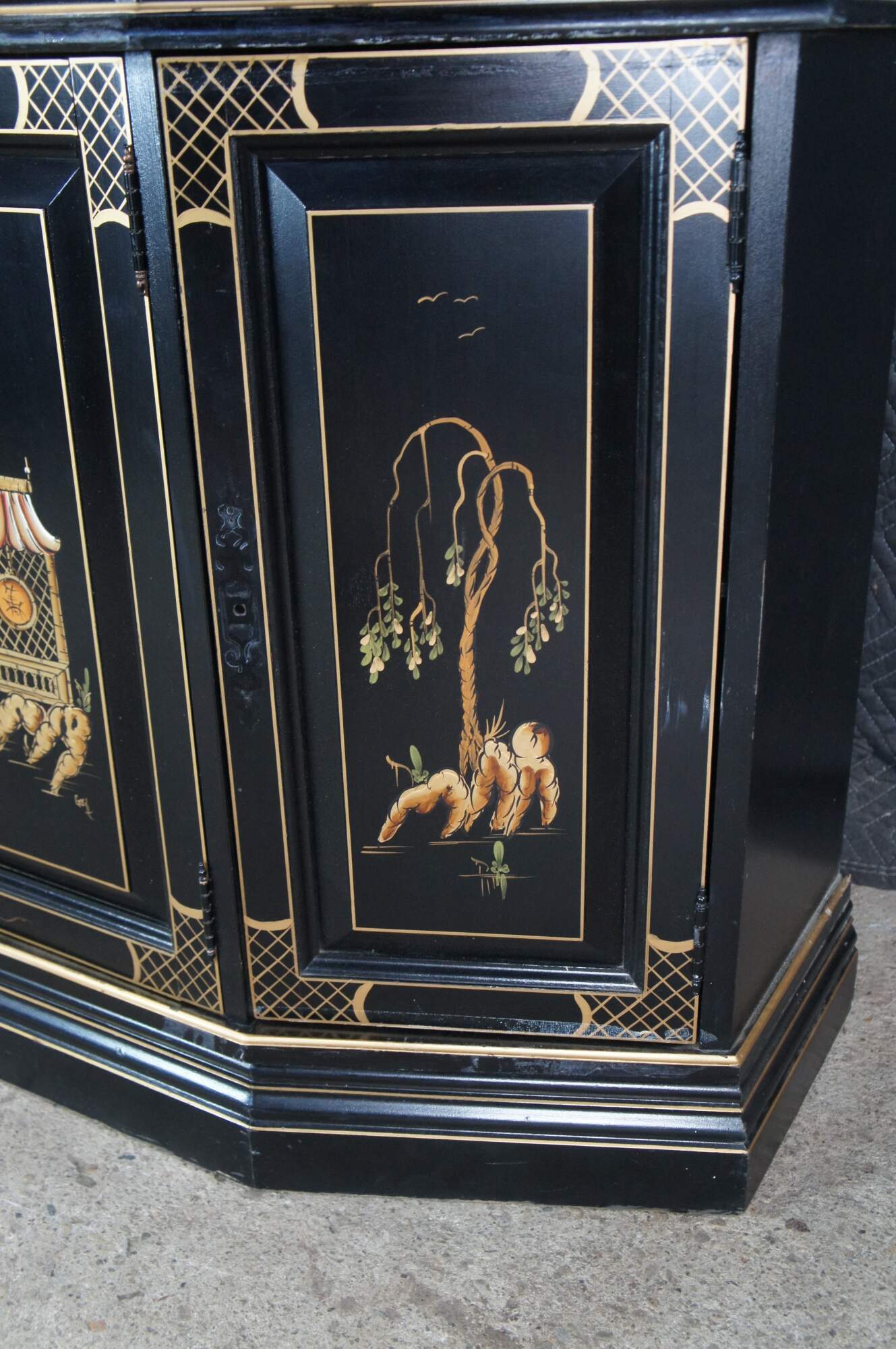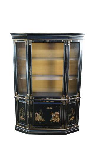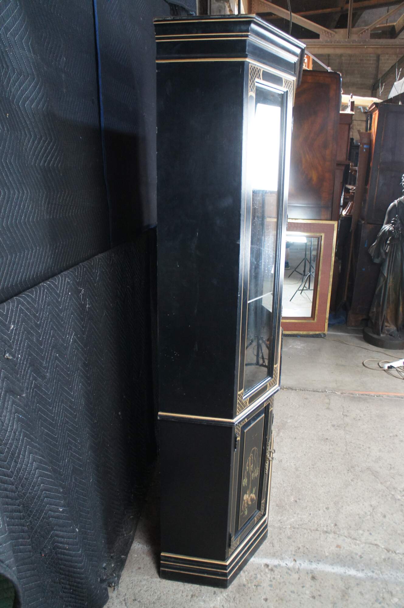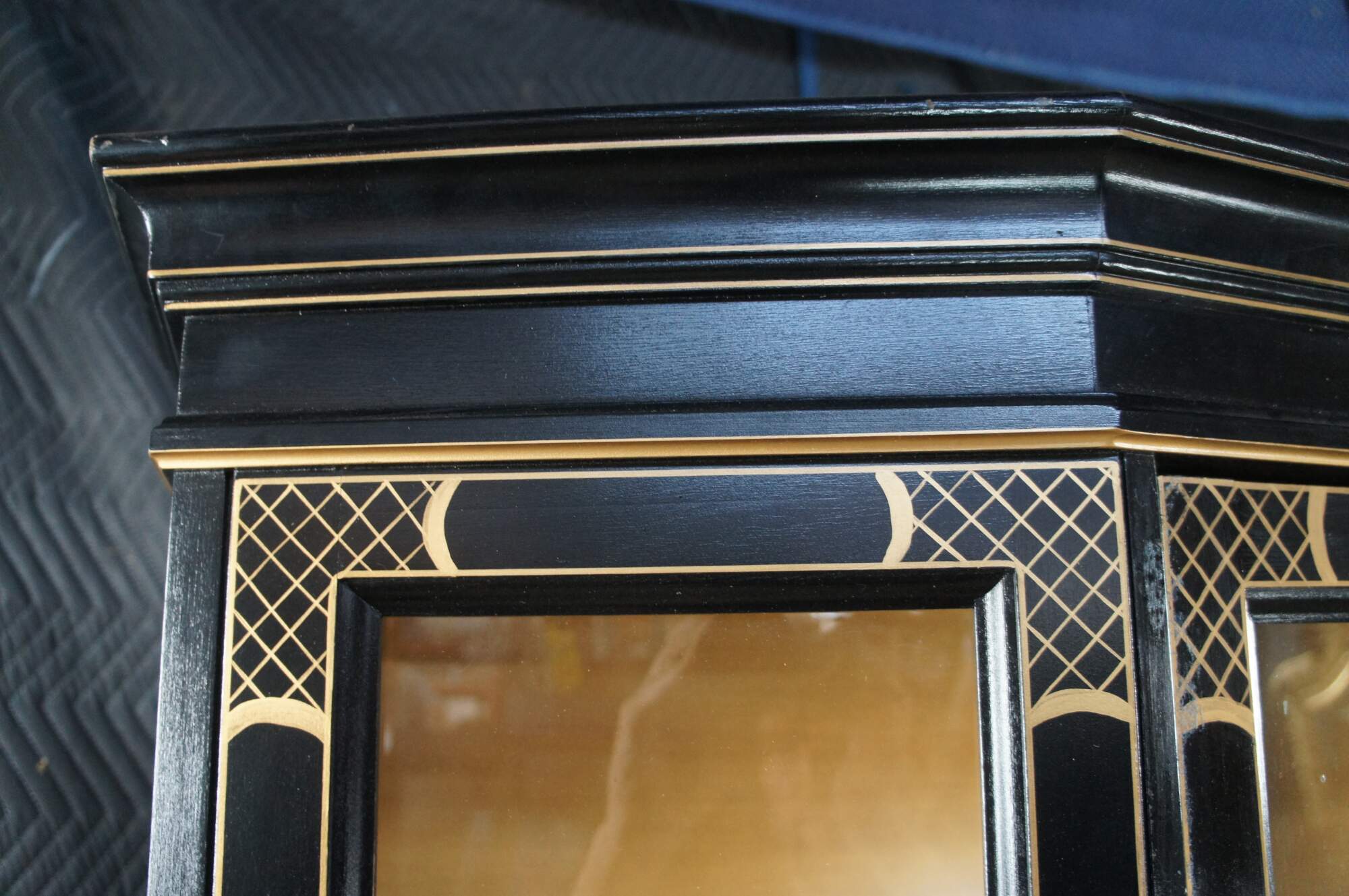 Late 20th Century Chinoiserie Display Cabinet, By Jasper Cabinet Company of Jasper Indiana. Features and black and gold finish with traditional oriental motifs. The cabinet has an upper display section with two shelves over a pagoda landscape decorated base. The base has three cabinets for accessory storage.