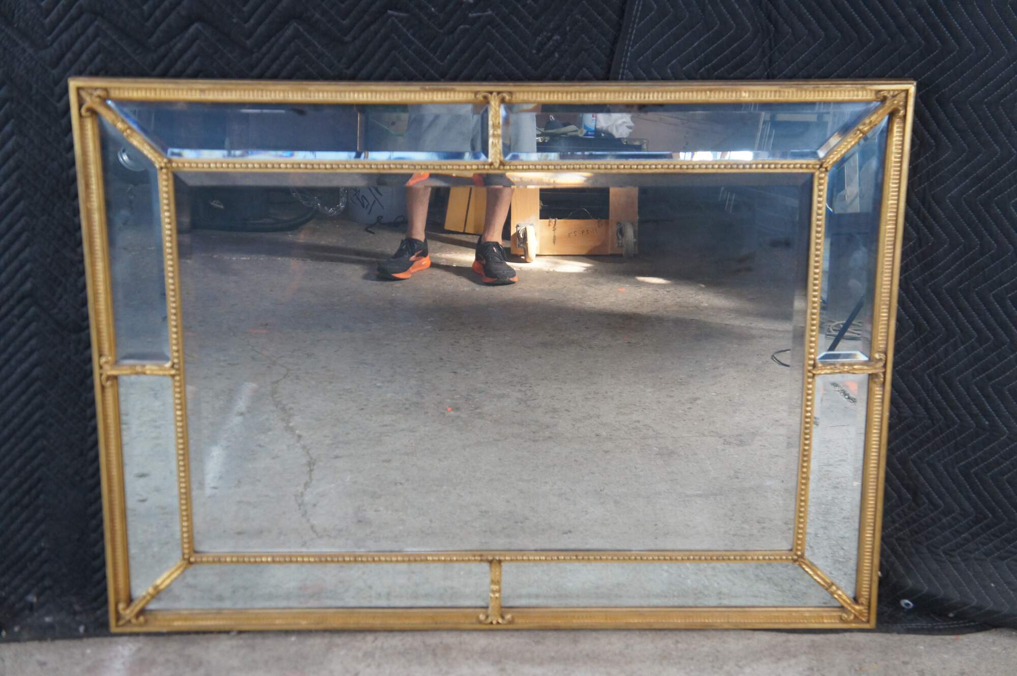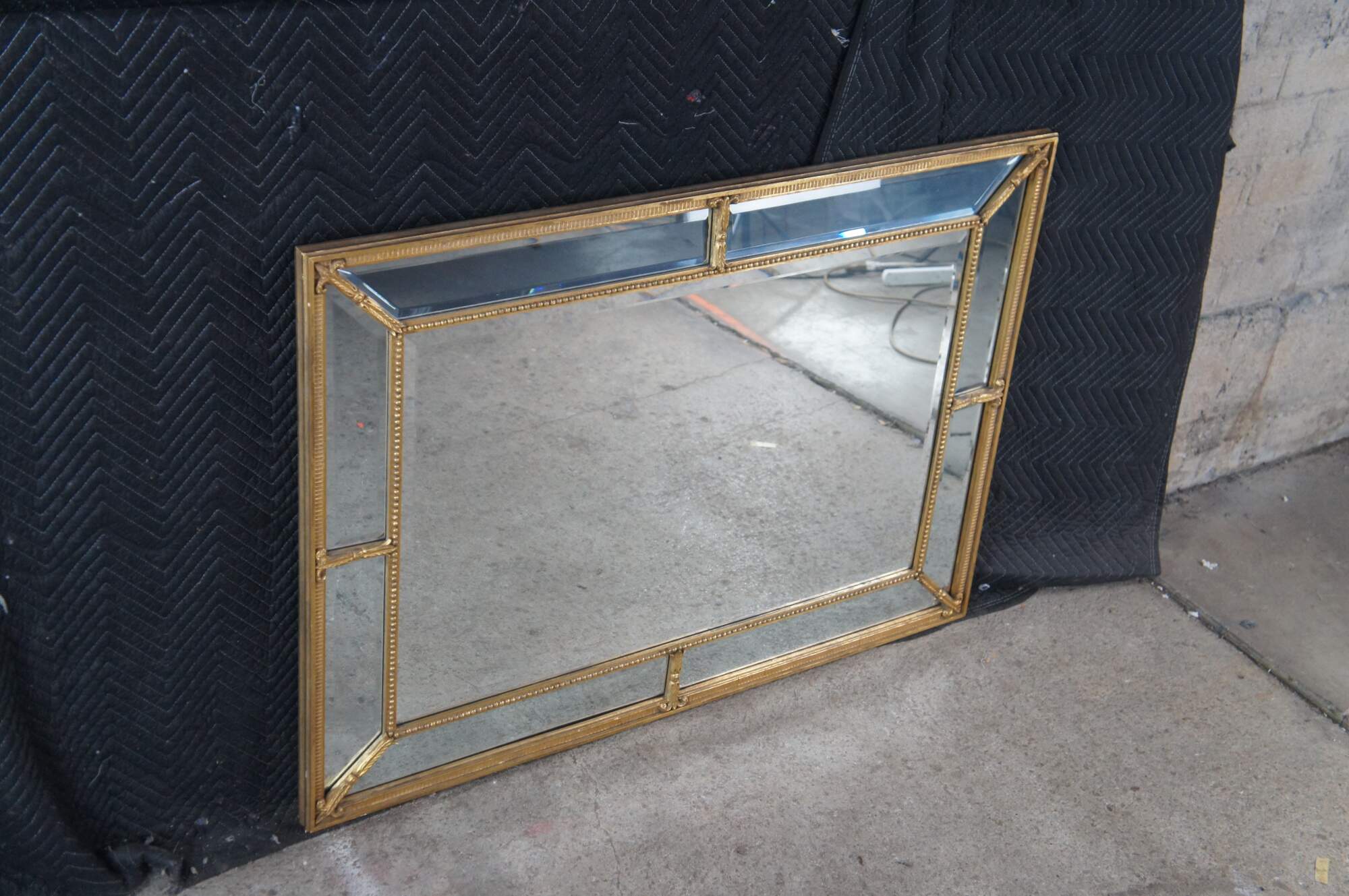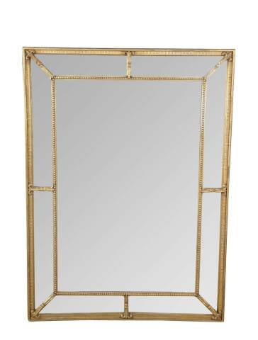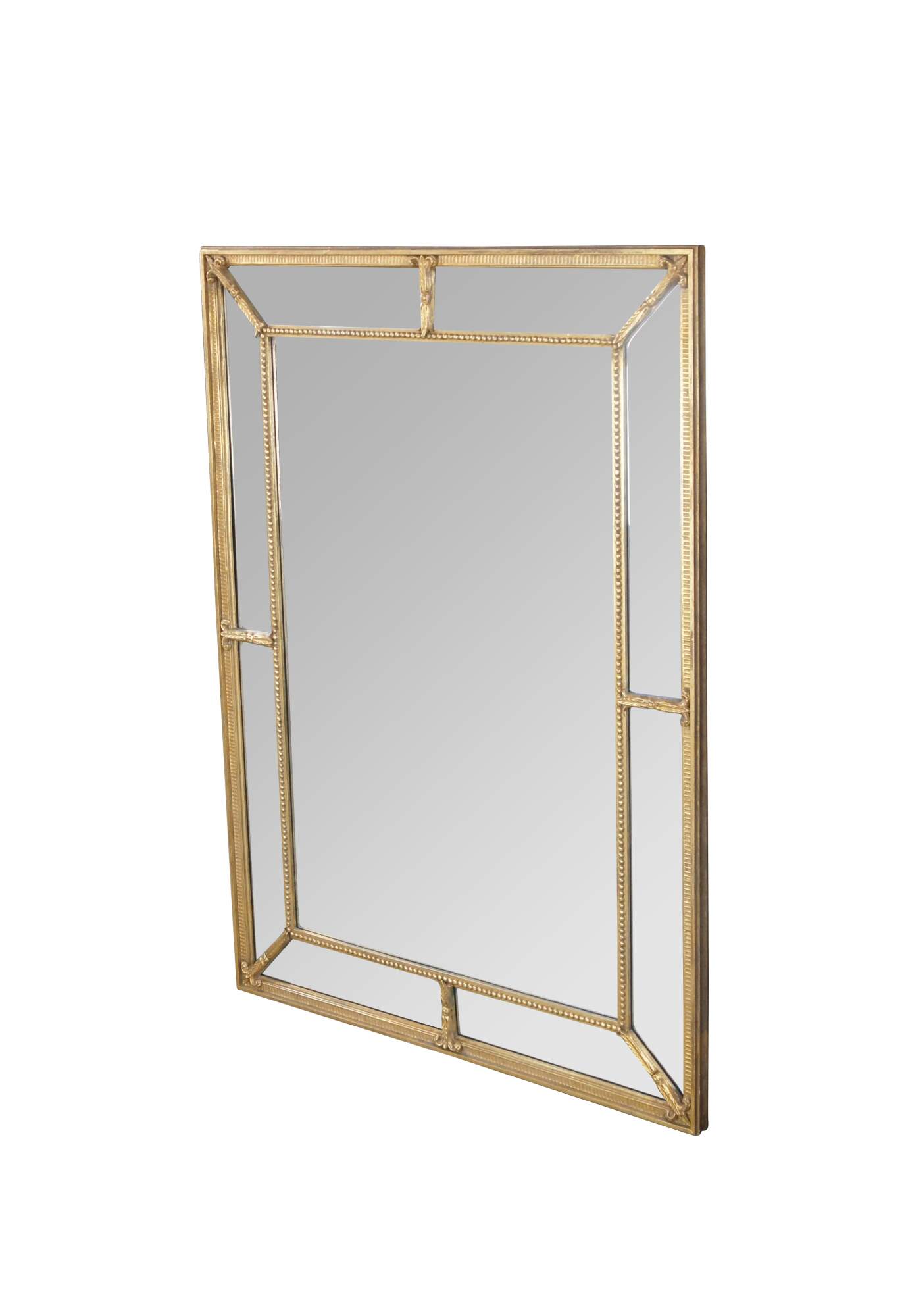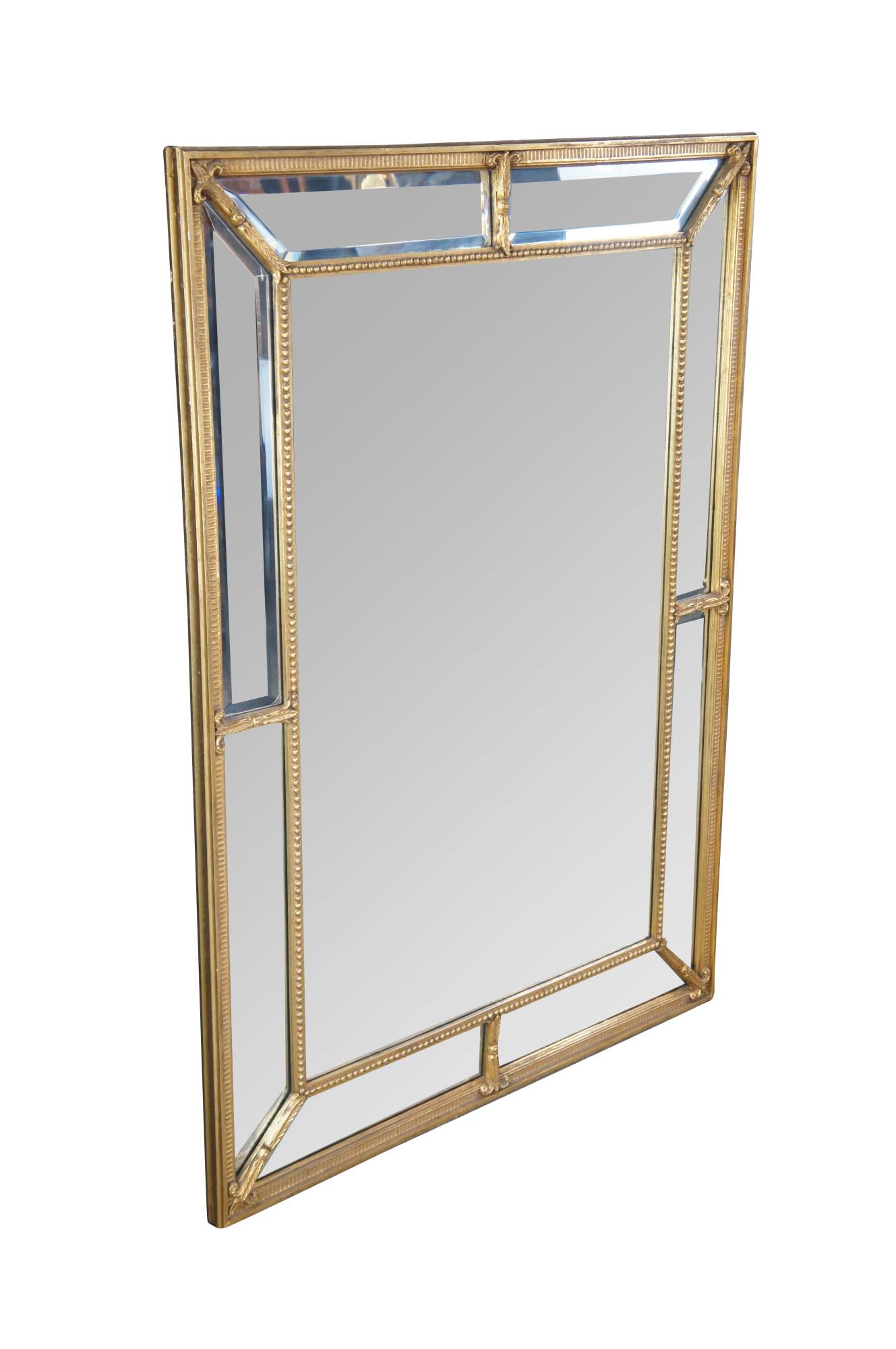20th Century English Regency Style Giltwood Mirror by Decorative Arts Inc, New York. Circa 1970s. Features a divided framed with beveled glass set between beaded trim with fleur and acanthus detail. Makers mark along back side.