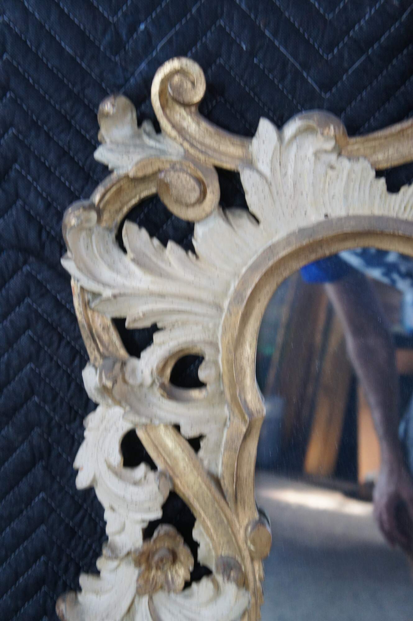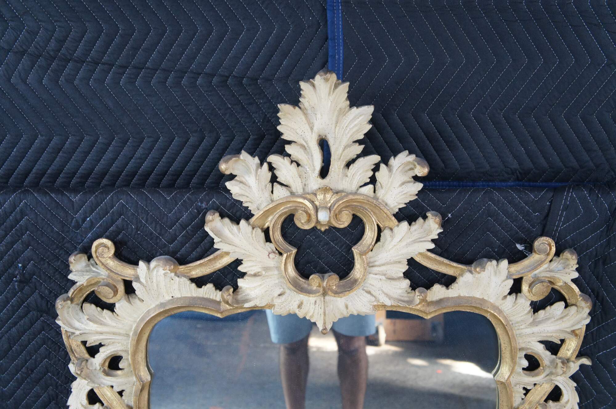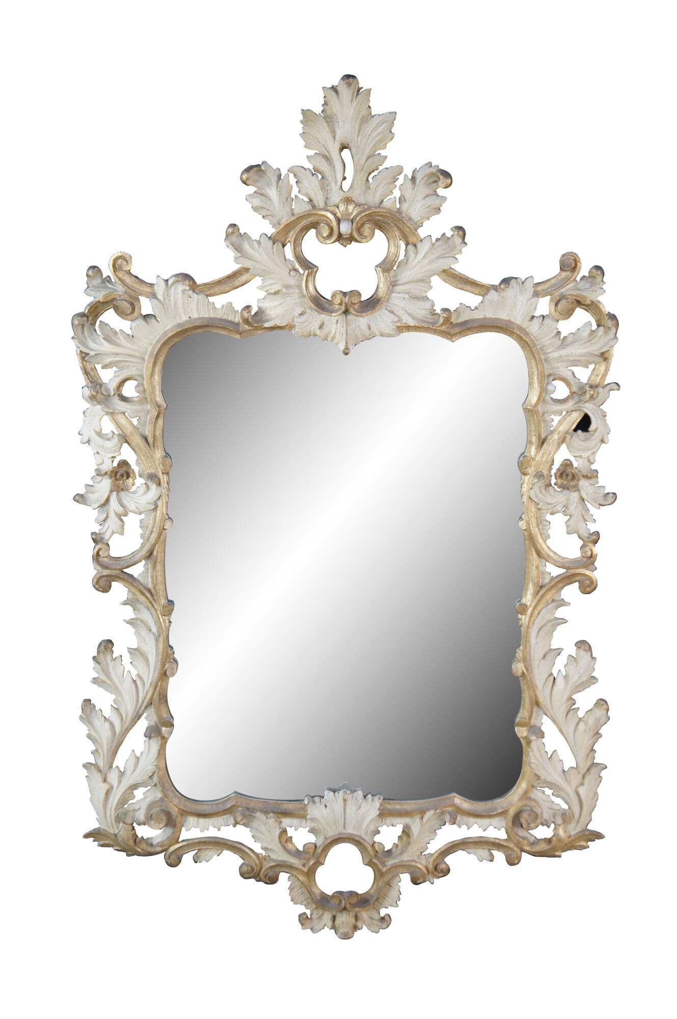 A large and impressive Italian Baroque Mirror. Features beautiful flowing acanthus leaf foliate detail. Features a two tone gold finish. Marked made in Italy along the backside. The perfect addition to any space.