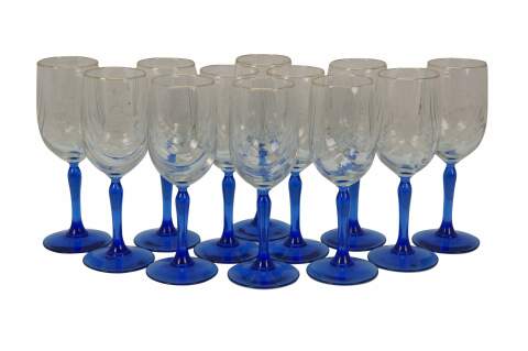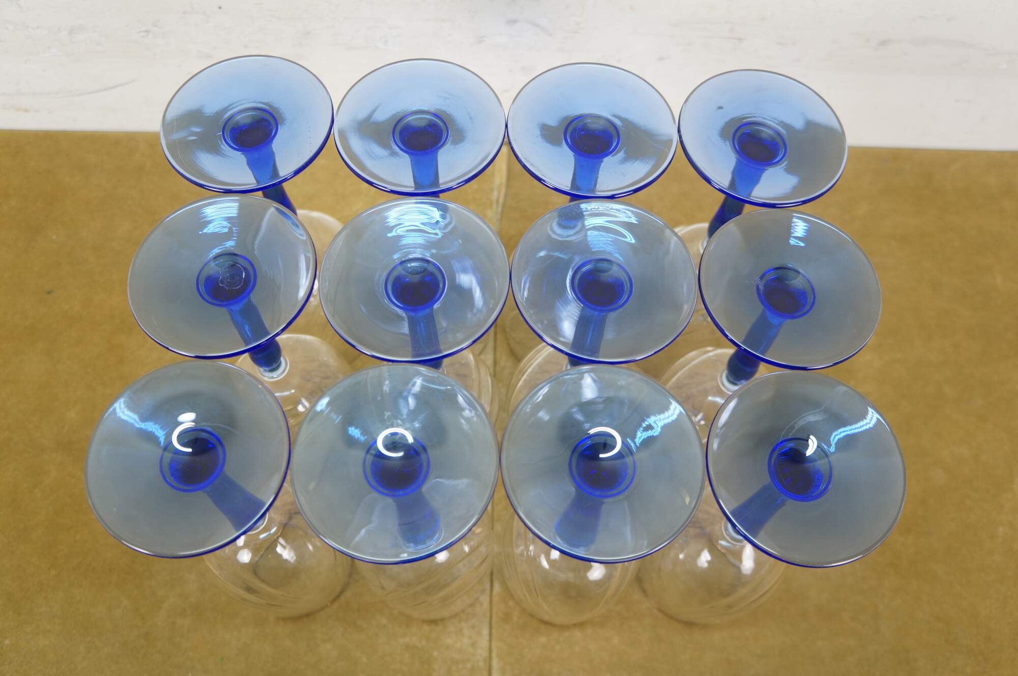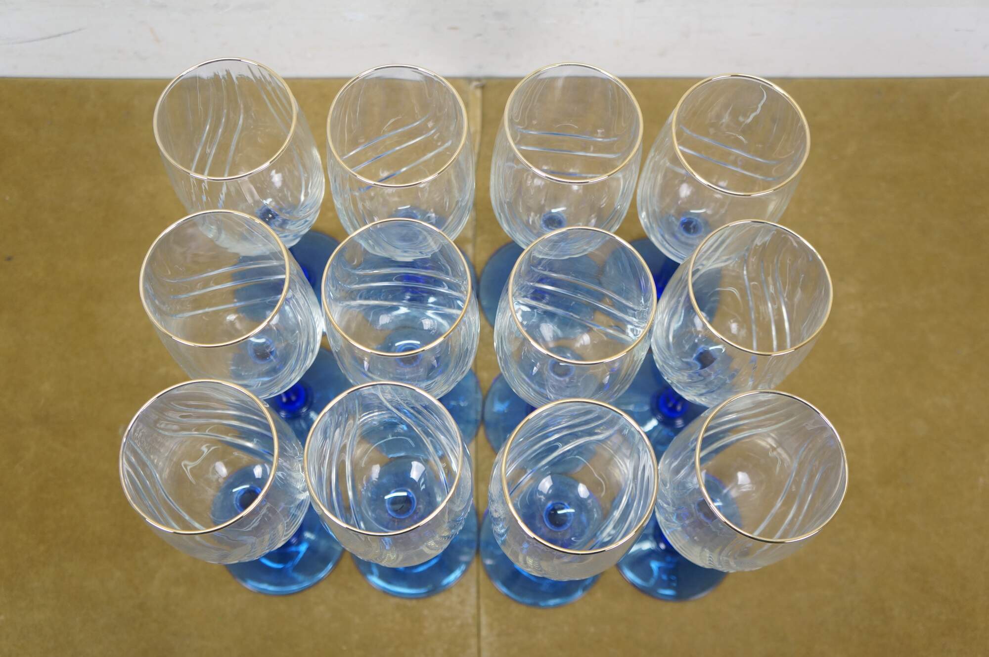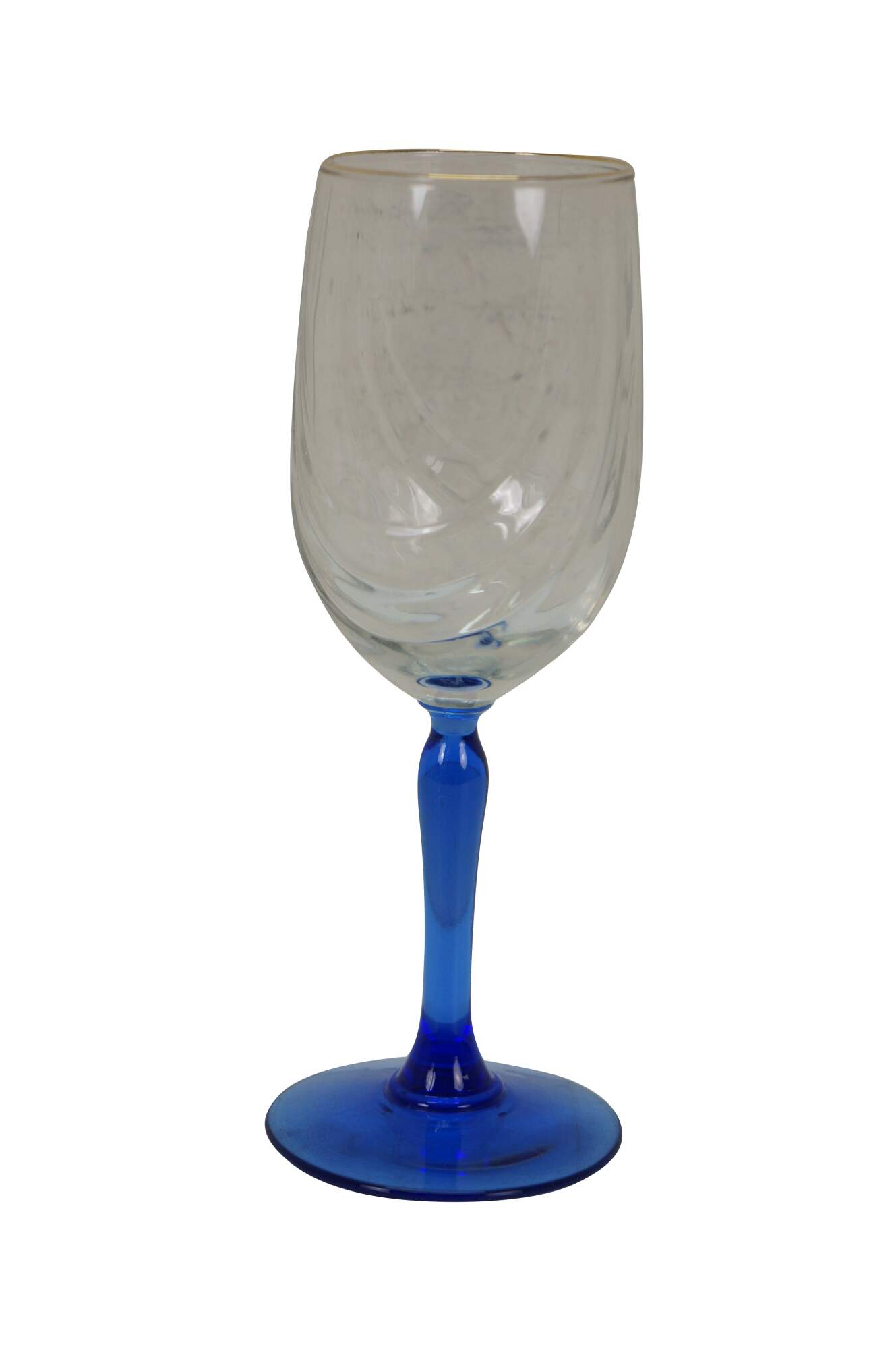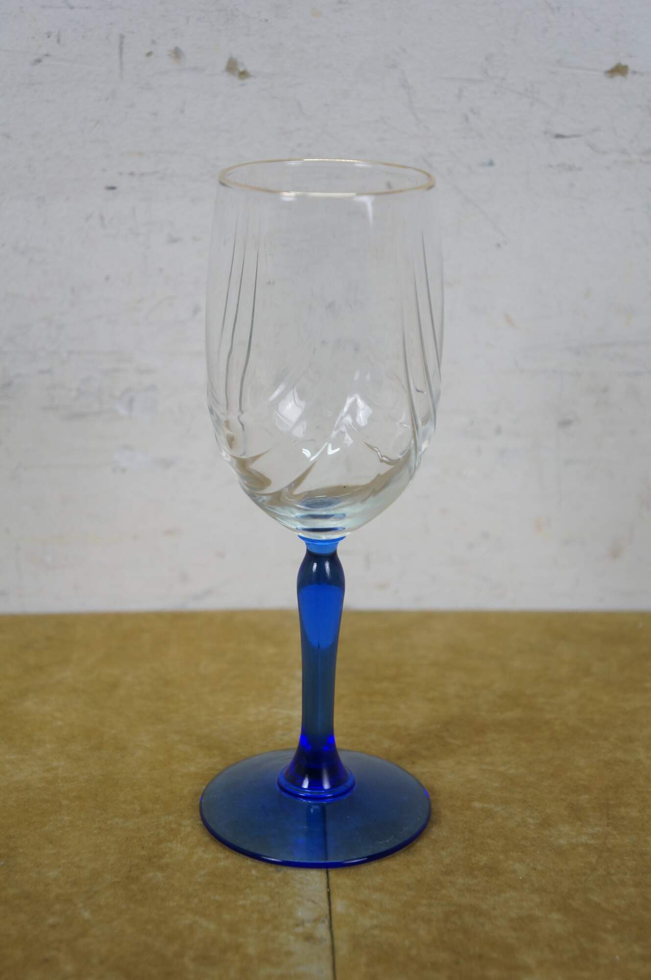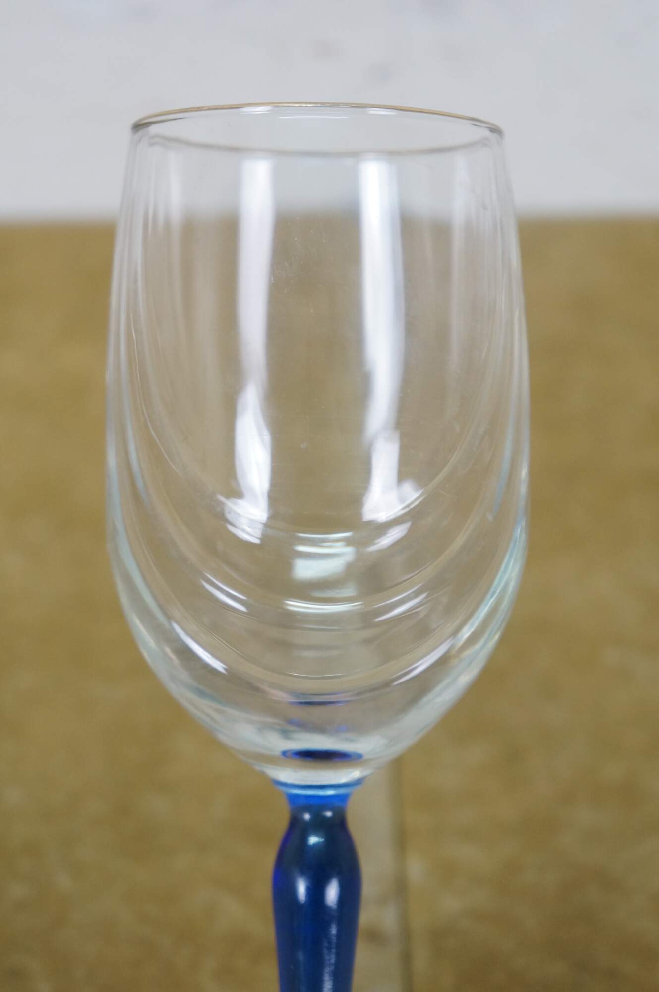 Set of 12 late 20th century Lenox Swag Drape crystal wine glasses featuring cobalt blue stems, clear bowls with swirled accents and gilt rim.