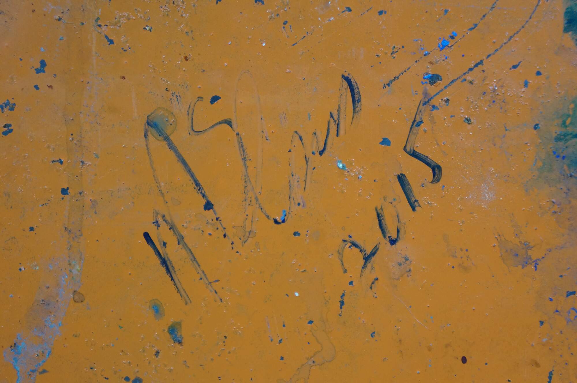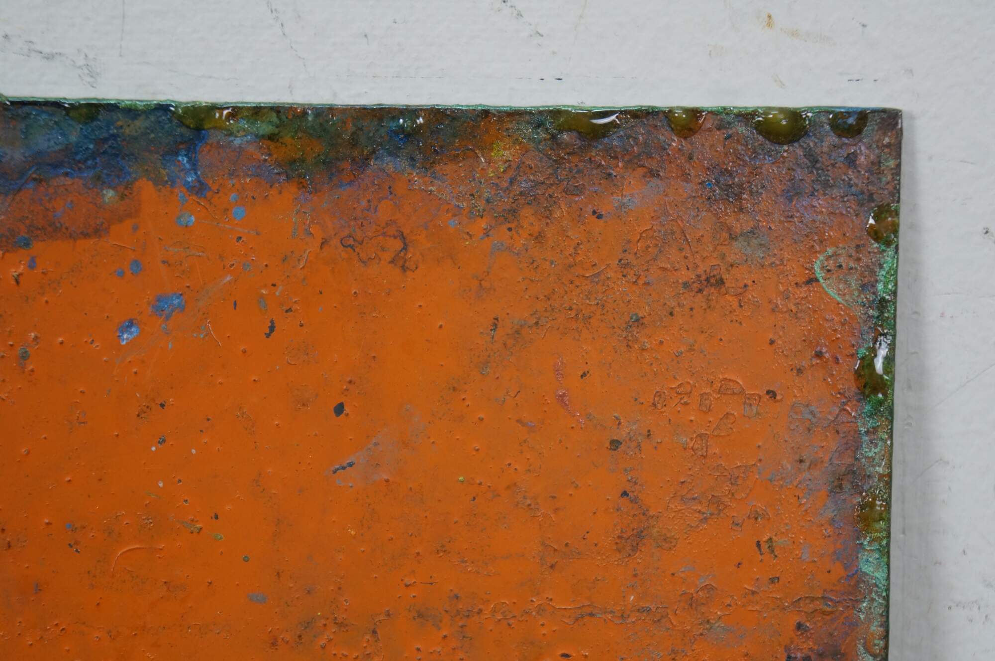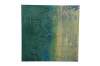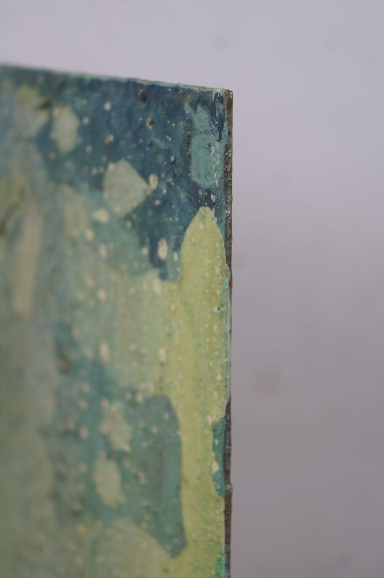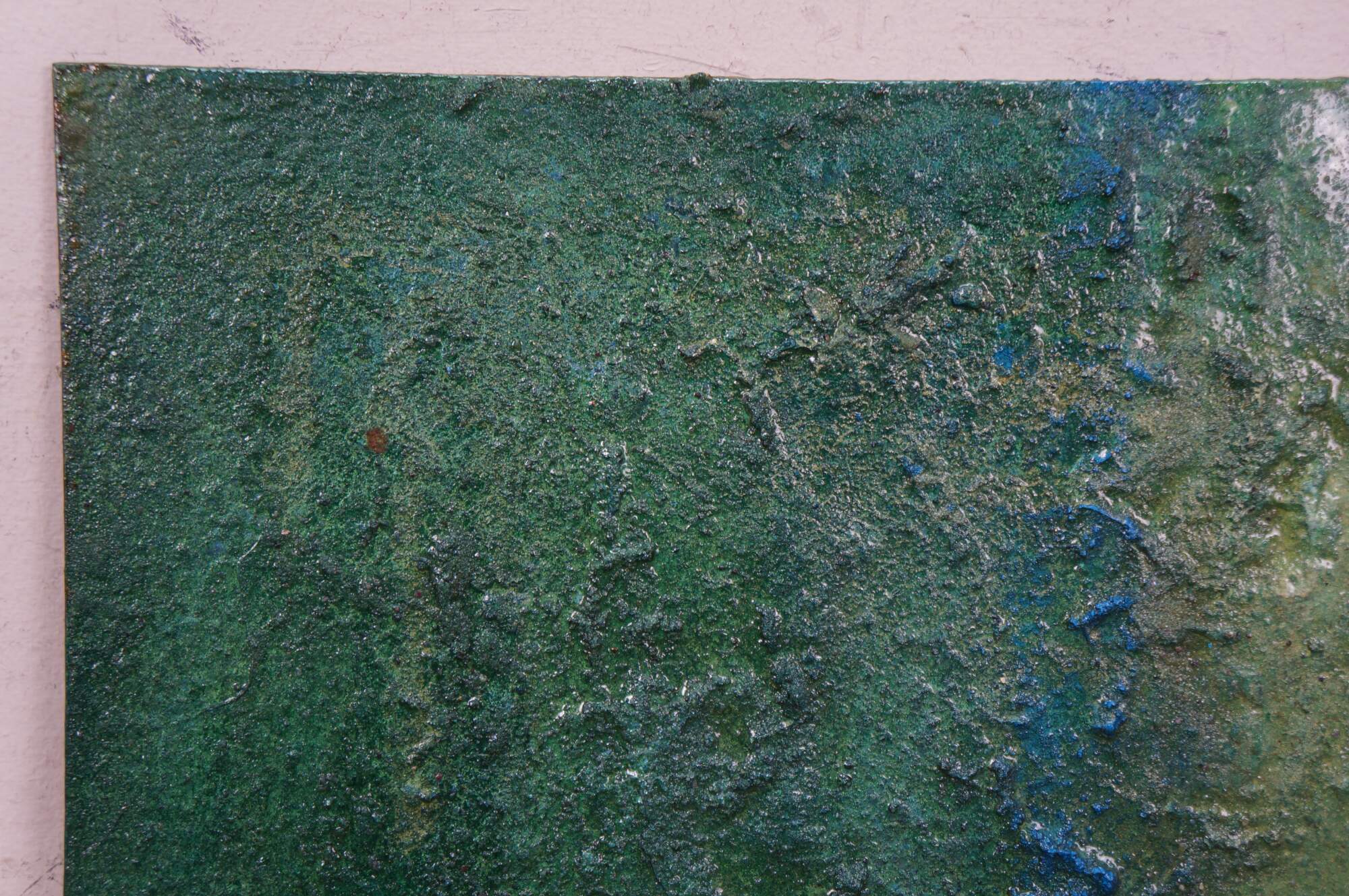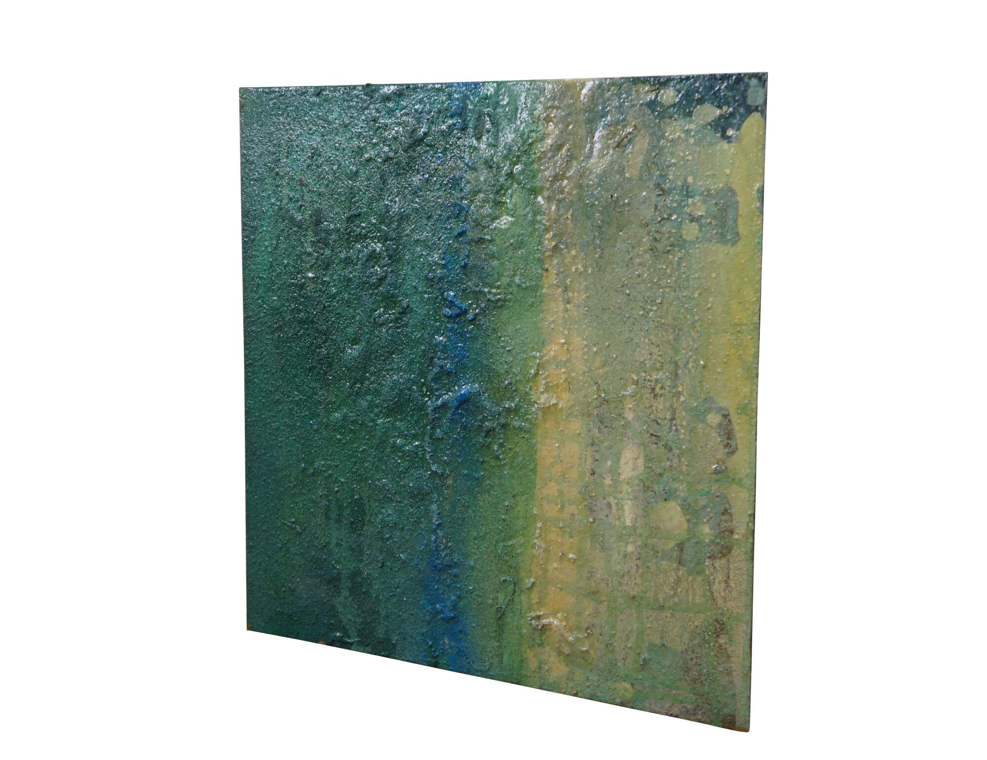 2015 modern abstract mixed media wall art - green, blue and yellow textured enameled paint on metal panel by artist Mike Elsass.