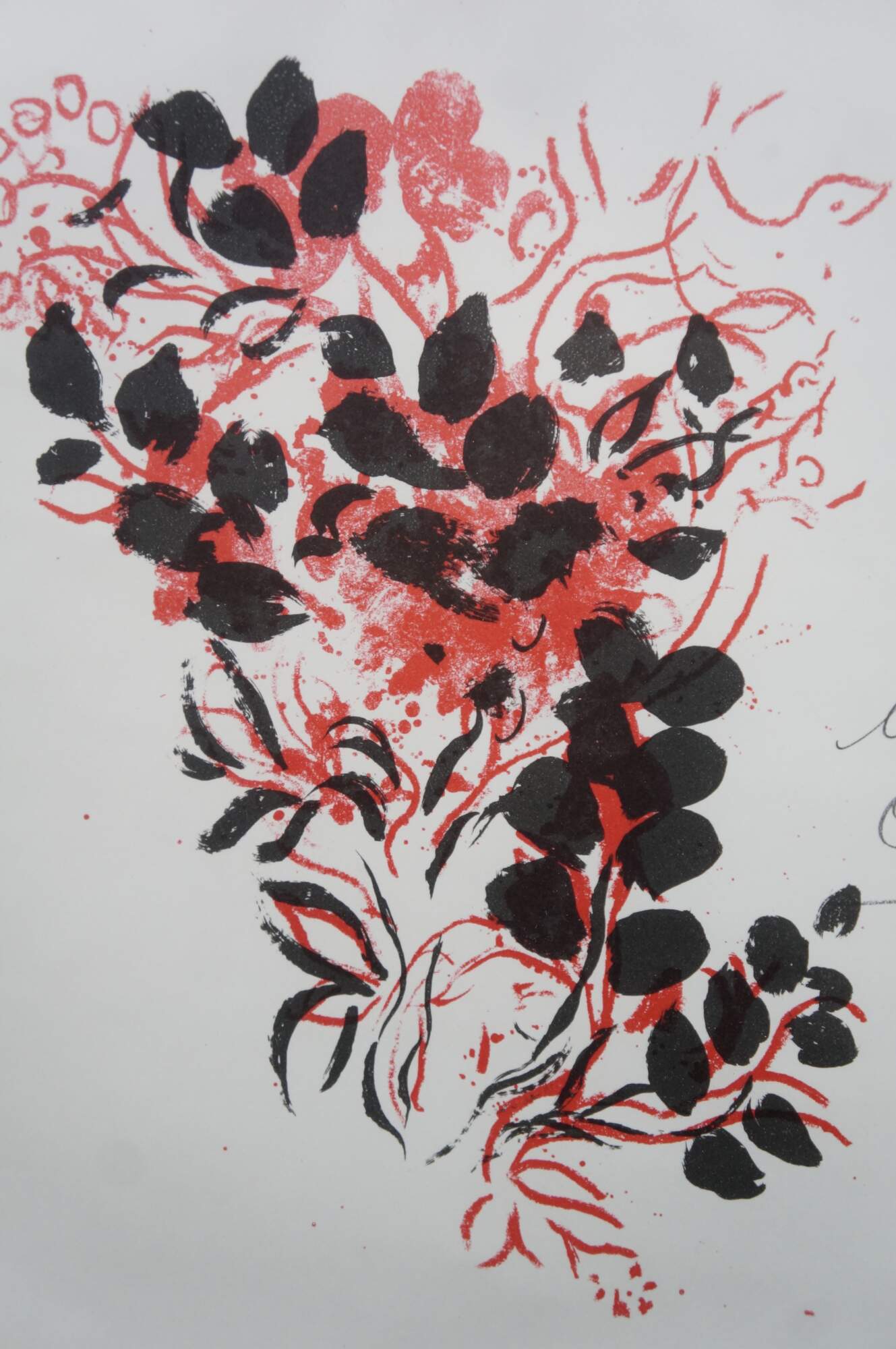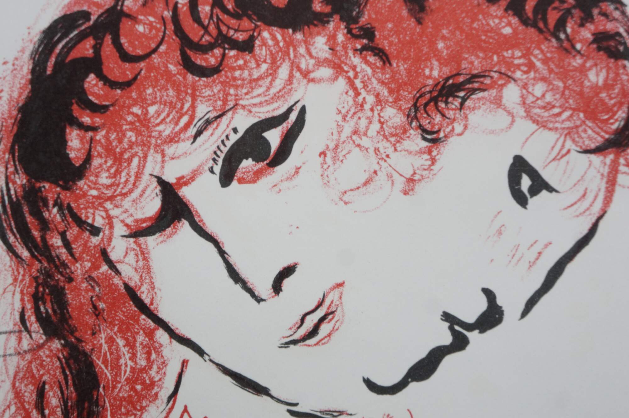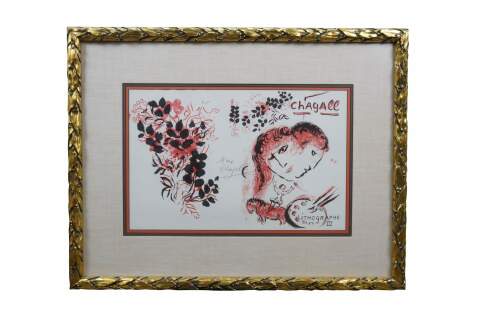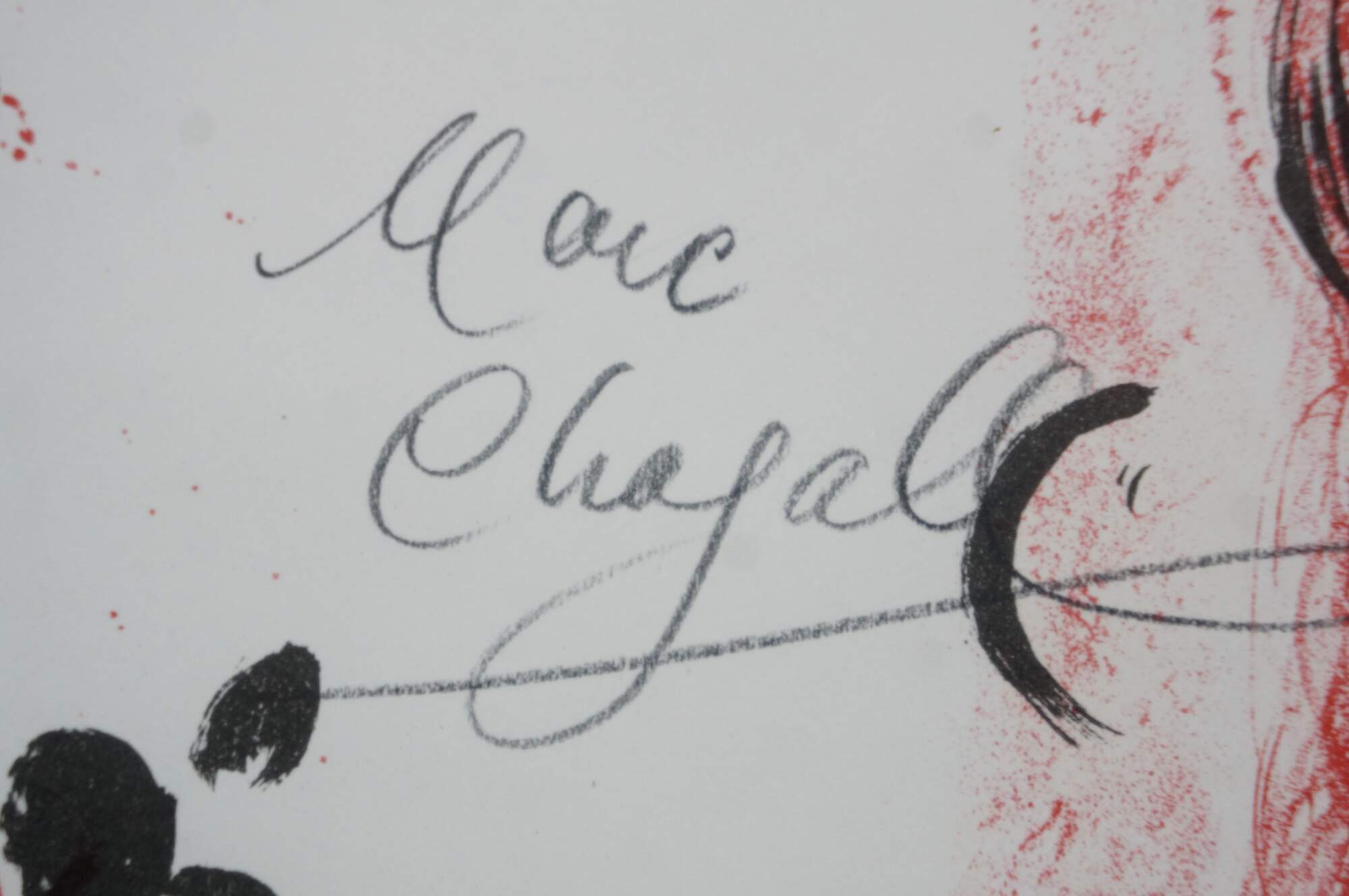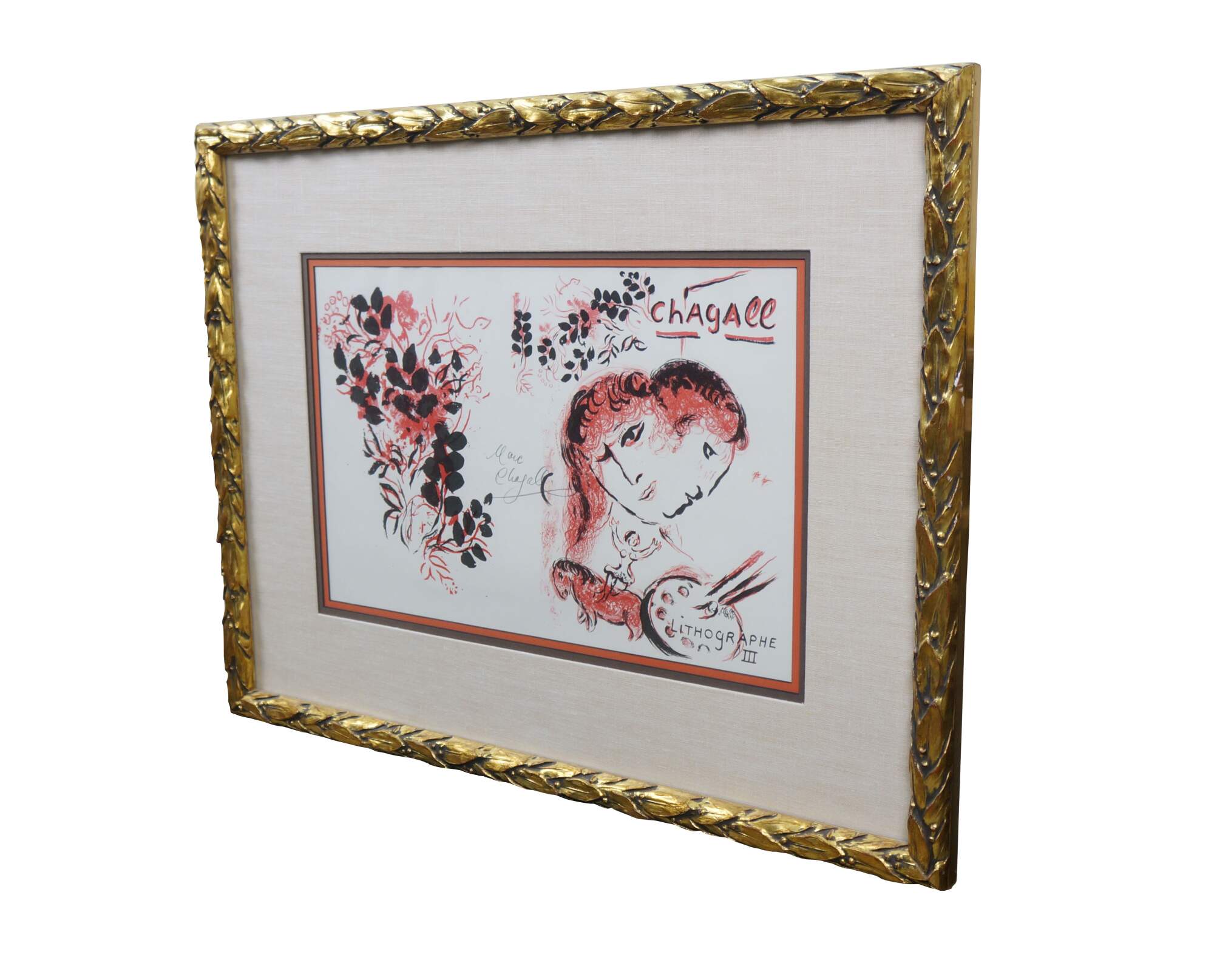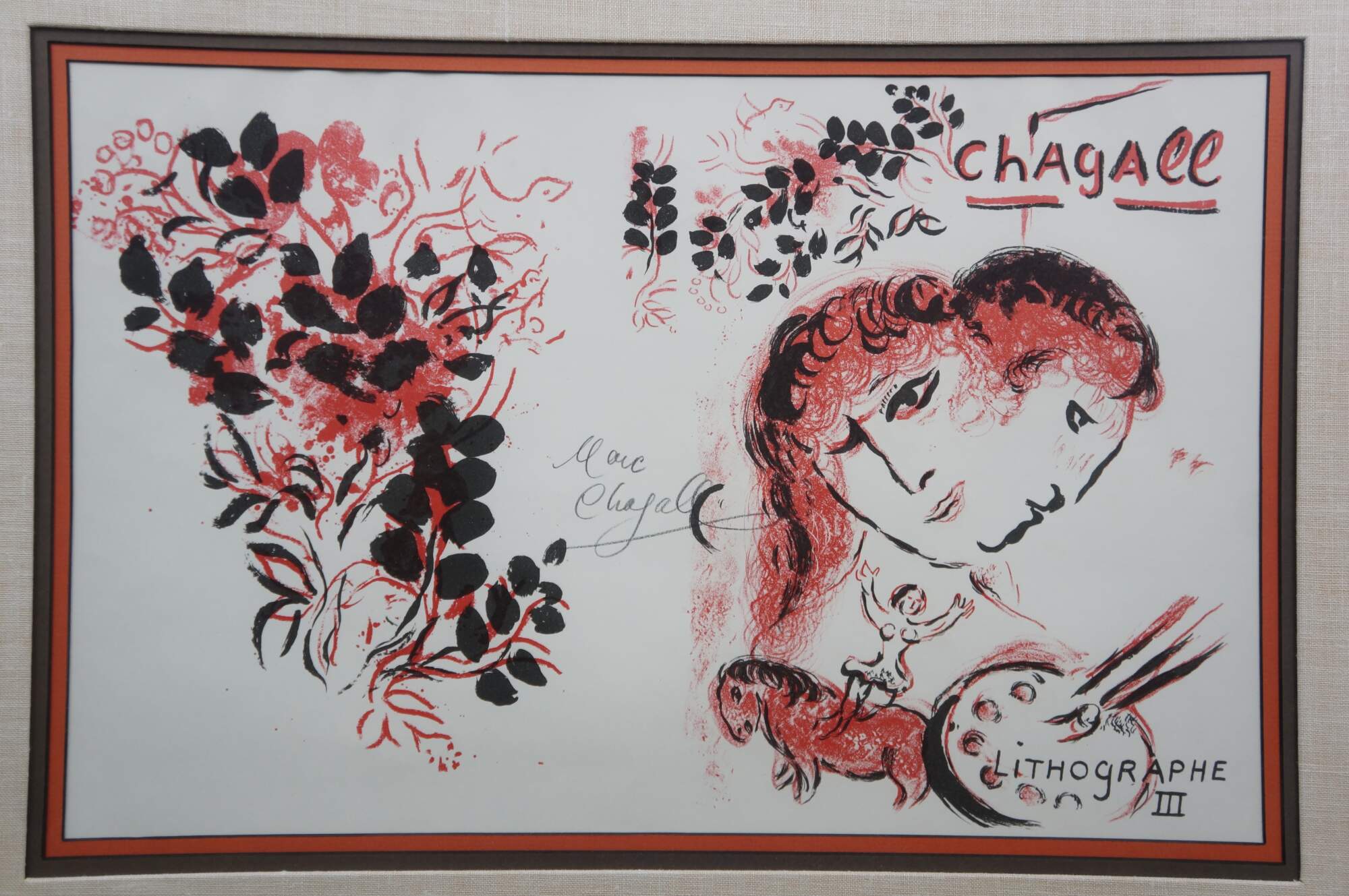 Rare 1980 pencil signed poster print titled "Lithograph III" by Marc Chagall. Cover design for the third in a six volume series of books devoted to Chagall's lithographs. composite frame Includes Certificate of Authenticity.