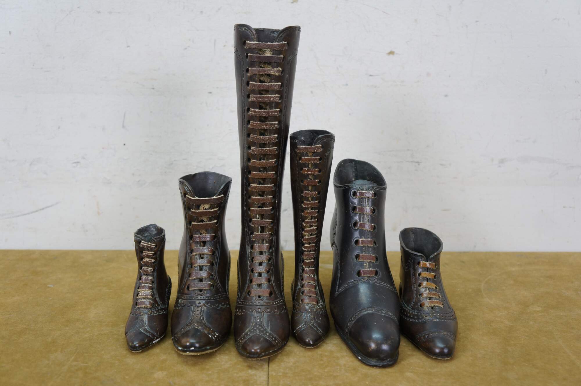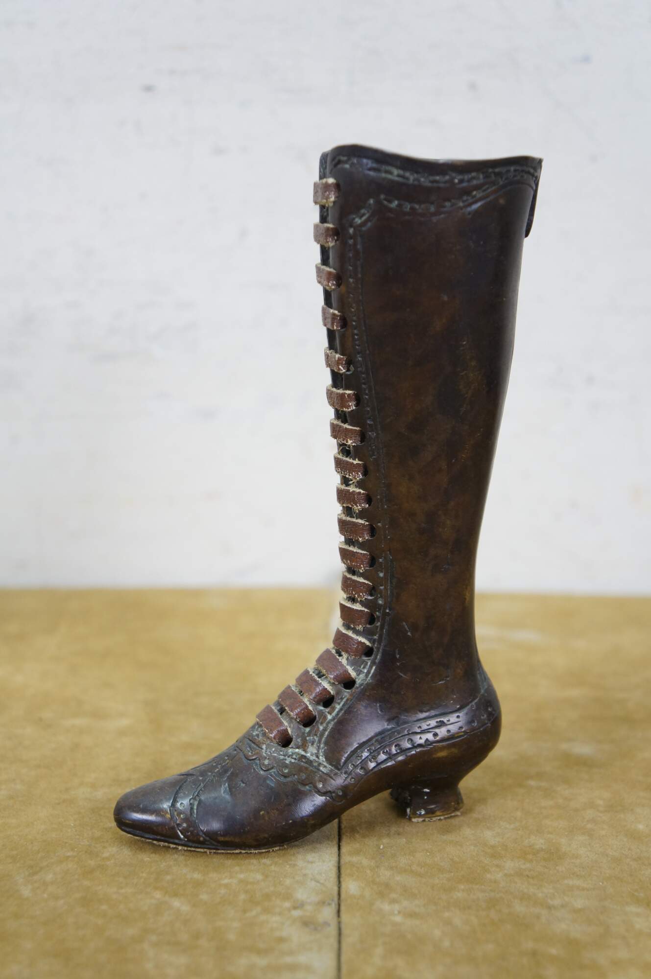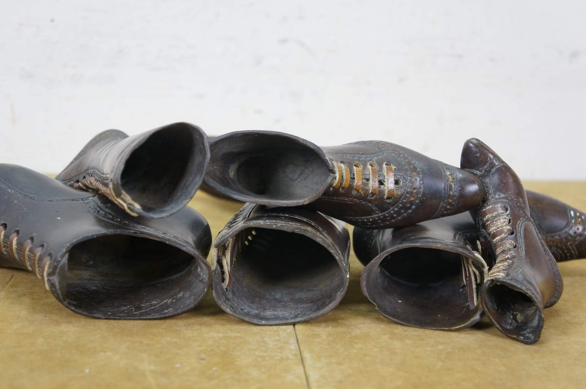 Set of six late 20th century Theodore Alexander bronze figurines in the shape of Victorian boots in a variety of heights and styles. Leather laces and pads on the soles.