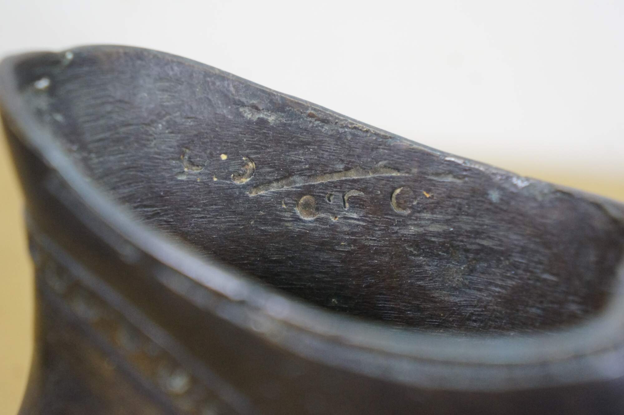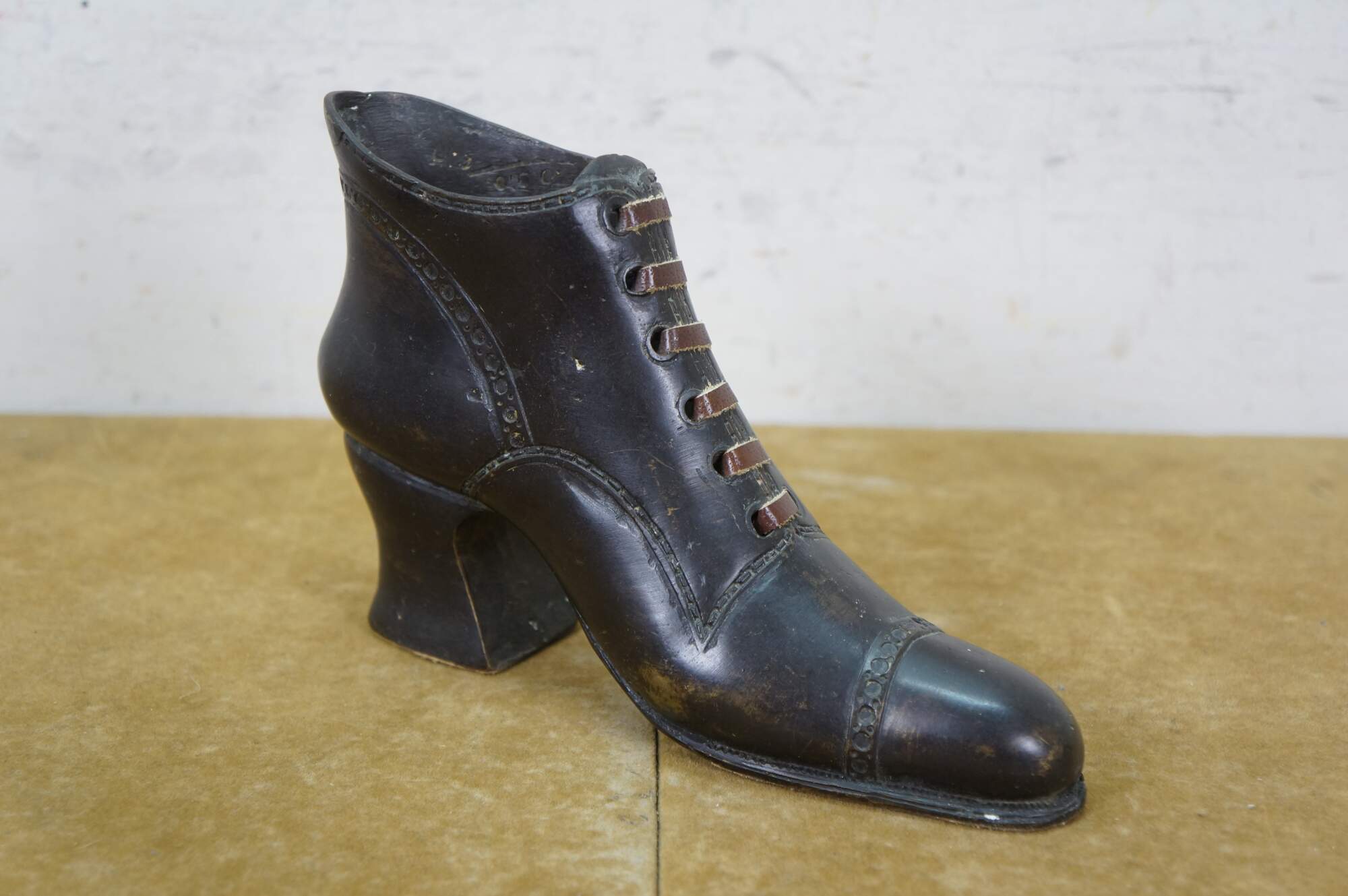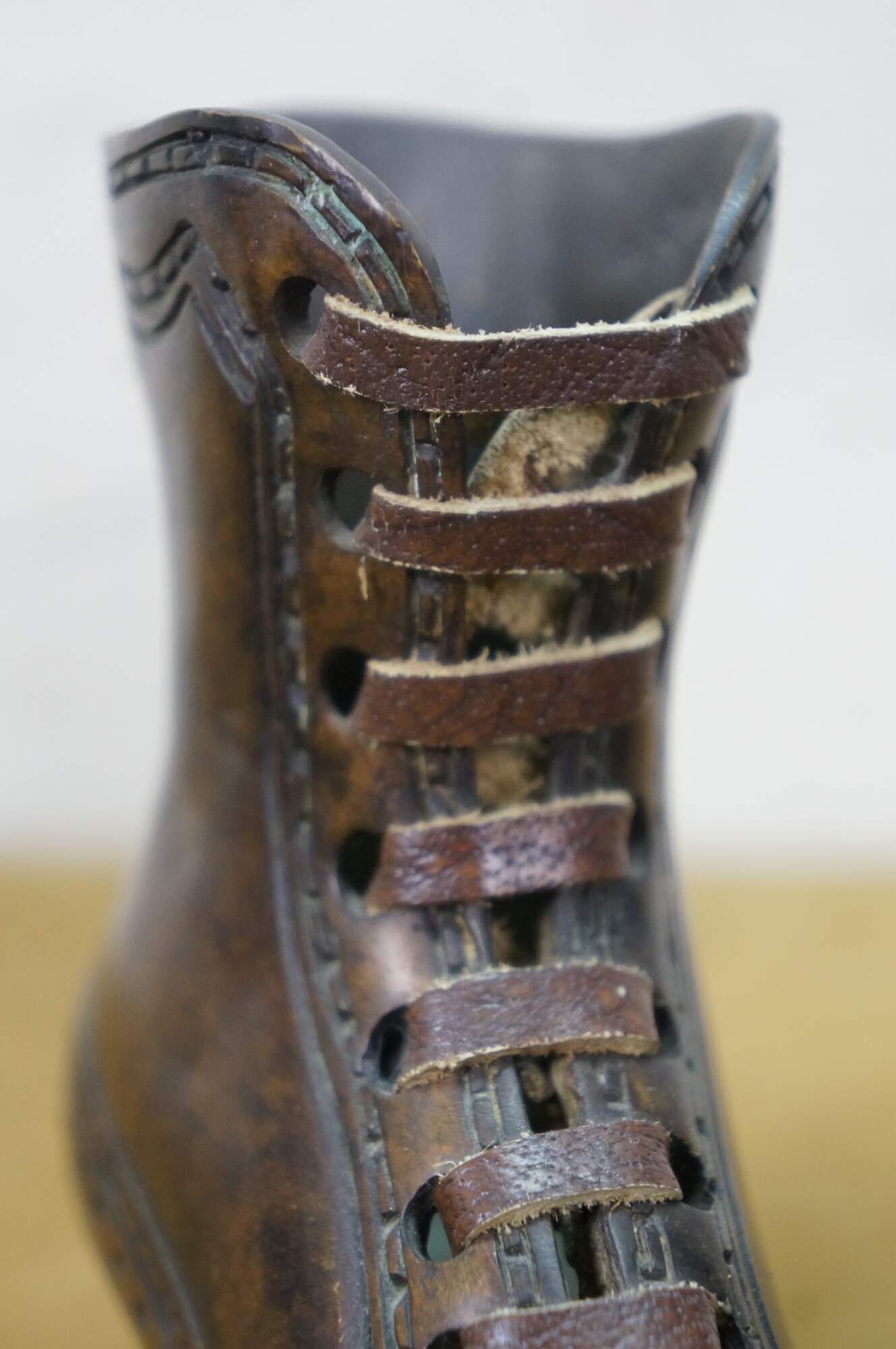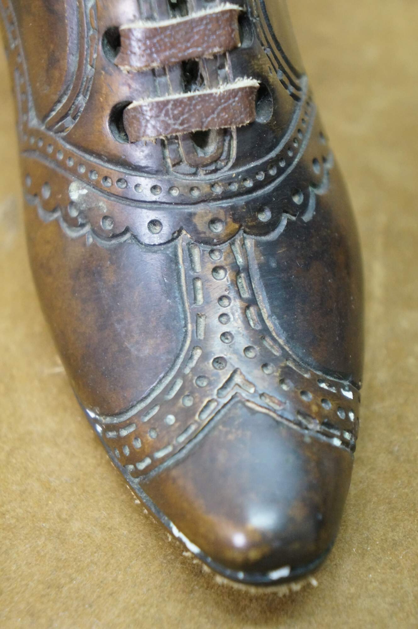 Set of six late 20th century Theodore Alexander bronze figurines in the shape of Victorian boots in a variety of heights and styles. Leather laces and pads on the soles.
