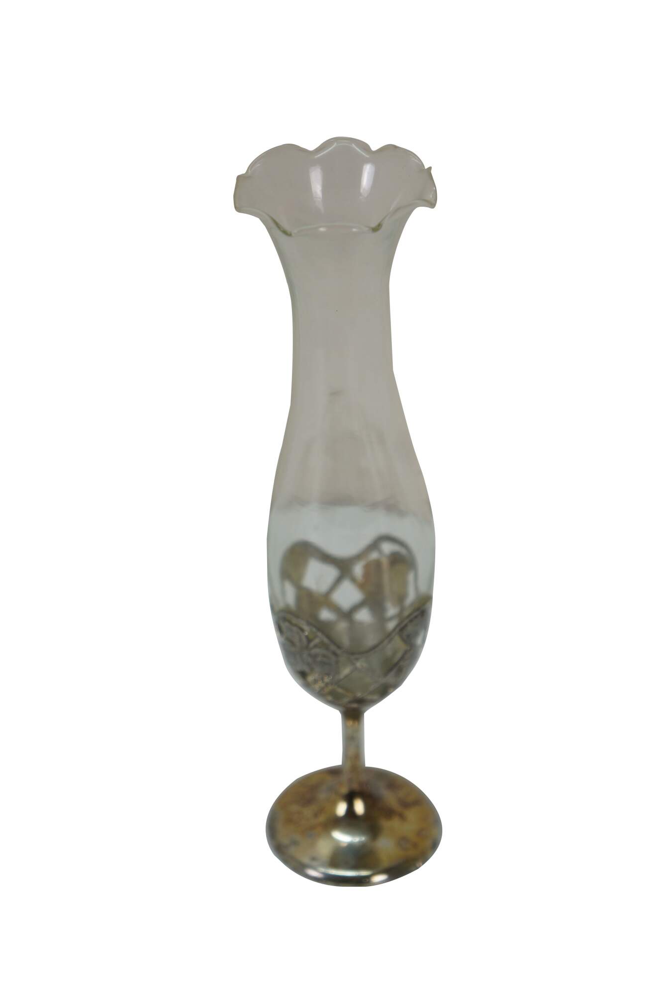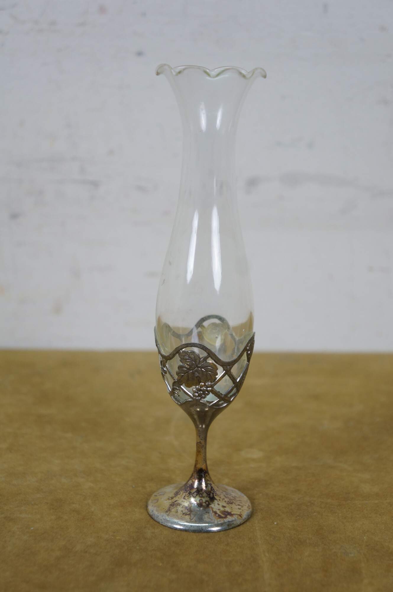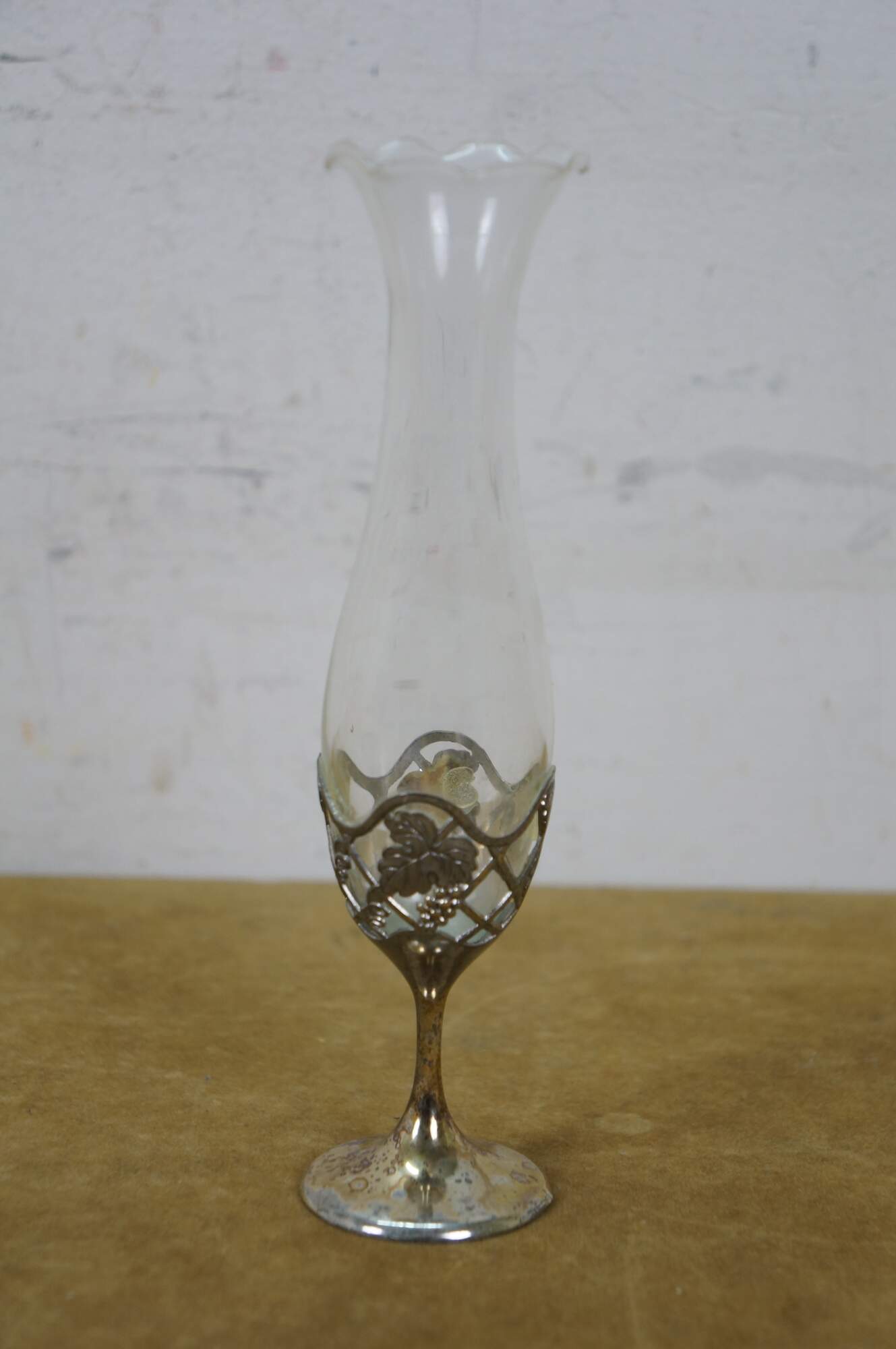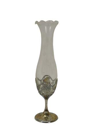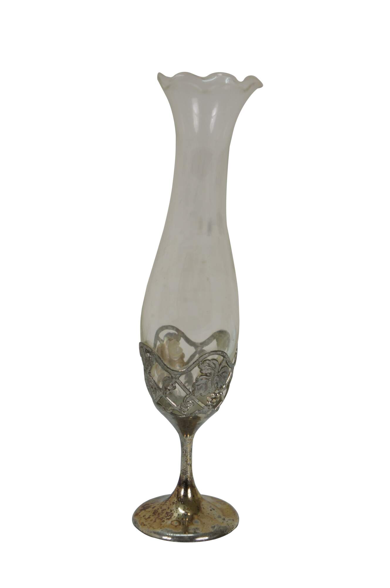 Late 20th century Leonard Japan bud vase featuring a trumpet flower shaped glass top in a silverplated pedestal base decorated with grapevines.