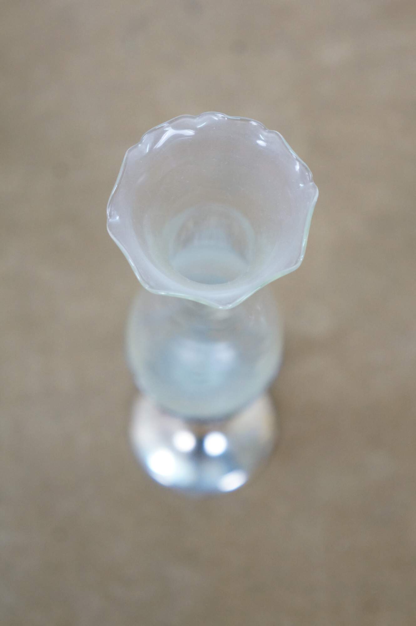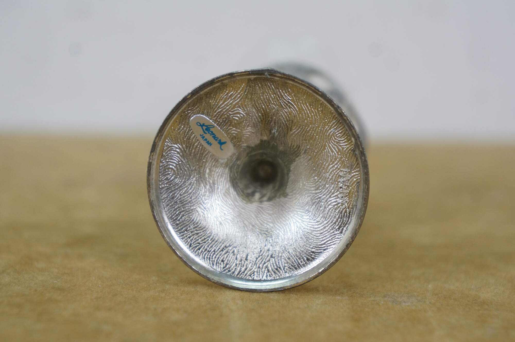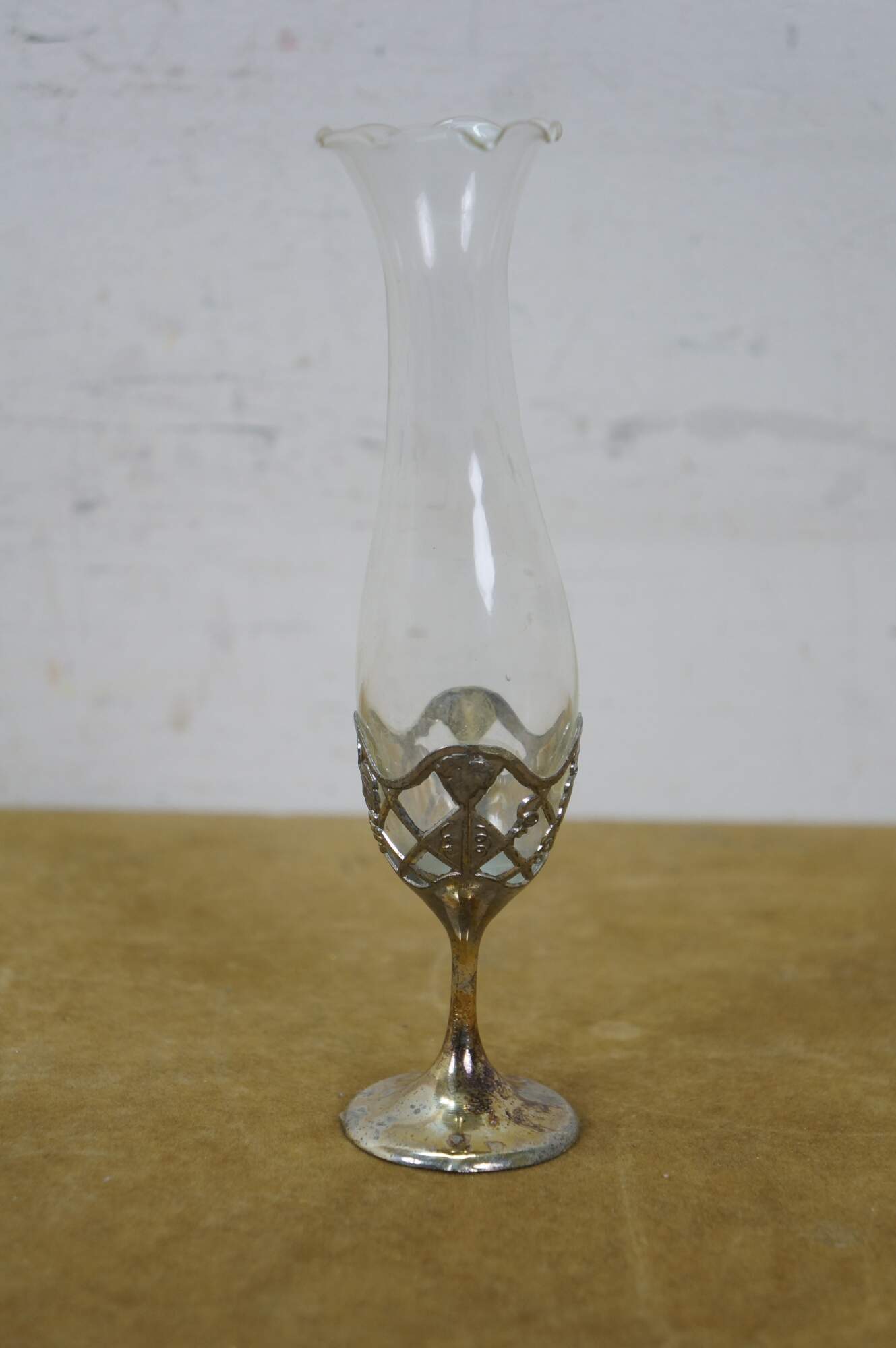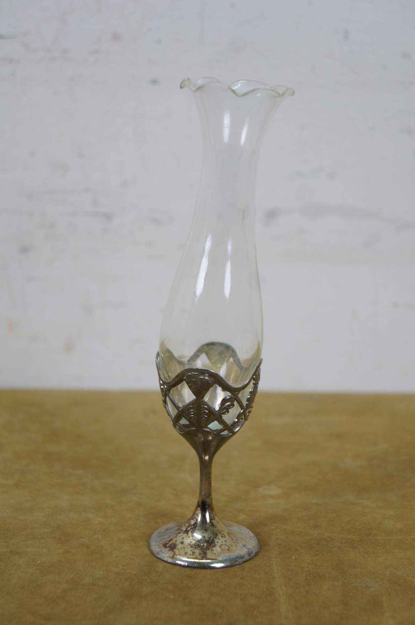 Late 20th century Leonard Japan bud vase featuring a trumpet flower shaped glass top in a silverplated pedestal base decorated with grapevines.