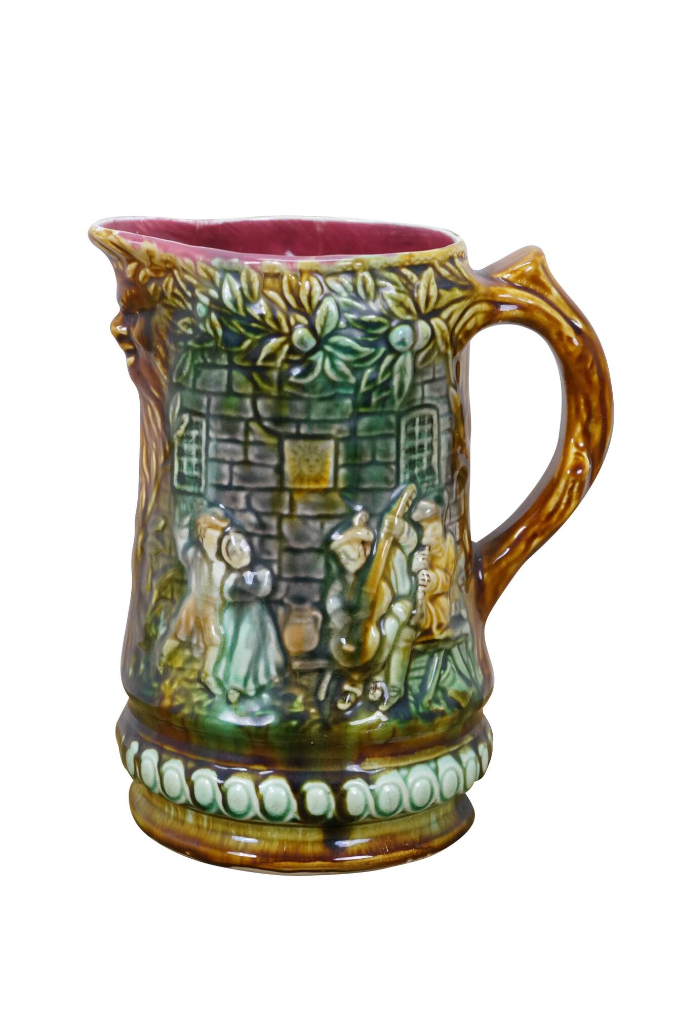 Antique Onnaing Majolica 714 Castle Courtyard Tavern Green Man Jug Pitcher 9"