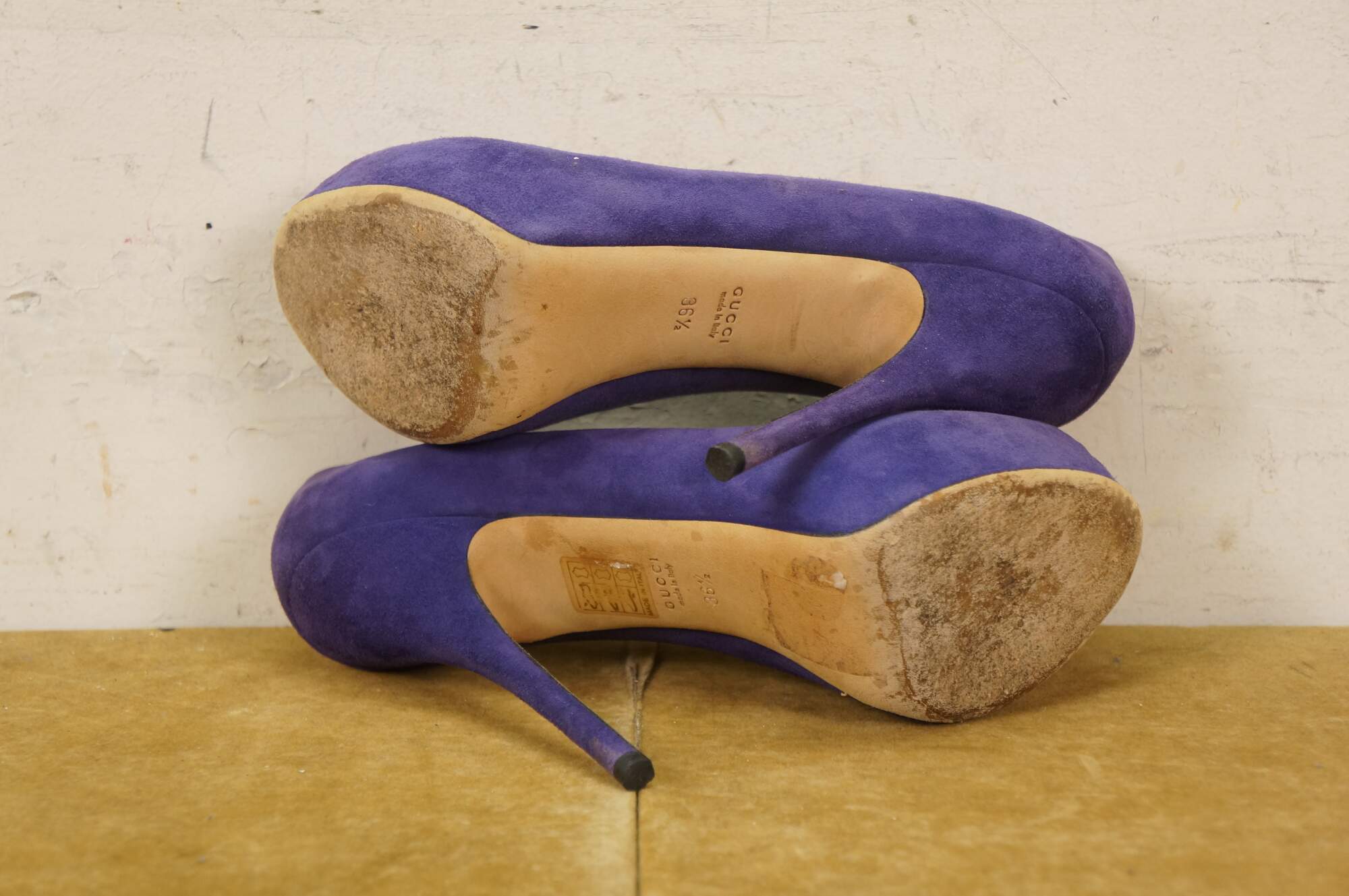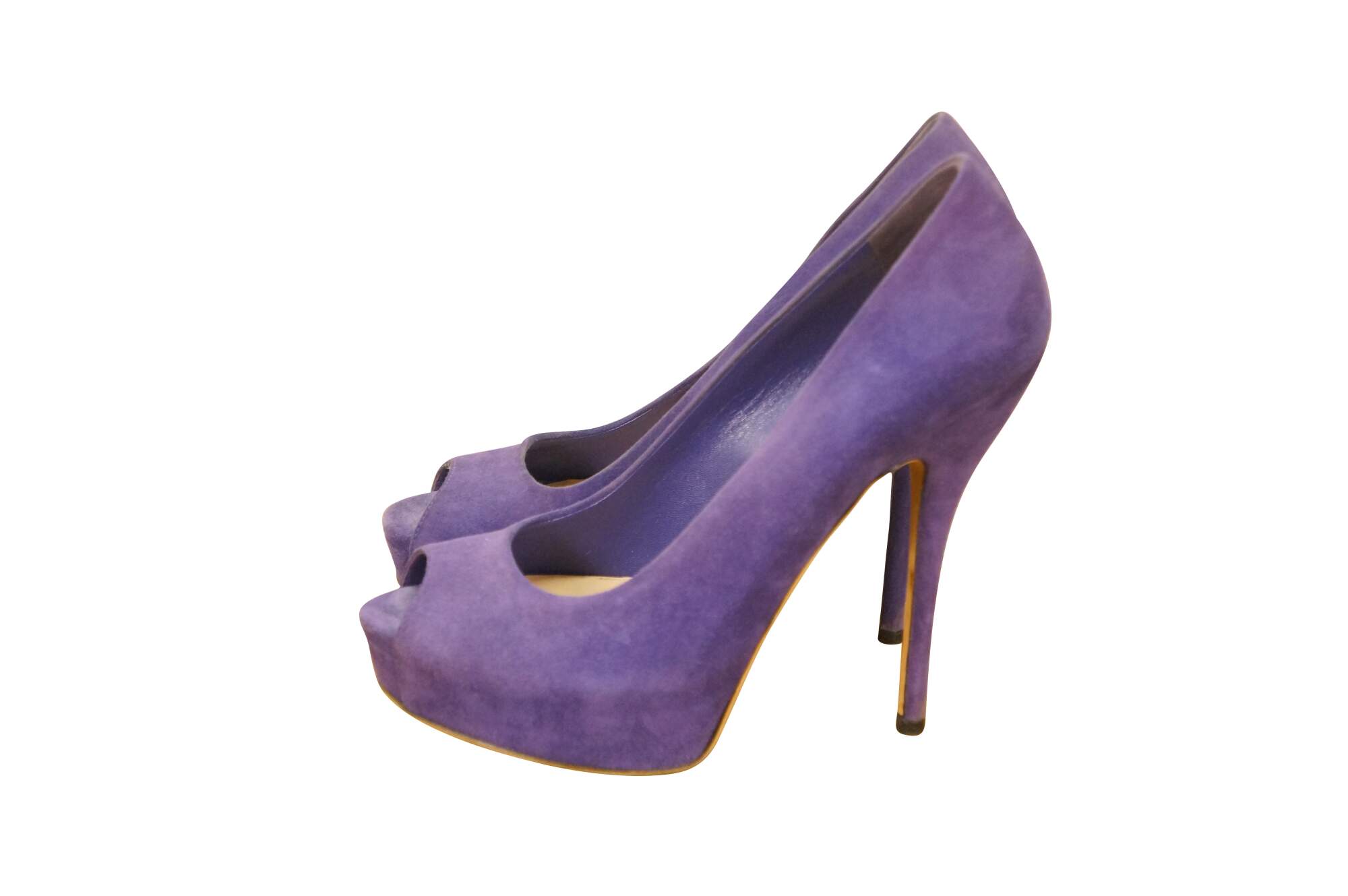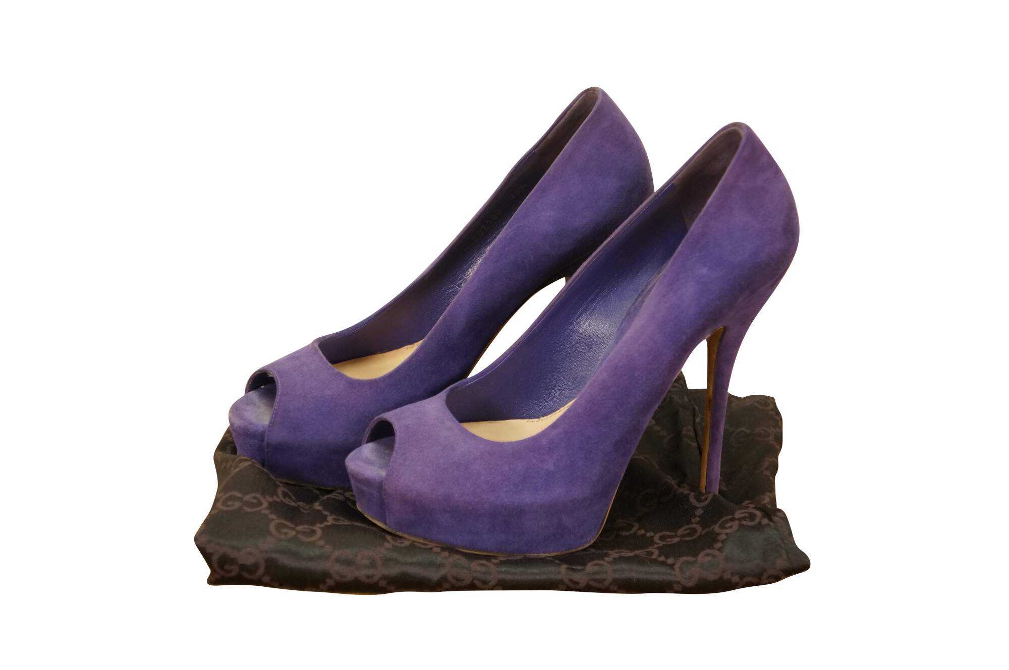 Vintage Gucci Sophia royal purple suede platform pumps with stiletto high heel and peep toe. Made in Italy. 252133