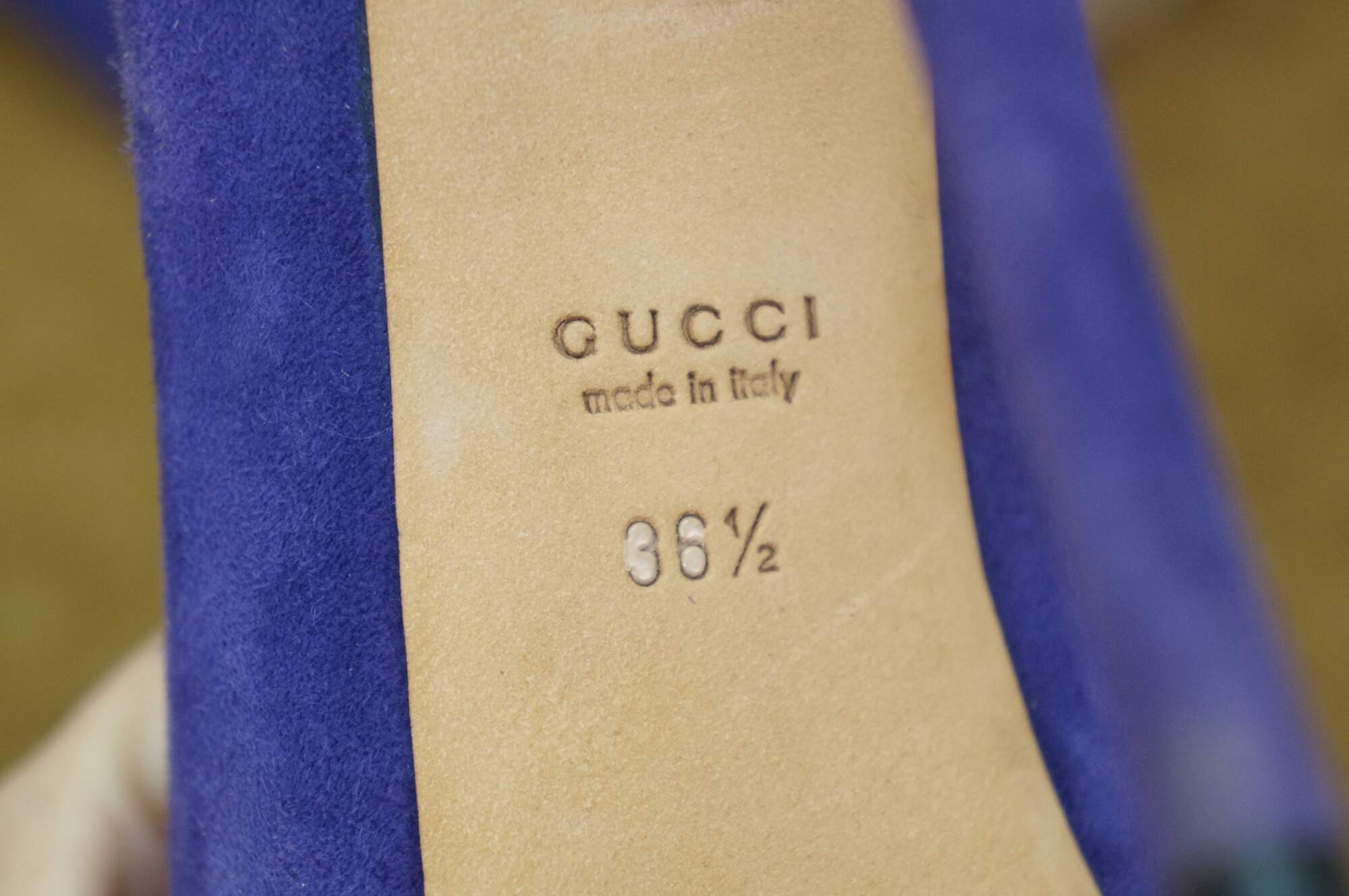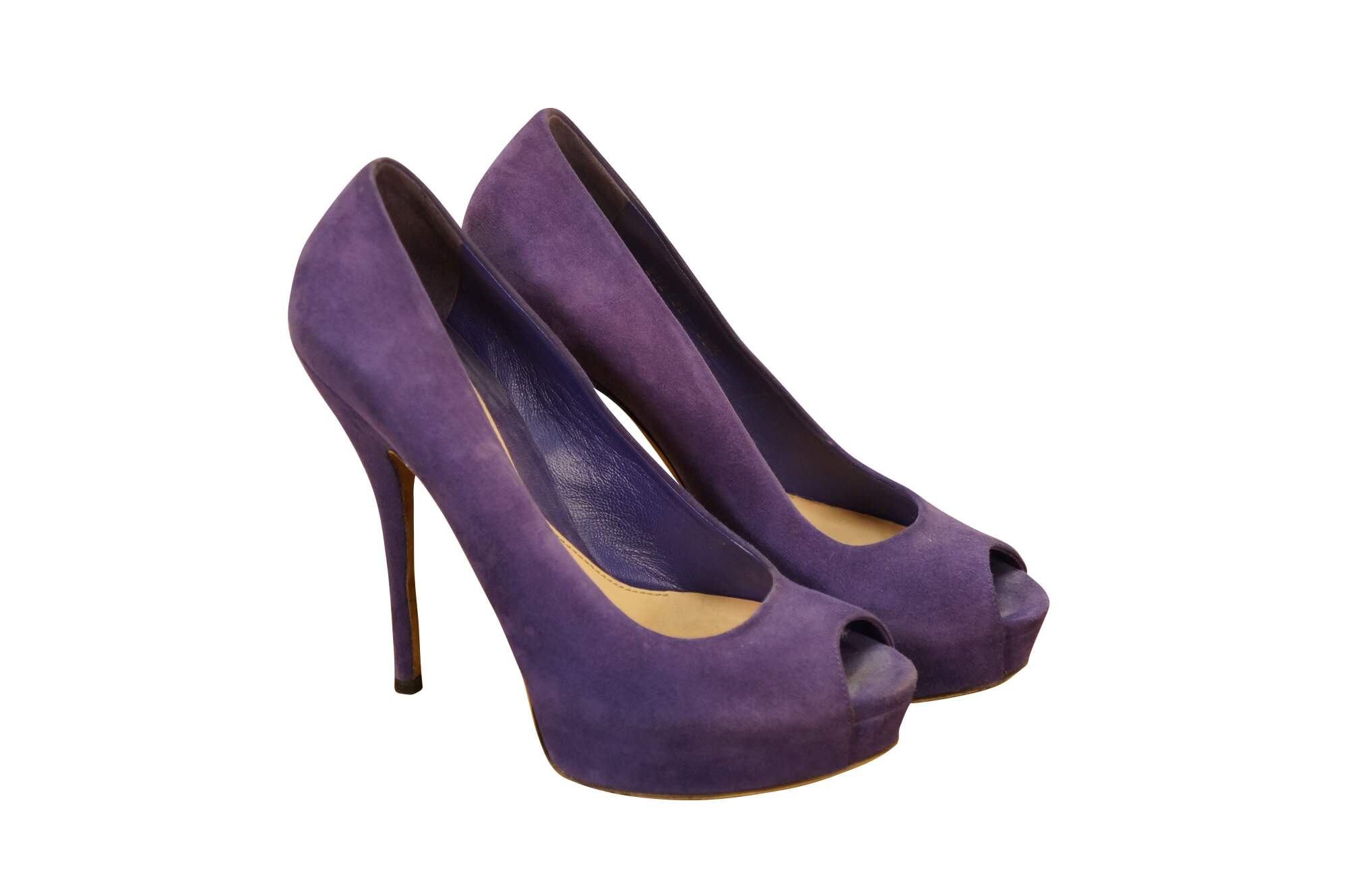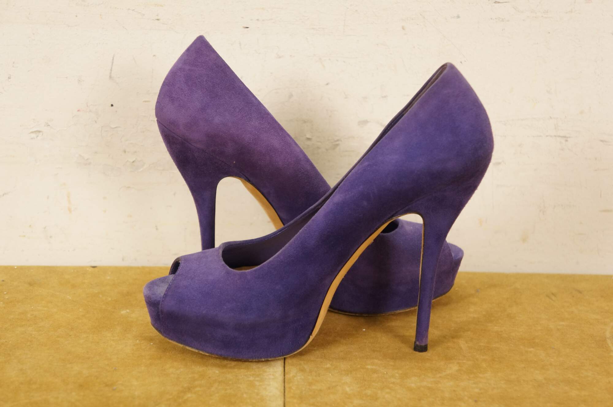 Vintage Gucci Sophia royal purple suede platform pumps with stiletto high heel and peep toe. Made in Italy. 252133