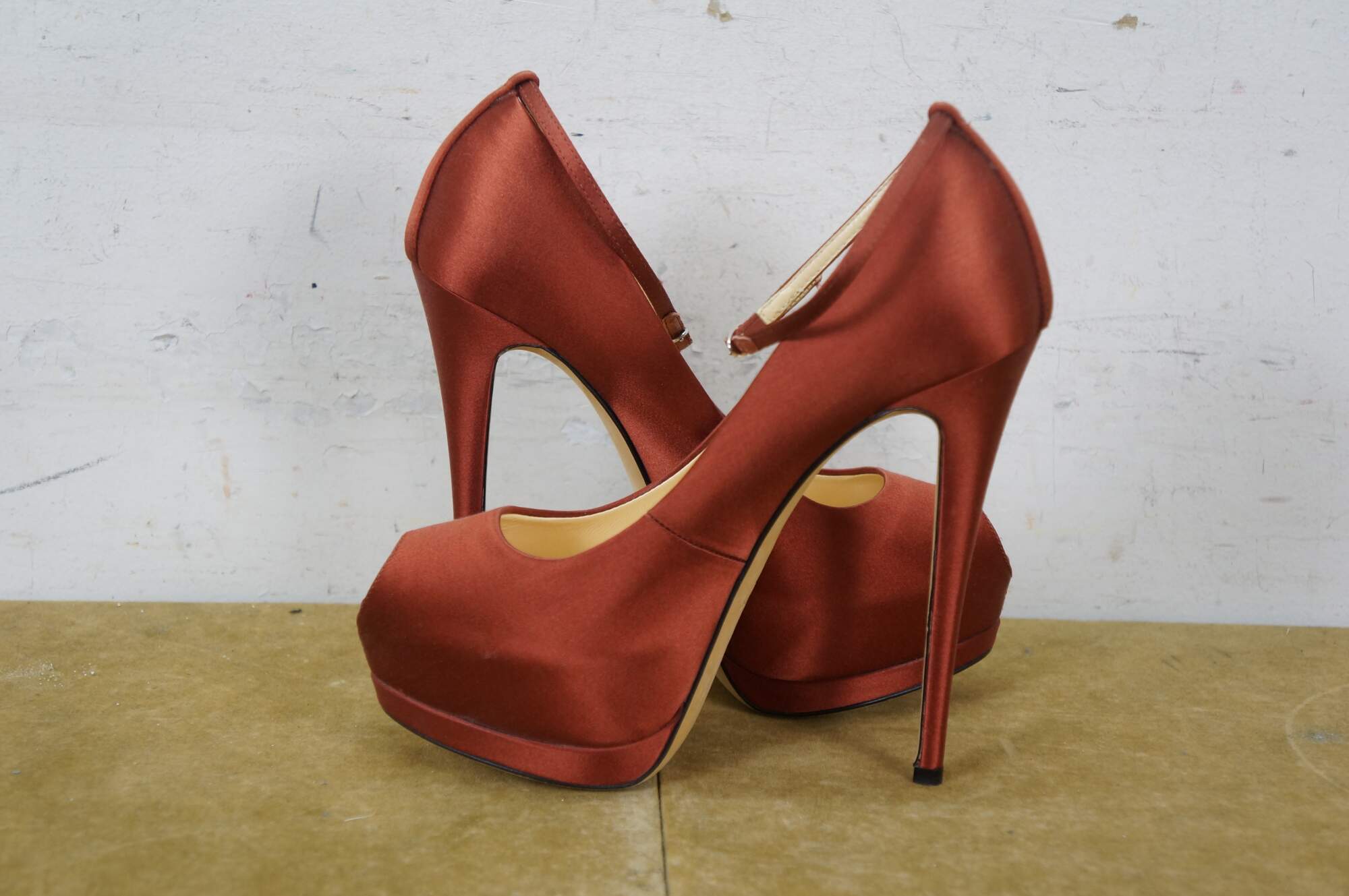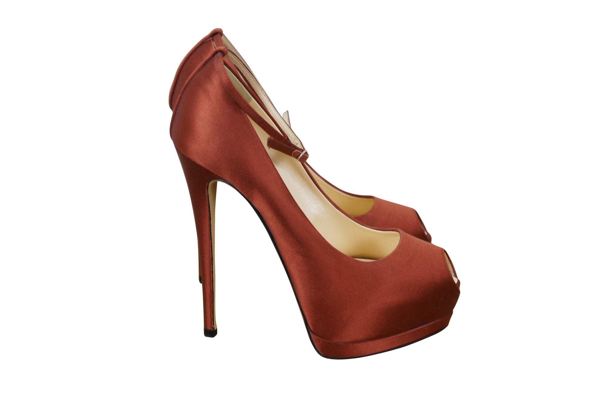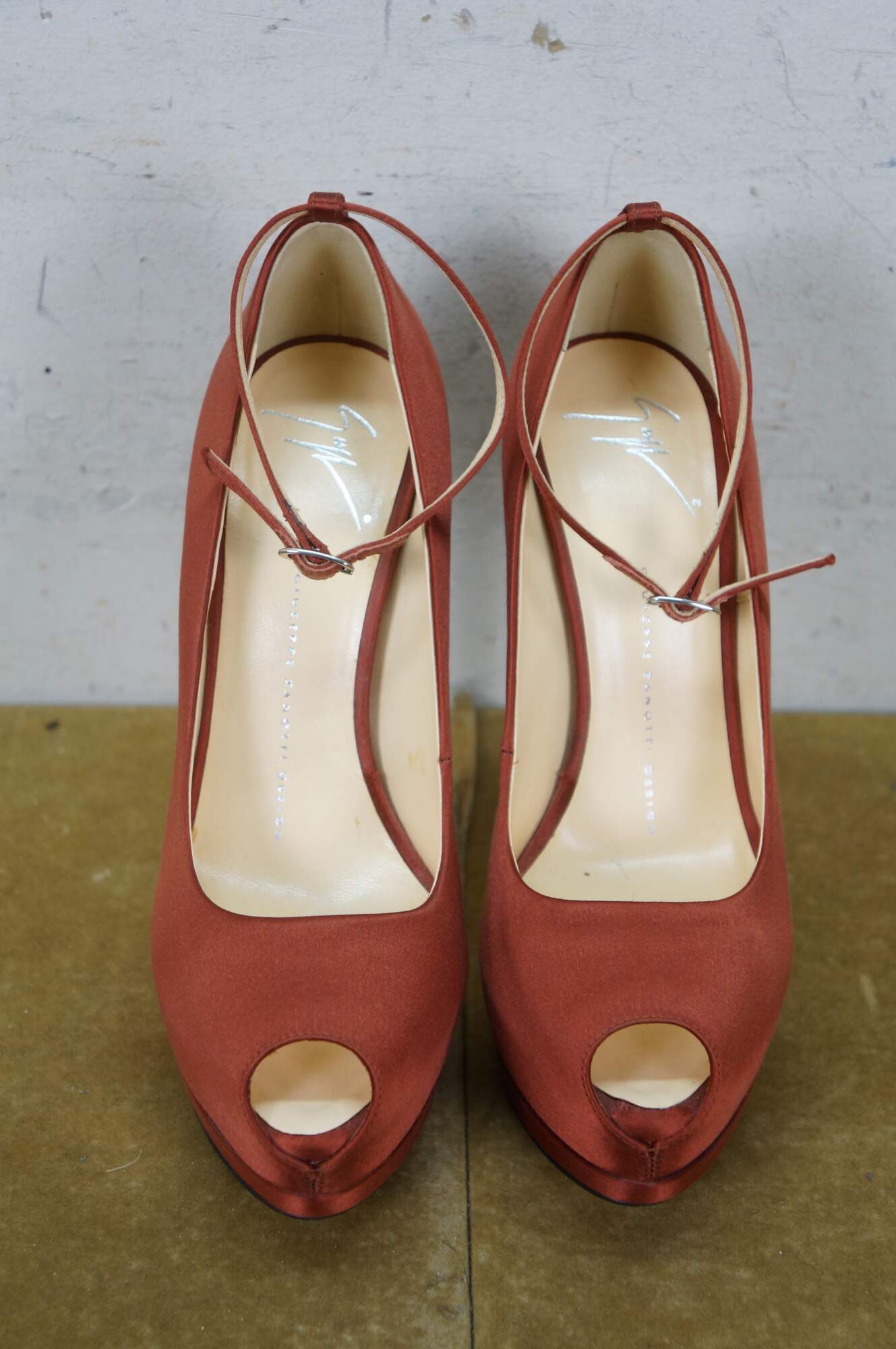 Vintage Giuseppe Zanotti rust orange satin stiletto heels with platform peep toe and buckled ankle strap. Vero Cuoio (True Leather) sole. Made in Italy.