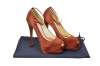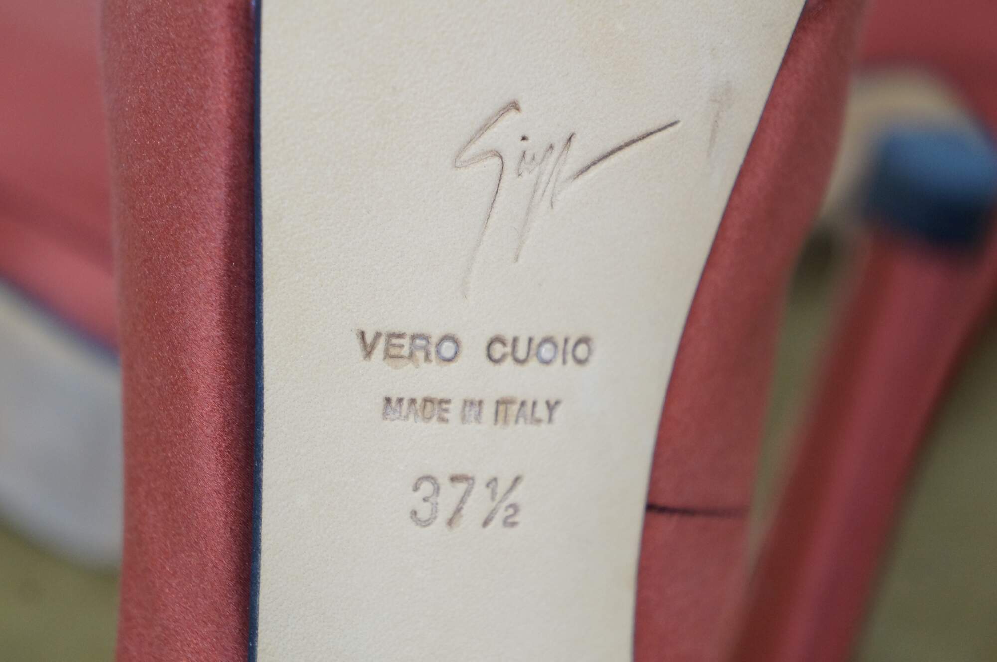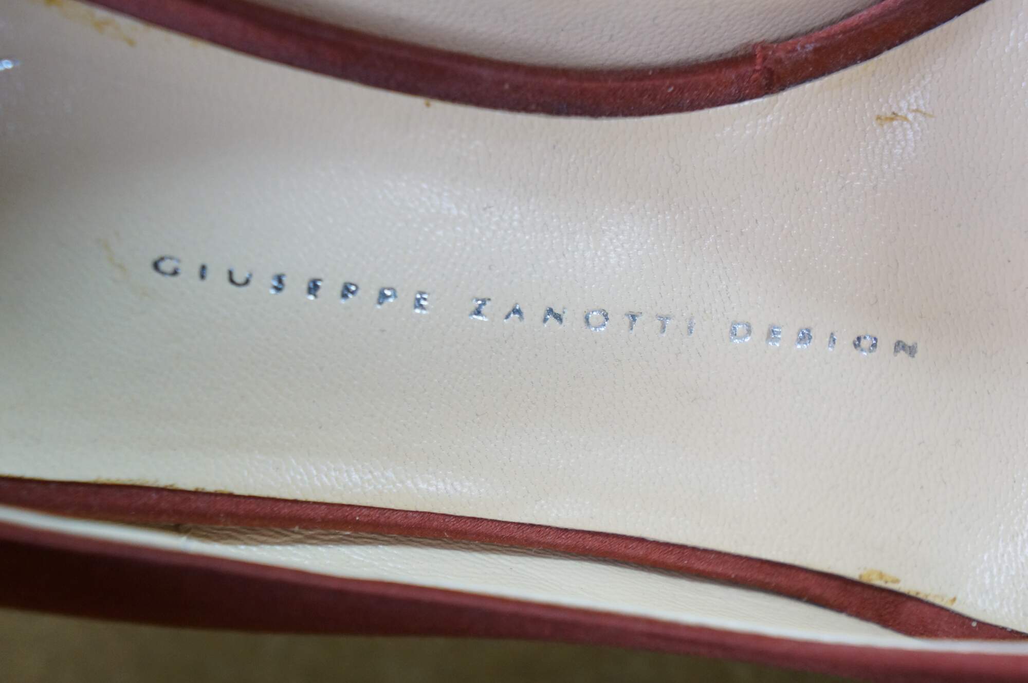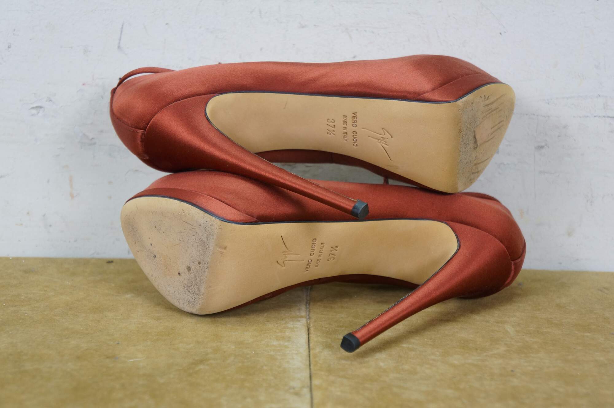 Vintage Giuseppe Zanotti rust orange satin stiletto heels with platform peep toe and buckled ankle strap. Vero Cuoio (True Leather) sole. Made in Italy.