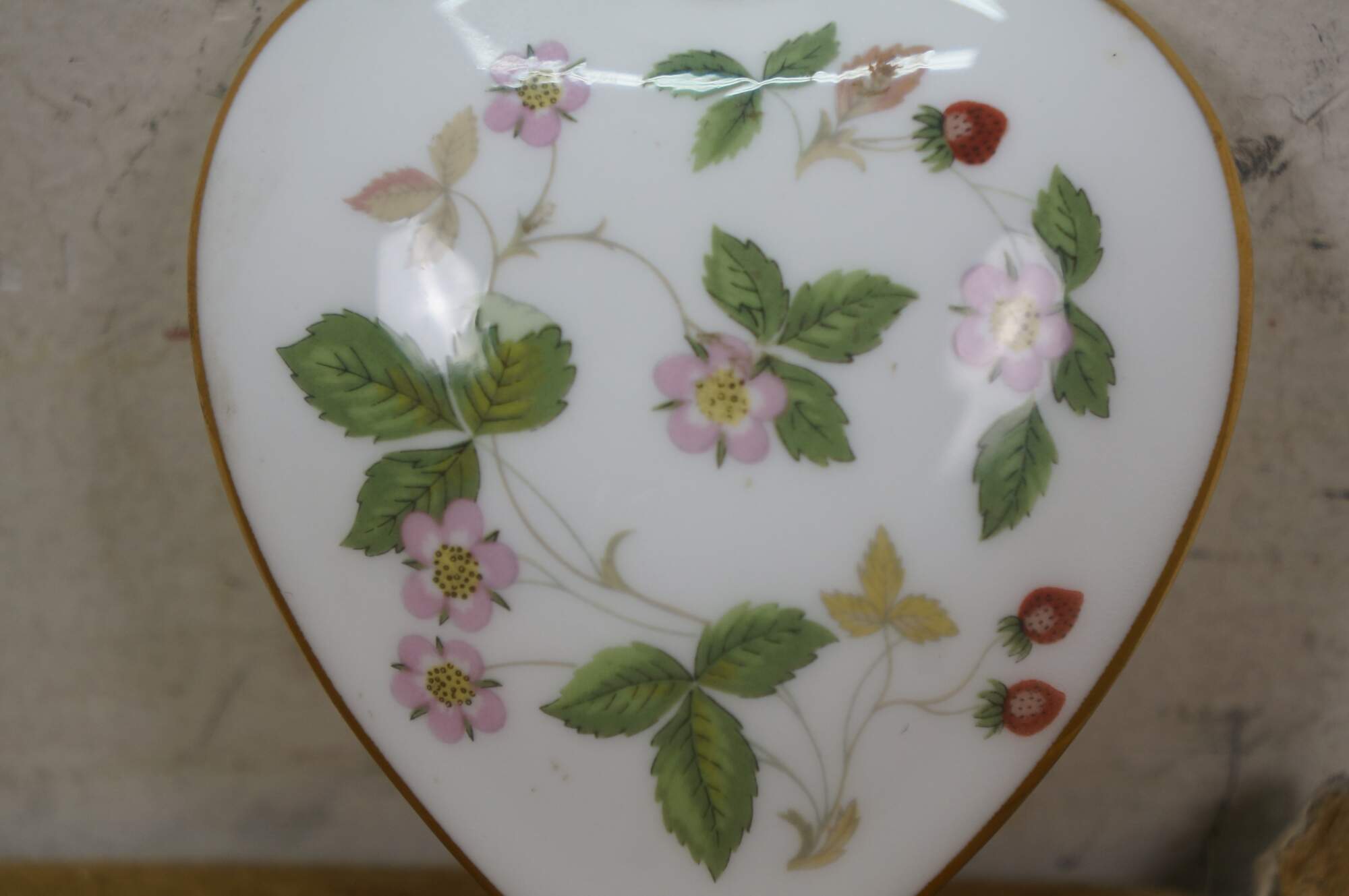 Late 20th century Wedgwood porcelain lidded trinket box - heart shaped box painted with a pattern of wild strawberry blossoms and fruit with a gilt edge.