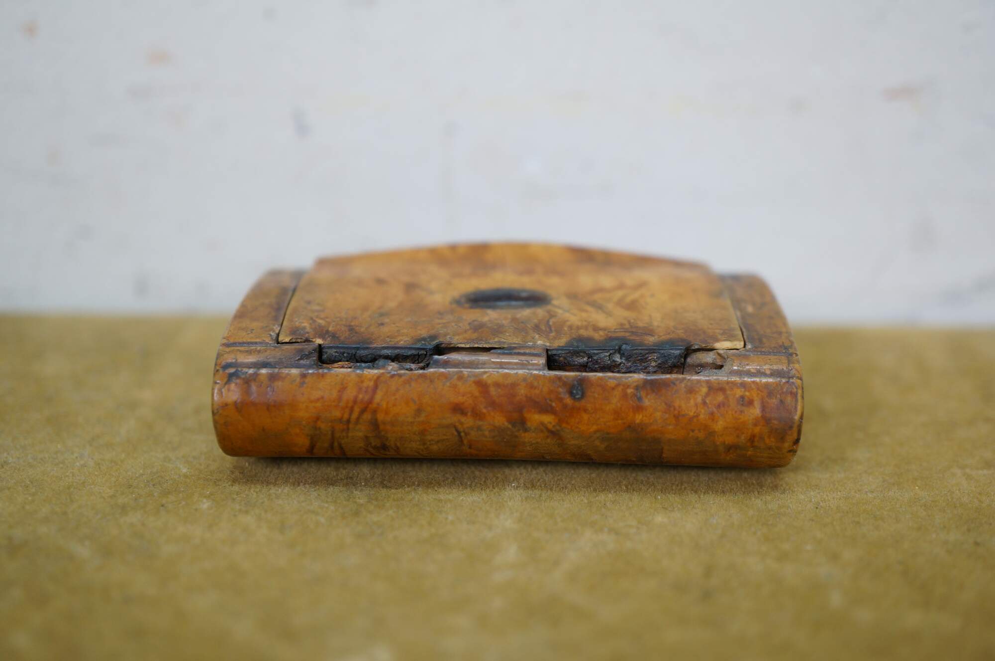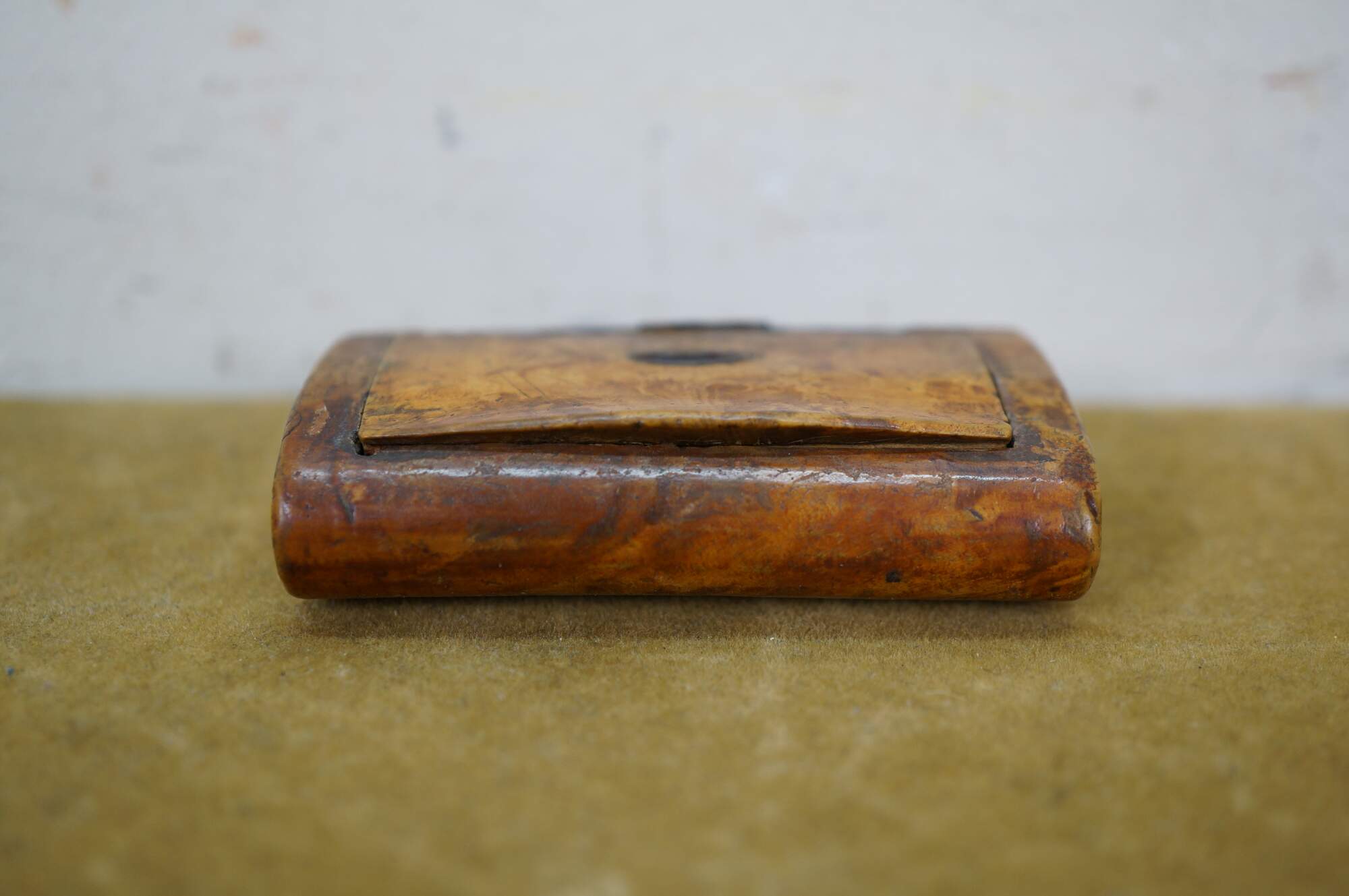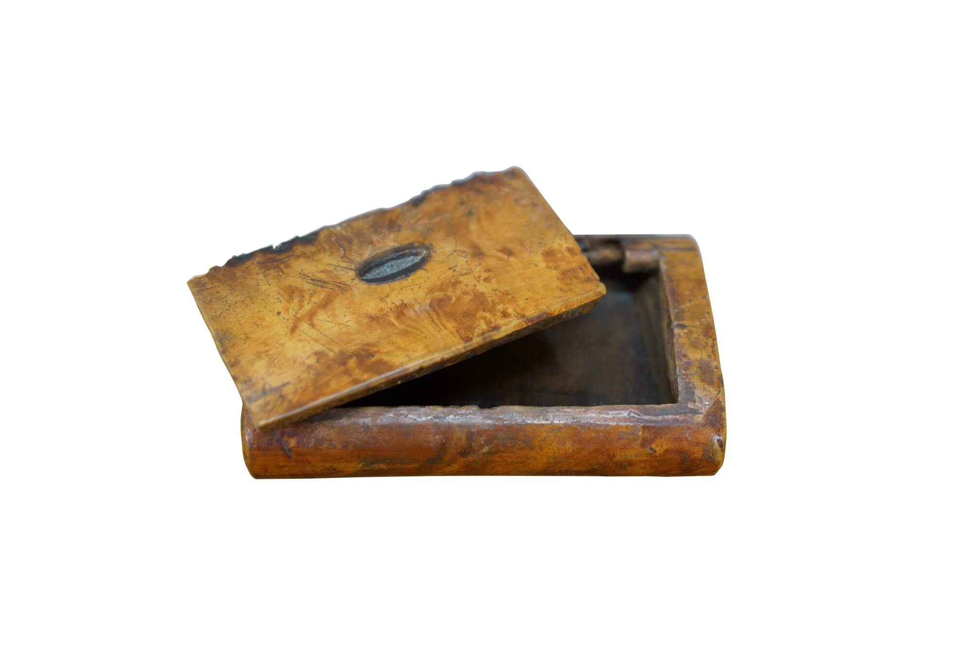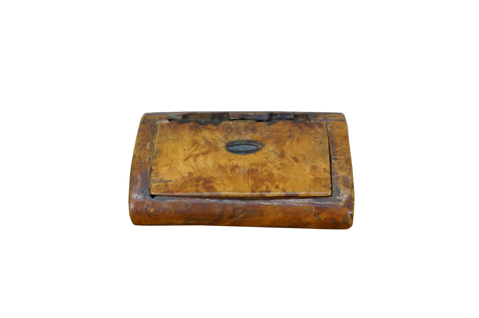 Circa 19th century burl wood snuff box. Small rectangular shape with slightly domed, flip top lid, inlaid with an almond / oval shape resembling a coffee bean.