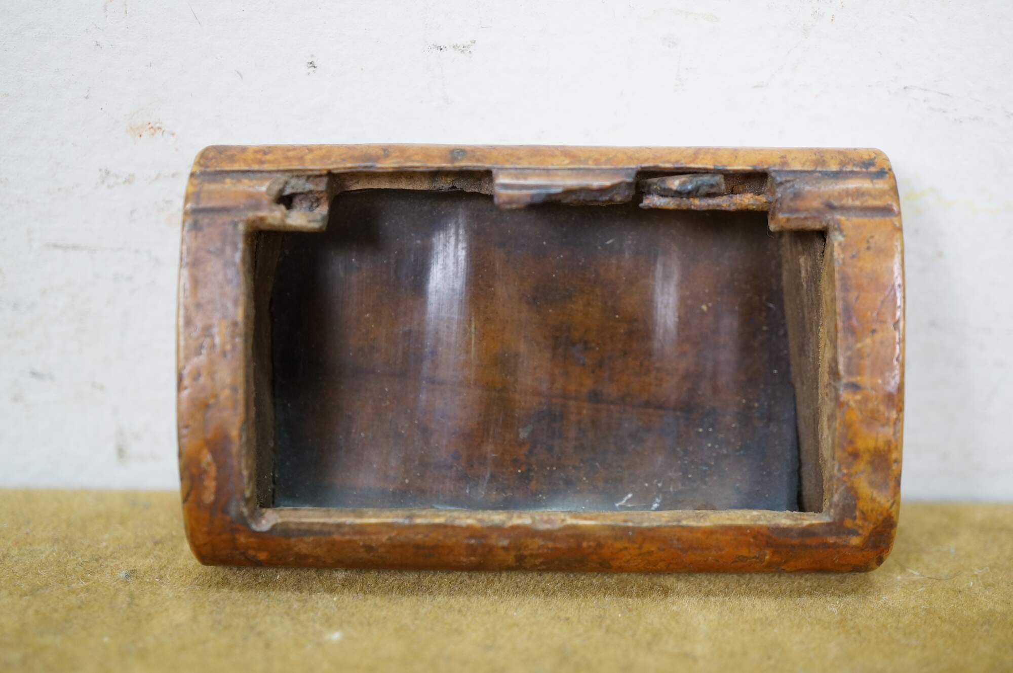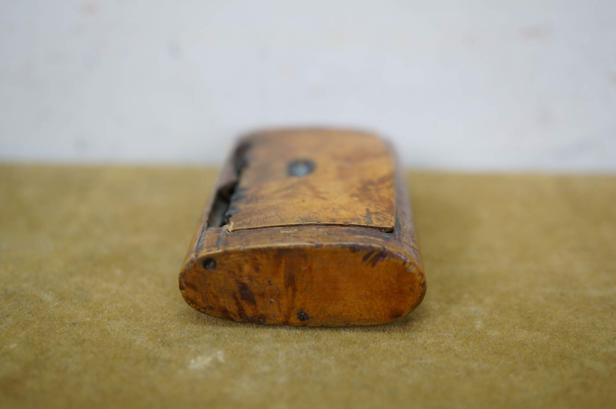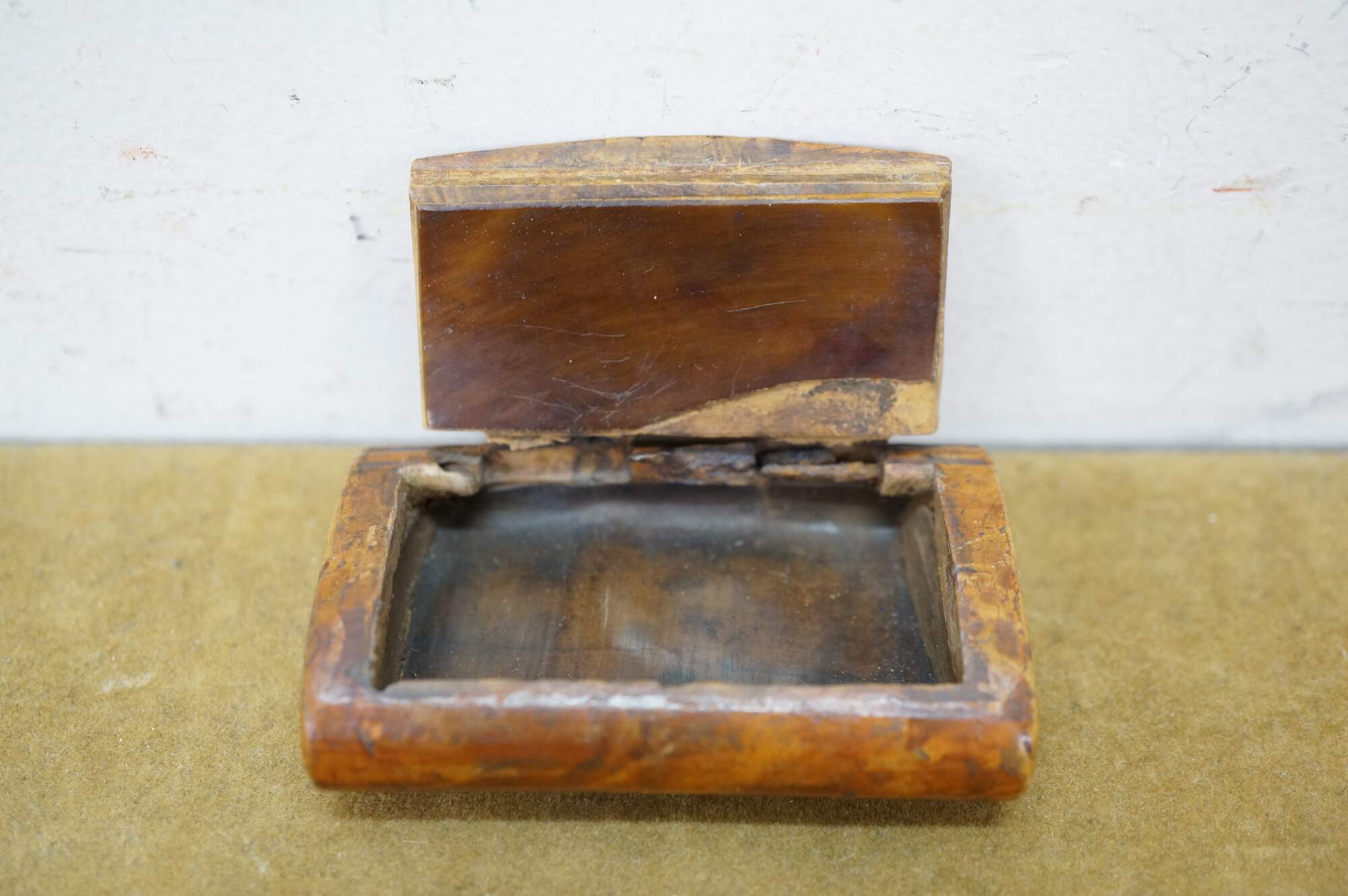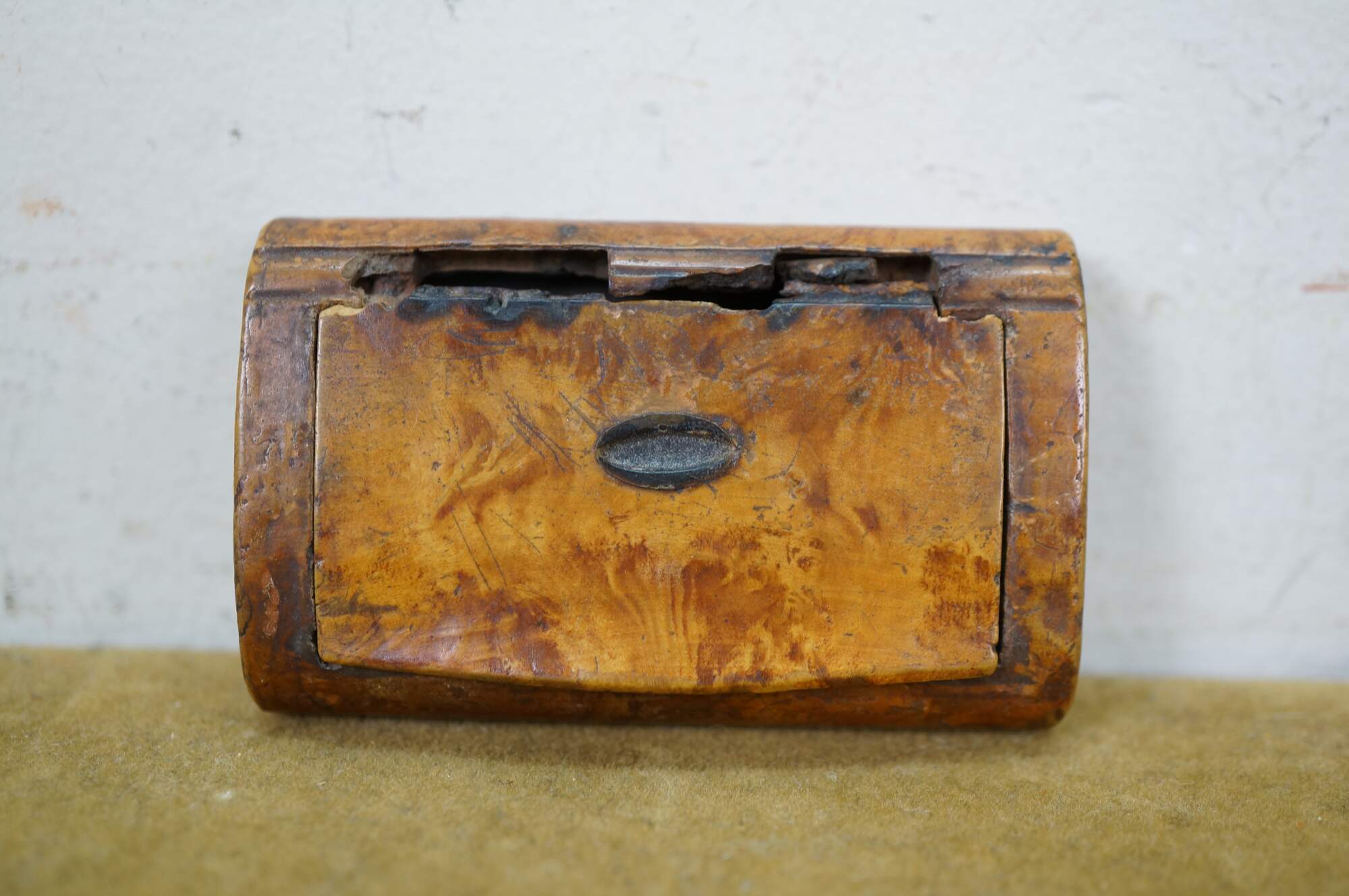 Circa 19th century burl wood snuff box. Small rectangular shape with slightly domed, flip top lid, inlaid with an almond / oval shape resembling a coffee bean.