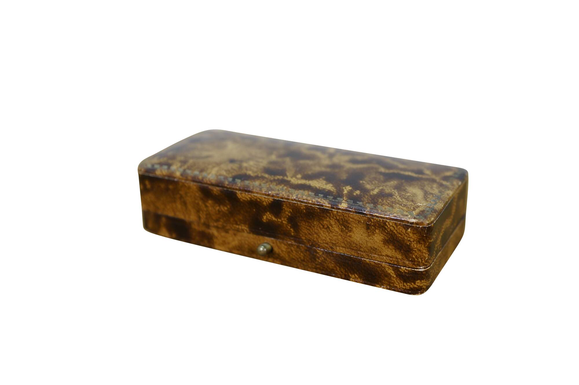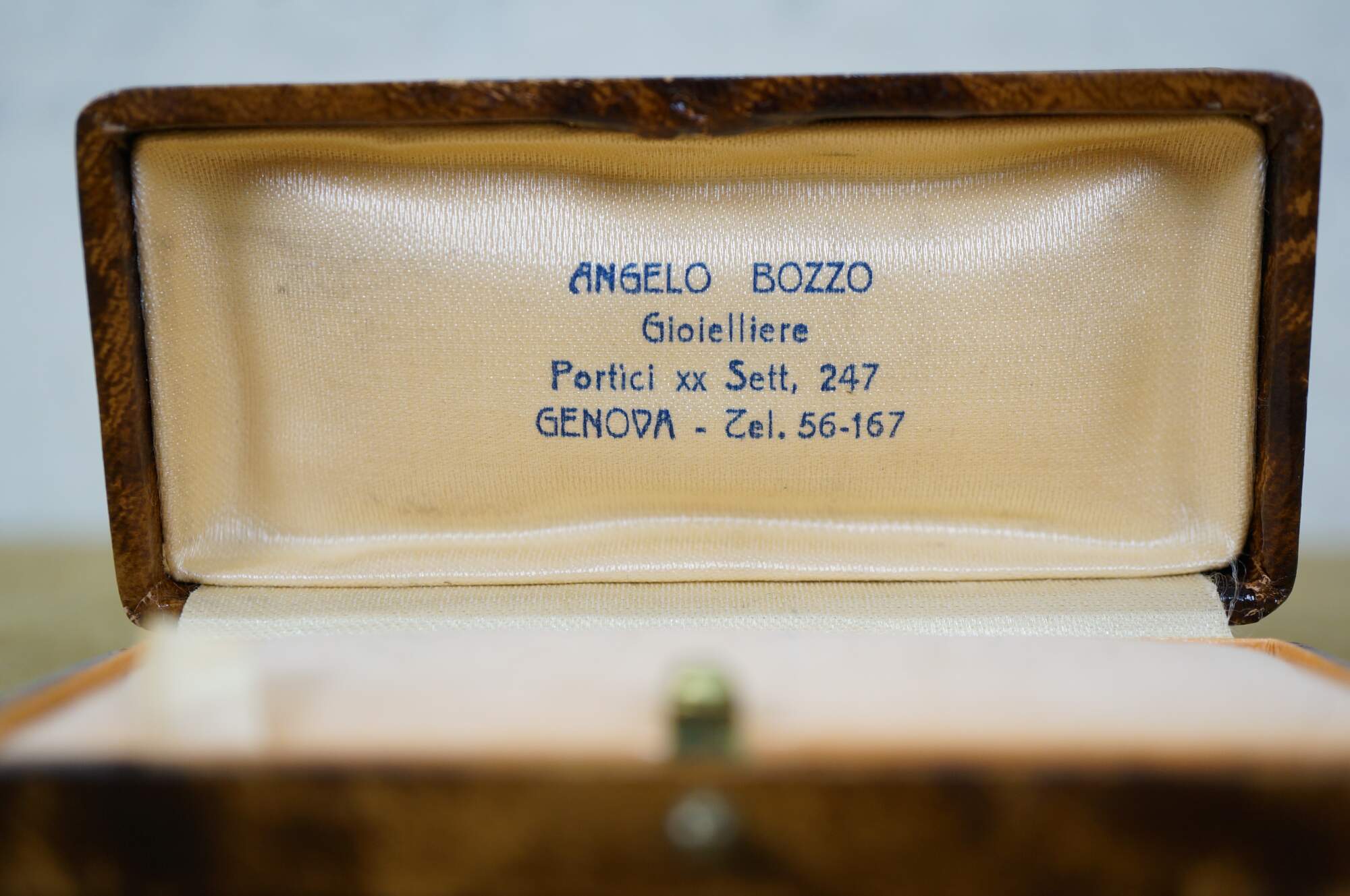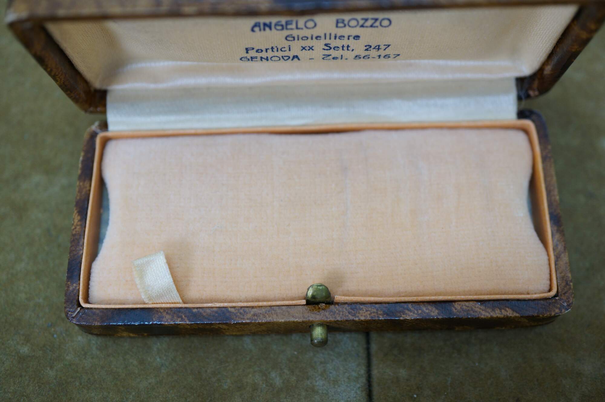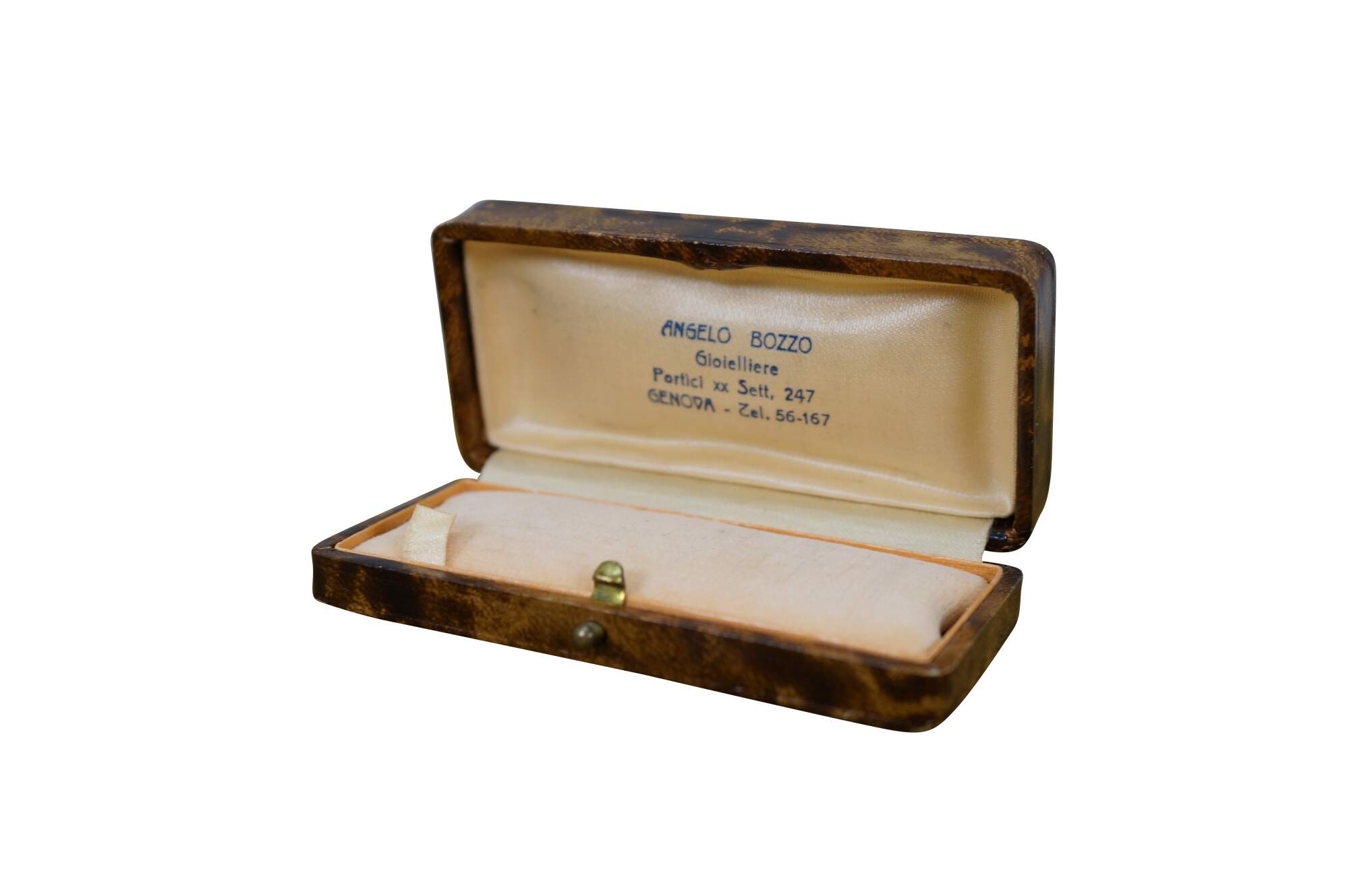 Late 19th to early 20th century jewelry presentation box - small rectangular box finished in bonded tortoiseshell patterned leather, lined in light peach colored satin and matching velvet cushion. Likely designed for a bracelet or wrist watch. Marked inside lid: Angelo Bozzo - Gioielliere - Portici xx Sett, 247 - Genova - Zel. 56-167.