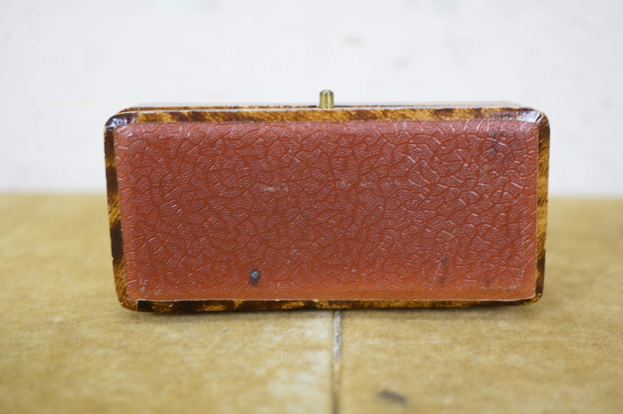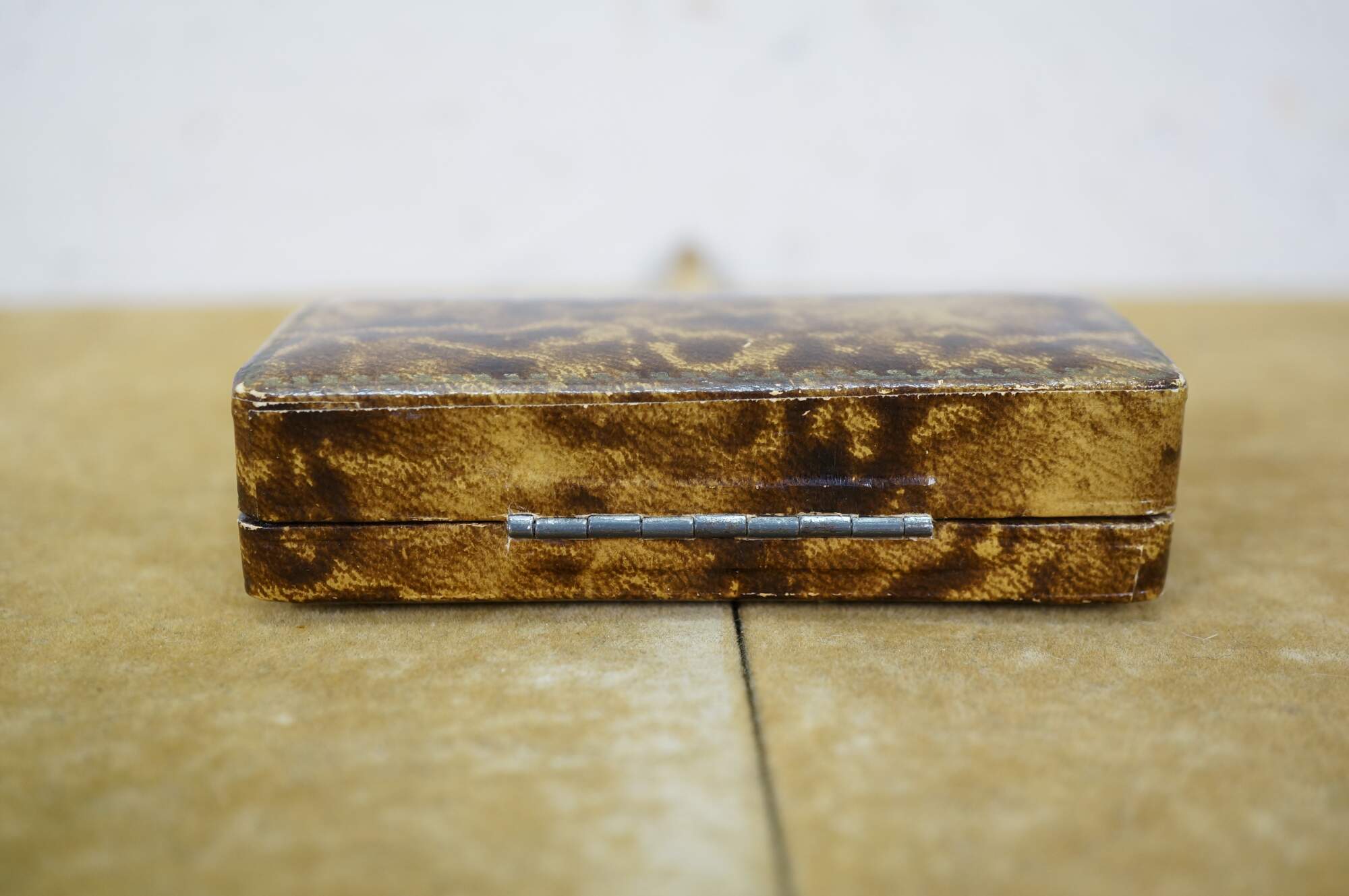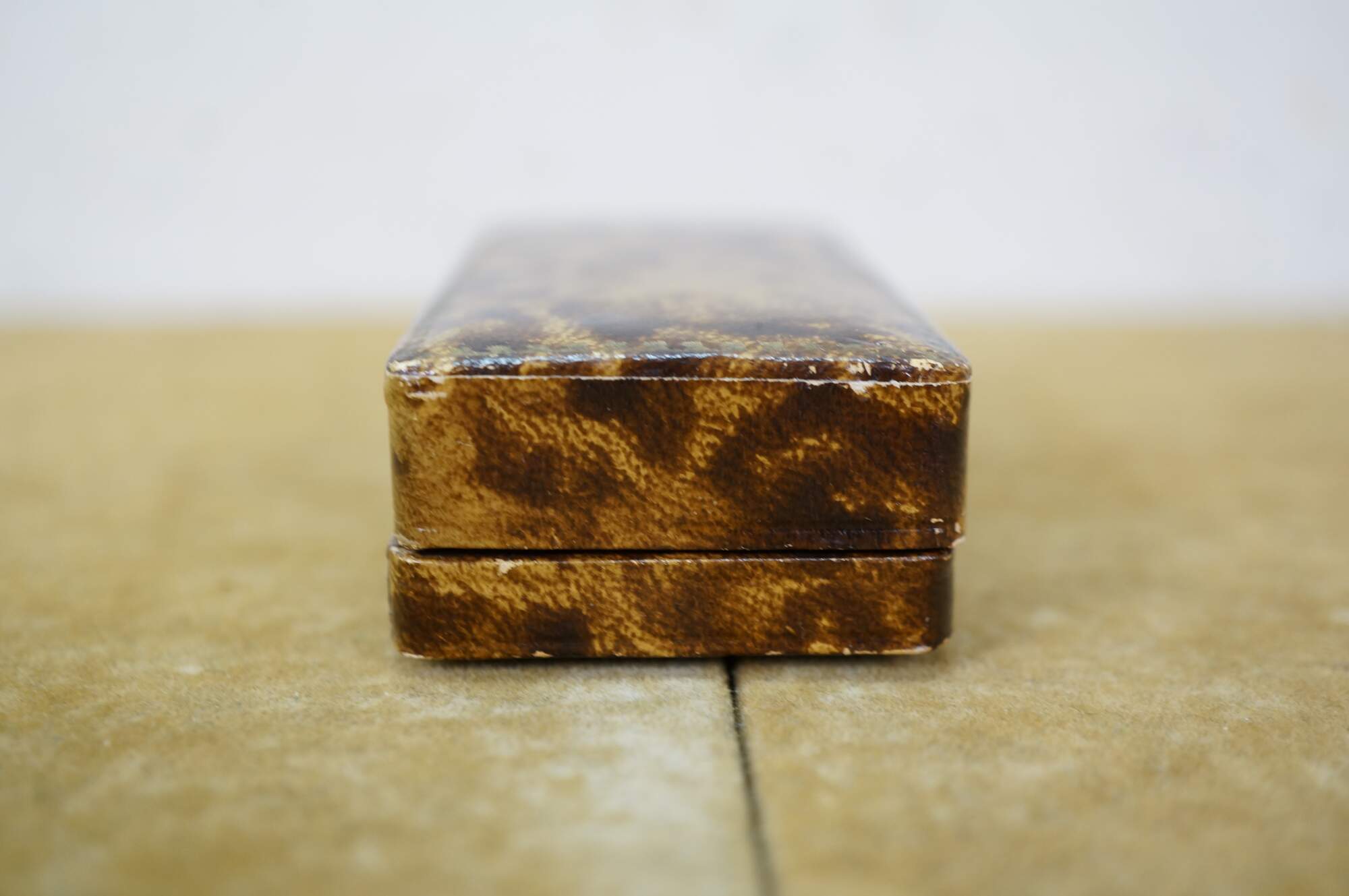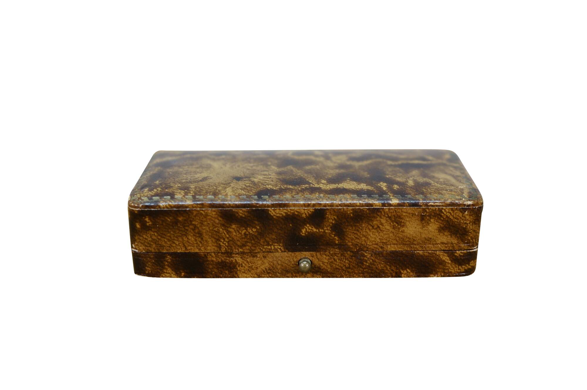 Late 19th to early 20th century jewelry presentation box - small rectangular box finished in bonded tortoiseshell patterned leather, lined in light peach colored satin and matching velvet cushion. Likely designed for a bracelet or wrist watch. Marked inside lid: Angelo Bozzo - Gioielliere - Portici xx Sett, 247 - Genova - Zel. 56-167.