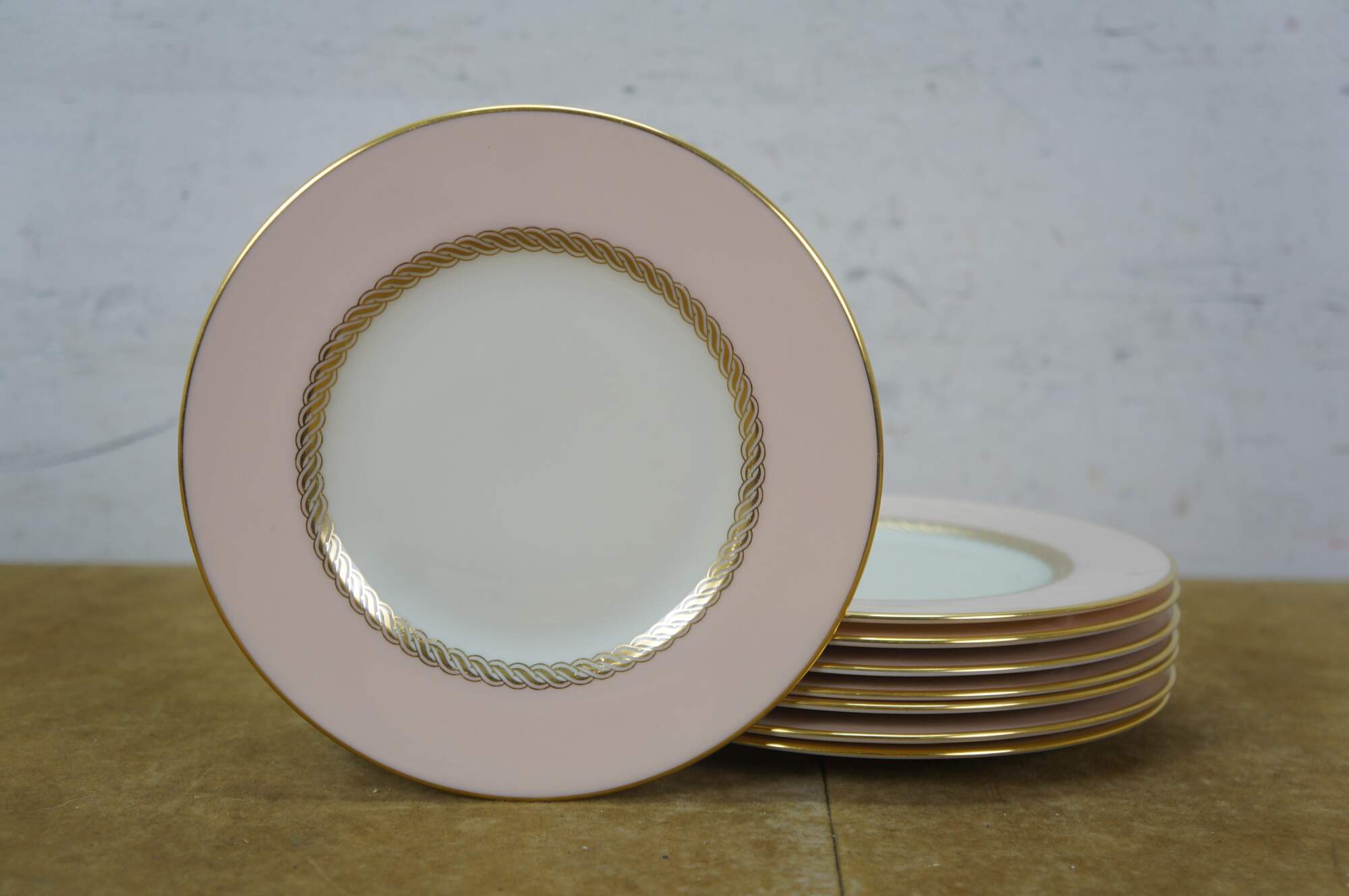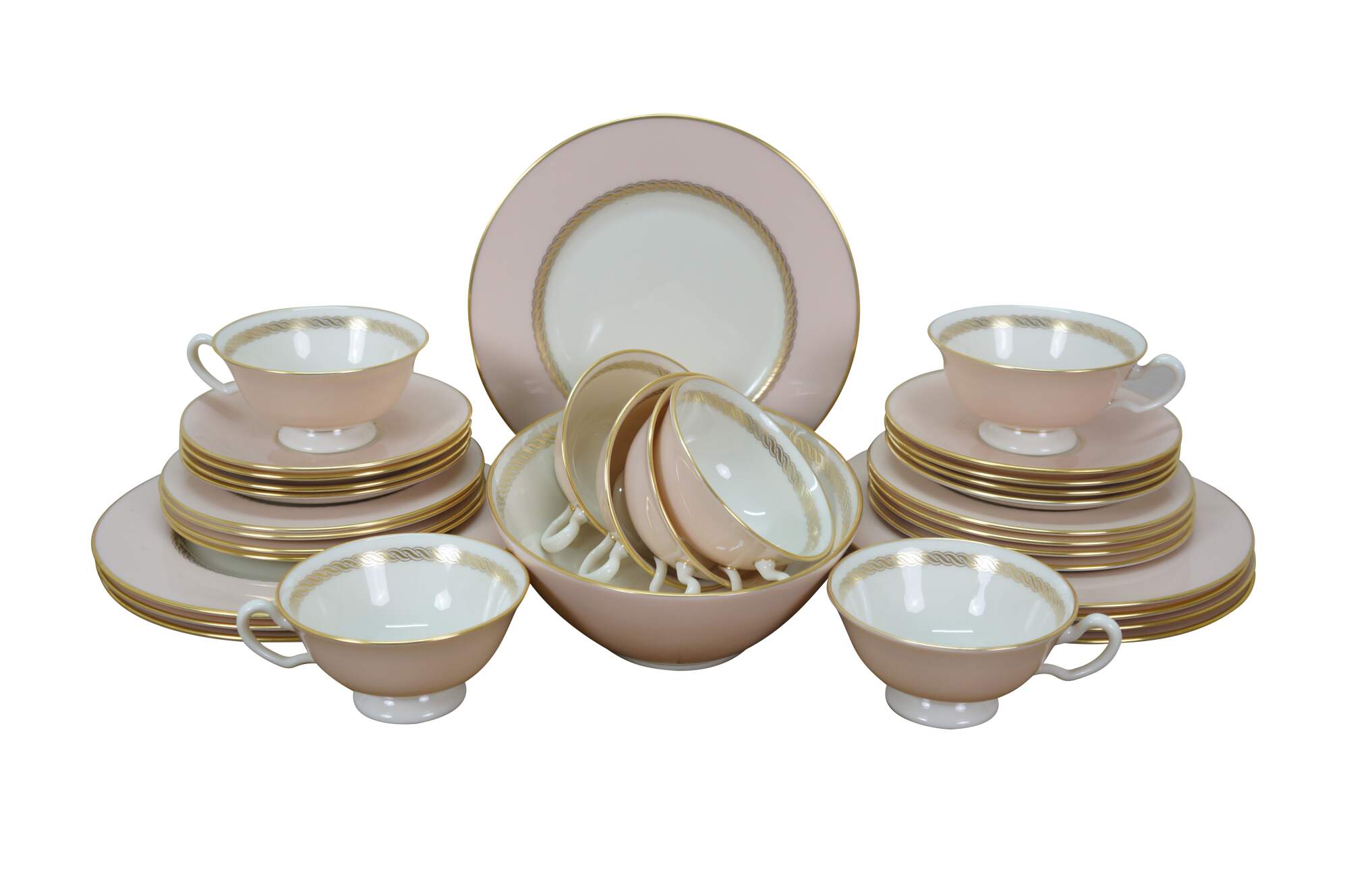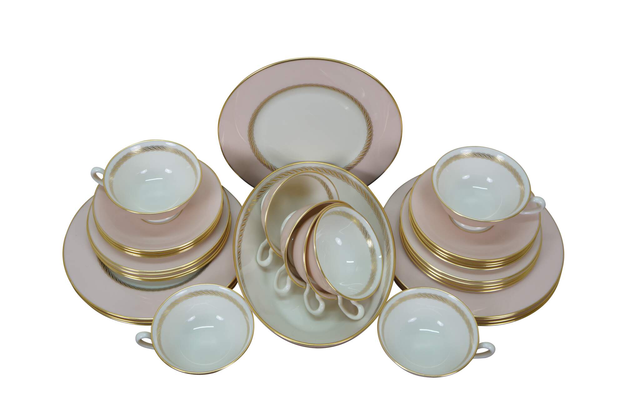 33 pieces of Caribbee by Lenox, number X-444 porcelain dinnerware. Includes: Oval Serving Dish, 8 Dessert / Salad Plates, 8 Bread Plates, 8 Saucers, 8 Teacups. White and shell pink with gilt rope twist details. Service for 8.