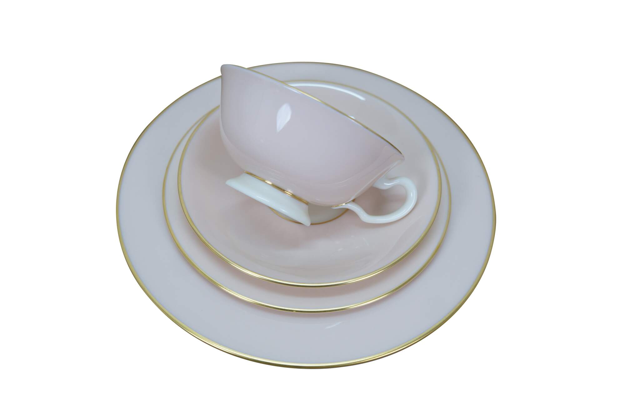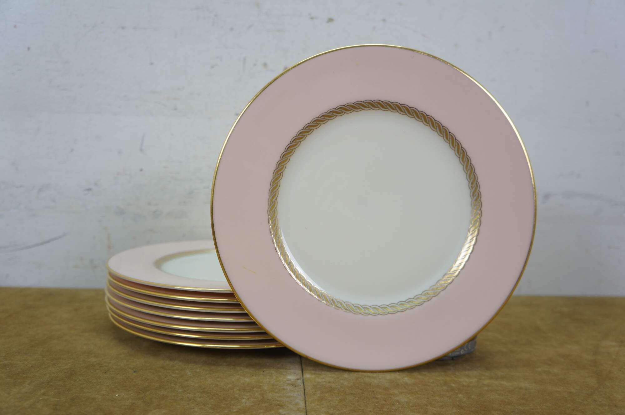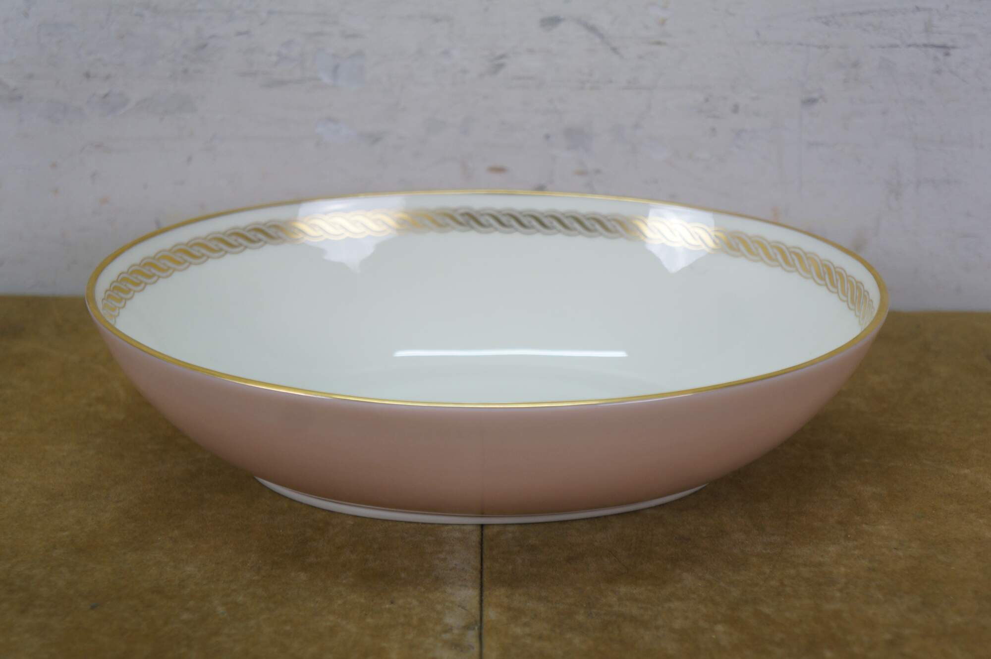 33 pieces of Caribbee by Lenox, number X-444 porcelain dinnerware. Includes: Oval Serving Dish, 8 Dessert / Salad Plates, 8 Bread Plates, 8 Saucers, 8 Teacups. White and shell pink with gilt rope twist details. Service for 8.