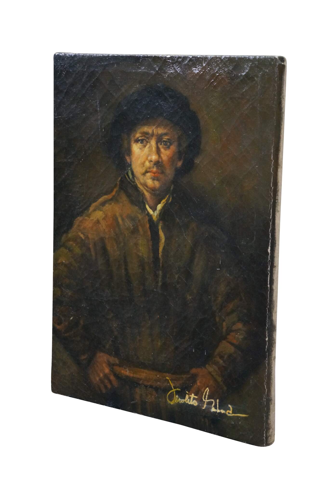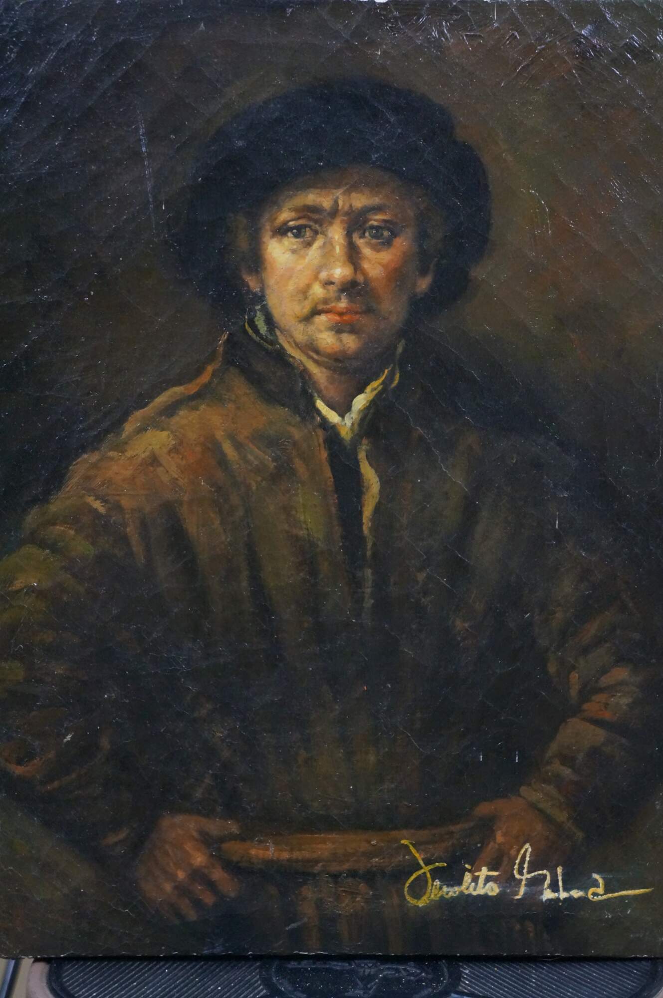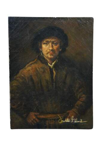 Late 20th century oil on canvas painting after a self portrait by rembrandt Van Rijn. "Painted in 1652, it is one of more than 40 painted self-portraits by Rembrandt, and was the first he had painted since 1645.[2] In composition it is different from his previous self-portraits, depicting the painter in a direct frontal pose, hands on his hips, and with an air of self-confidence. It was painted the year that his financial difficulties began, and breaks with the sumptuous finery he had worn in previous self-portraits." (Wikipedia)Signed, lower right. Unframed.