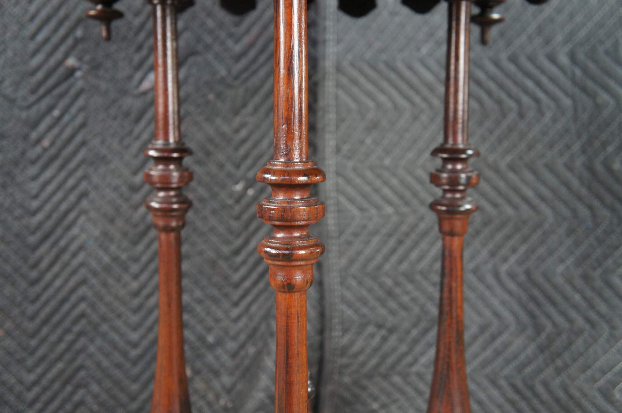Antique Victorian Gothic Revival style pedestal table. Made of walnut featuring scalloped form with turned supports, trophy shaped drop finials and pedestal base.