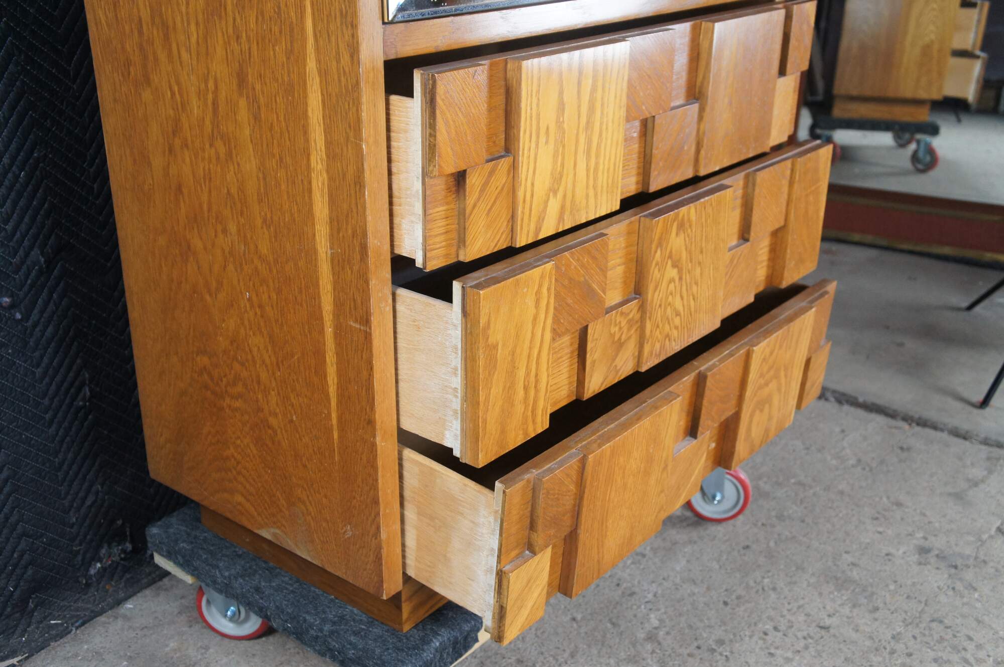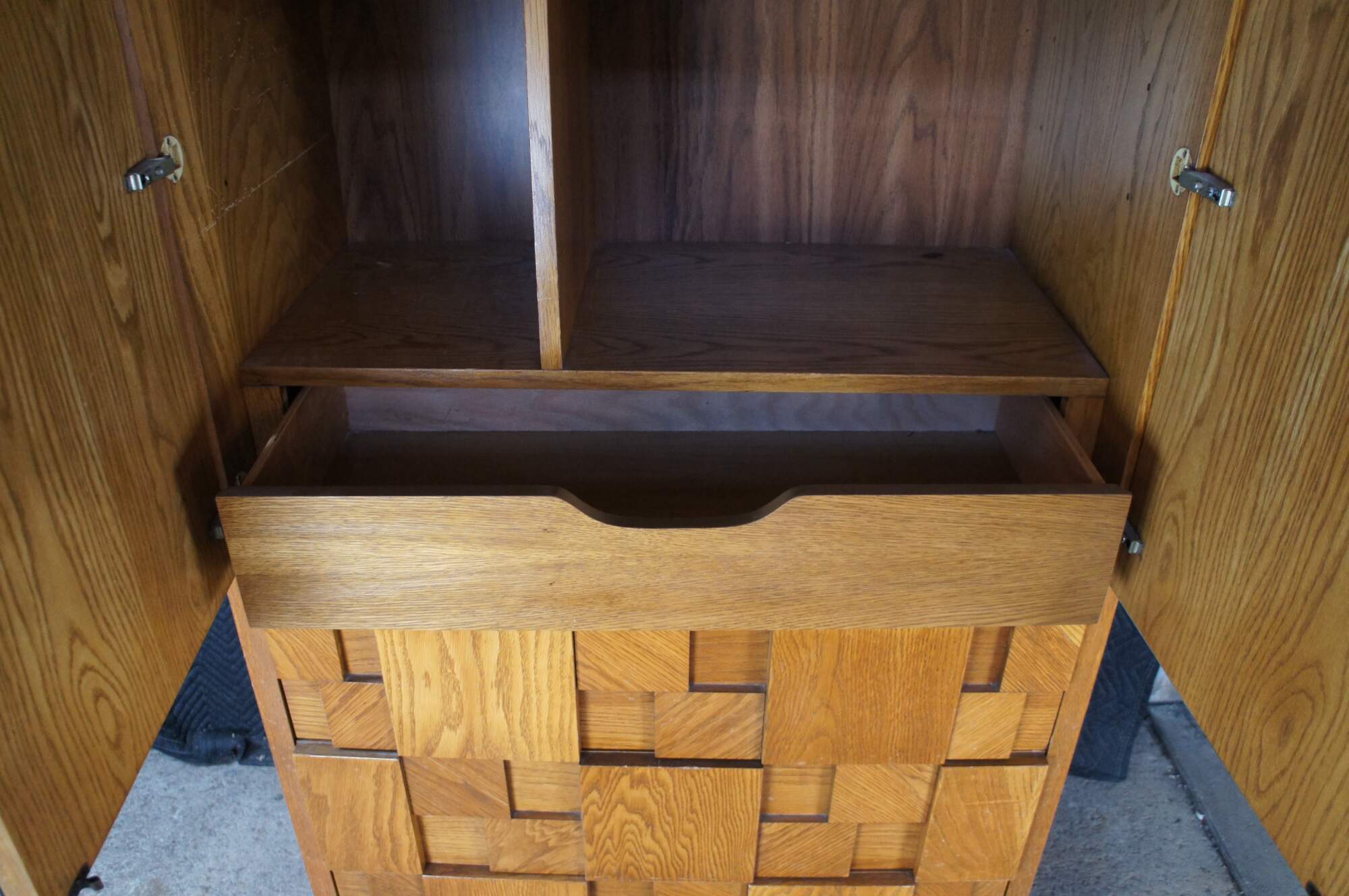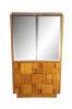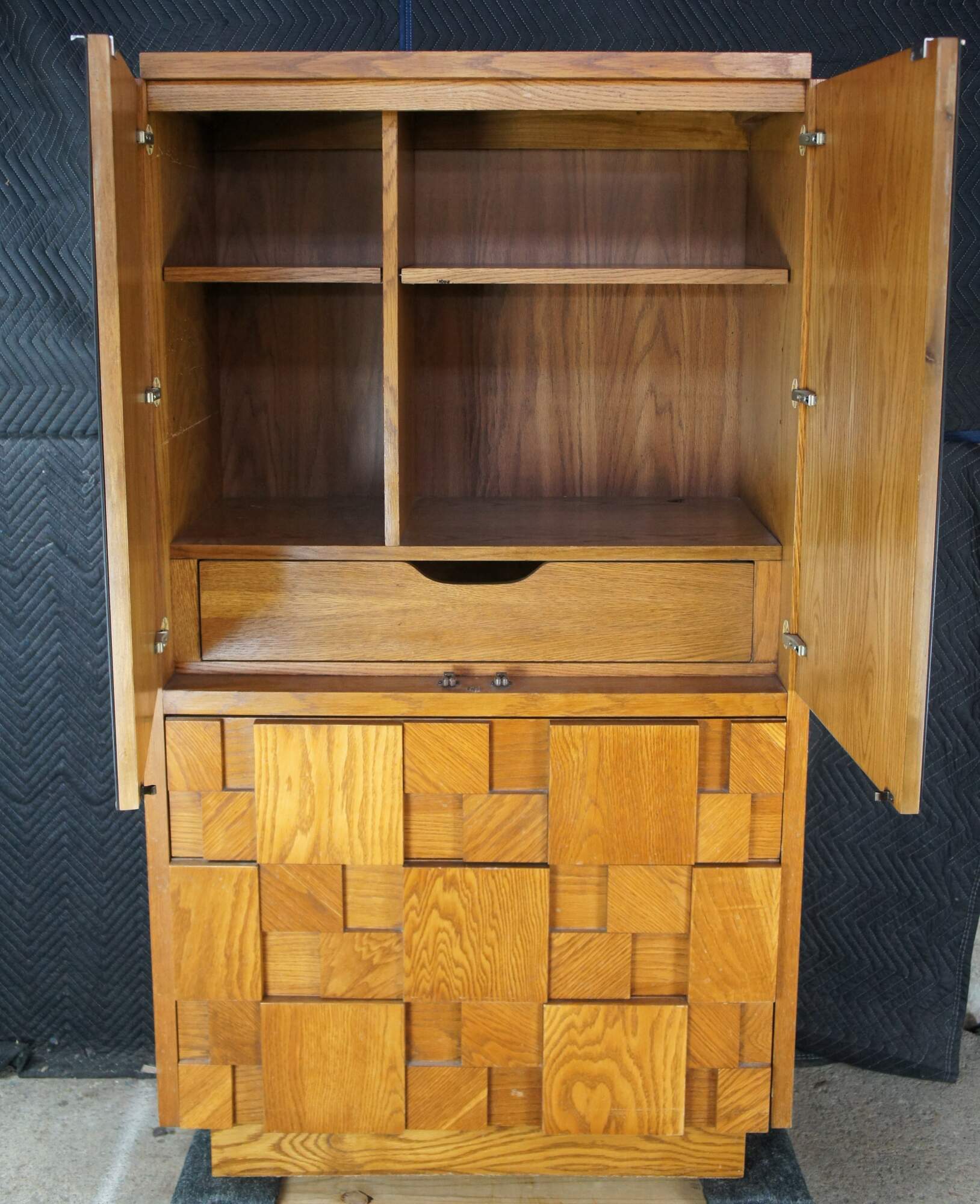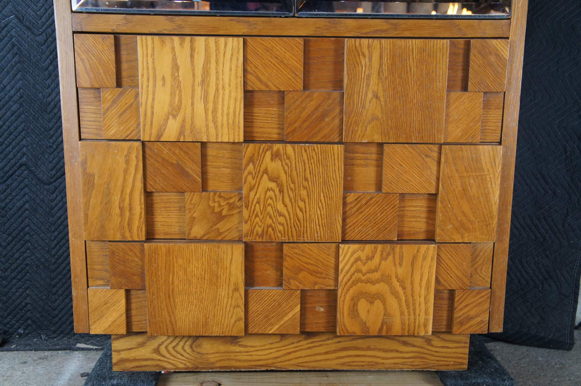 1970s Vintage Lane Furniture Staccato collection Mid Century Modern clothing armoire / linen press / cabinet. 568-14. A freestanding armoire featuring beveled and smoked mirrored glass doors that open to a divided interior with lower drawer. The cabinet base showcases Lanes iconic cubed brutalist form with three dovetailed oak drawers that open via a groove along the underside. The wardrobe is supported by a plinth base. Manufactured June, 13th 1979.
