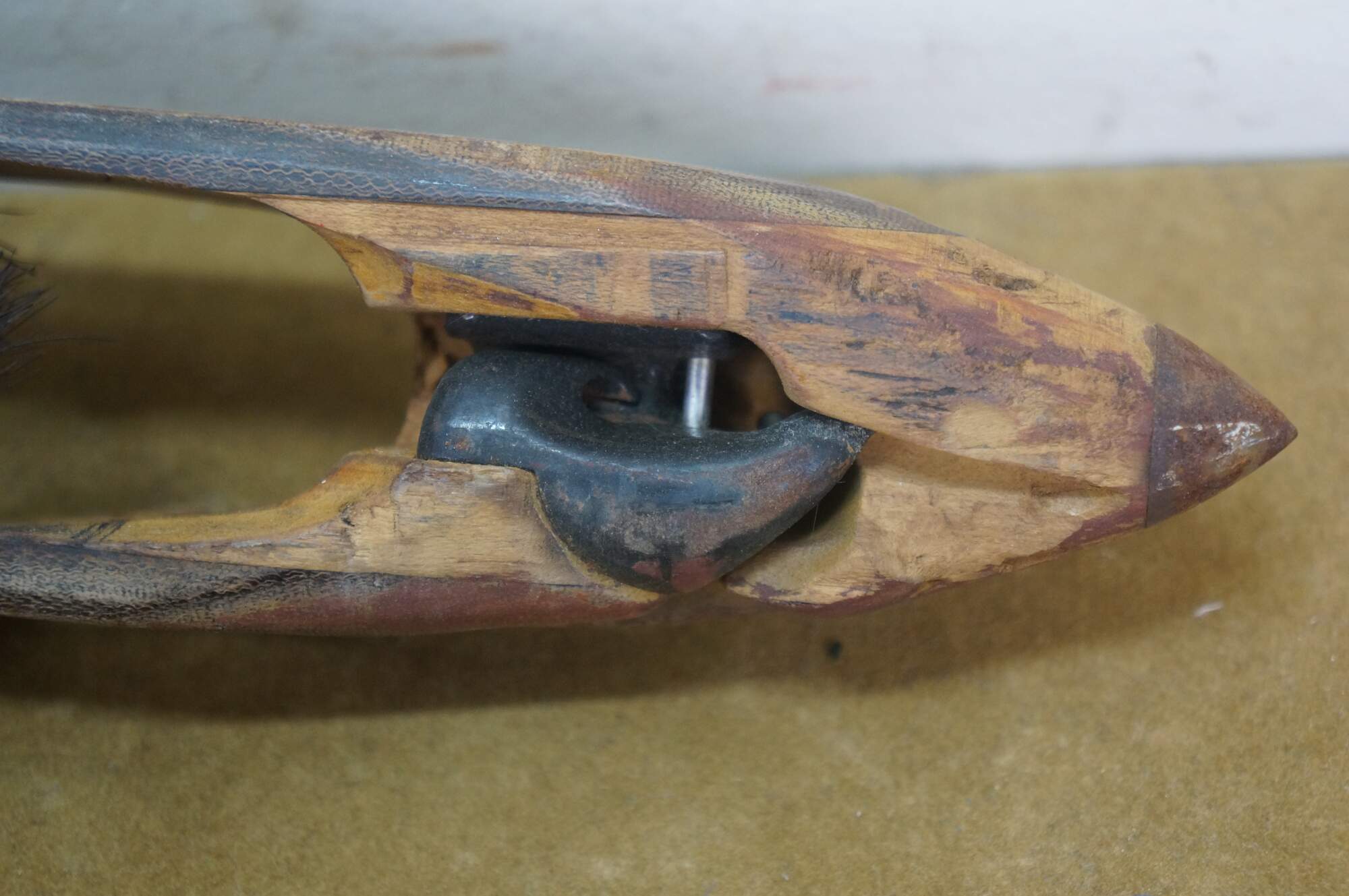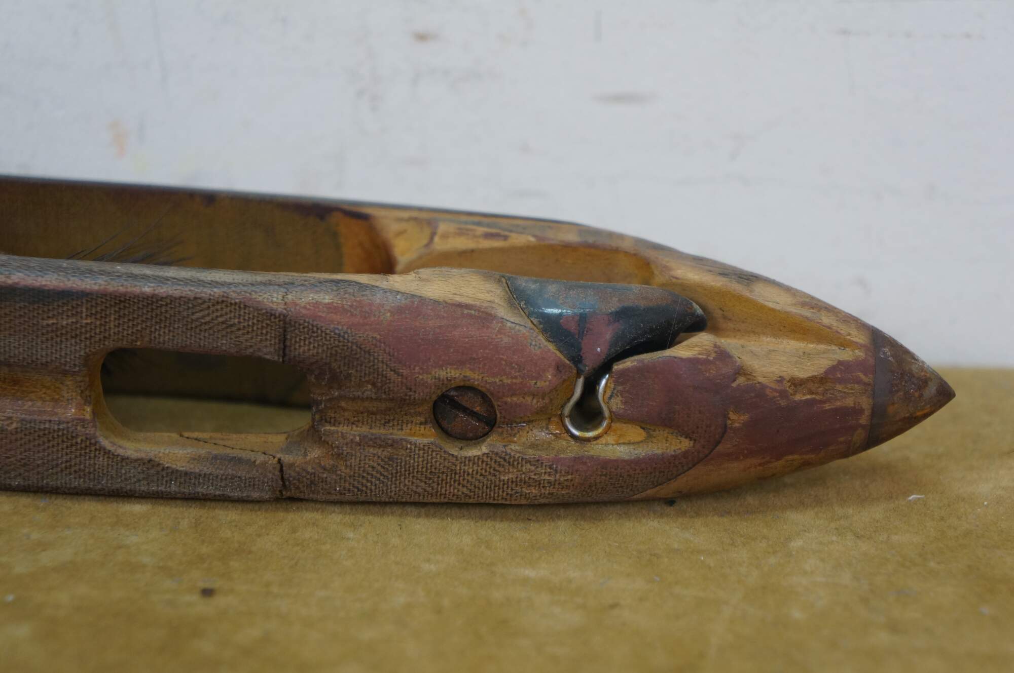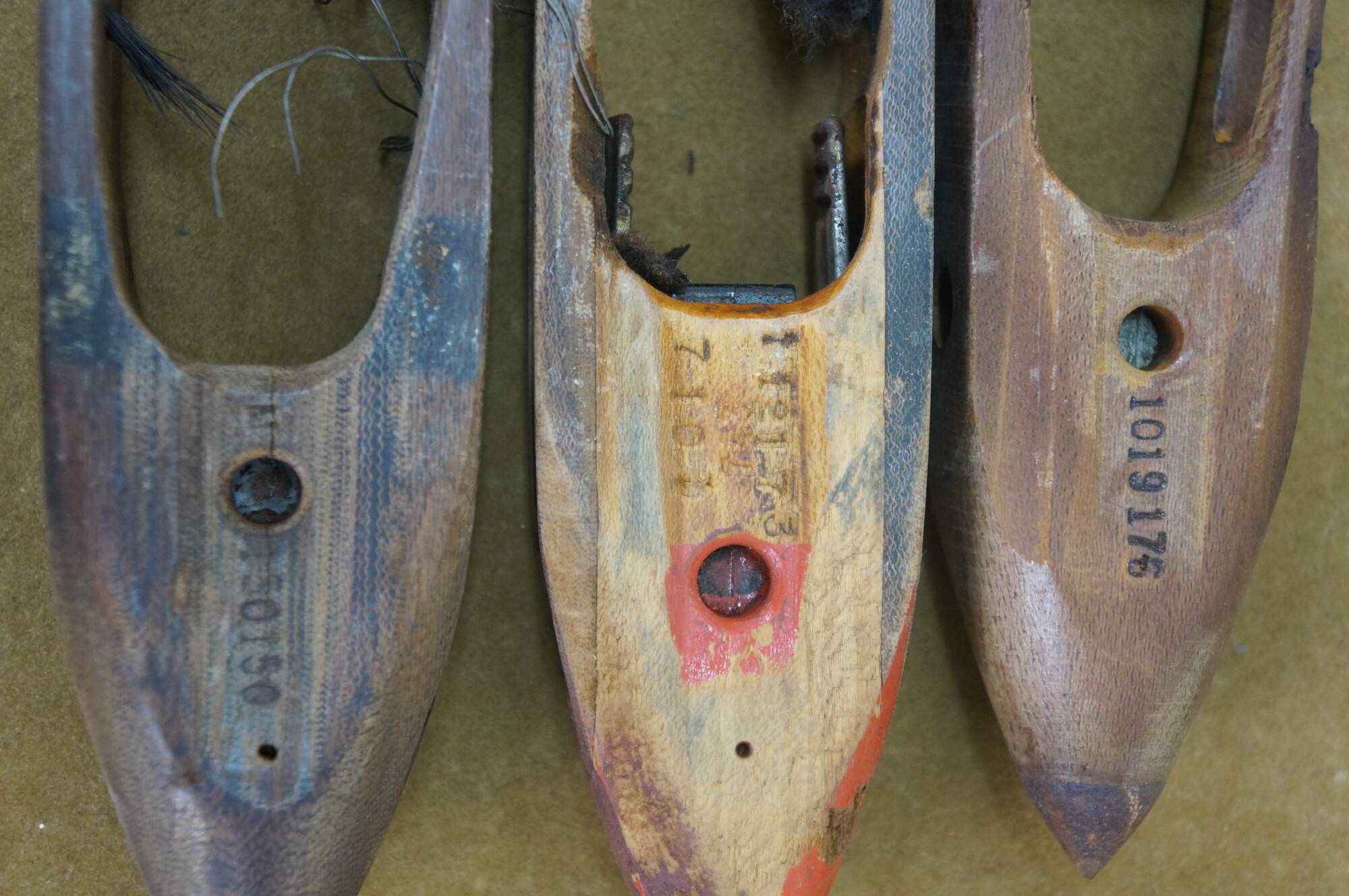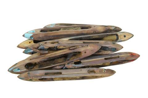 Collection of 10 antique 20th century boat shuttles / flying shuttles. Made of wood with metal tops and mechanism with strips of fur and small brushes lining the spool compartment / opening.