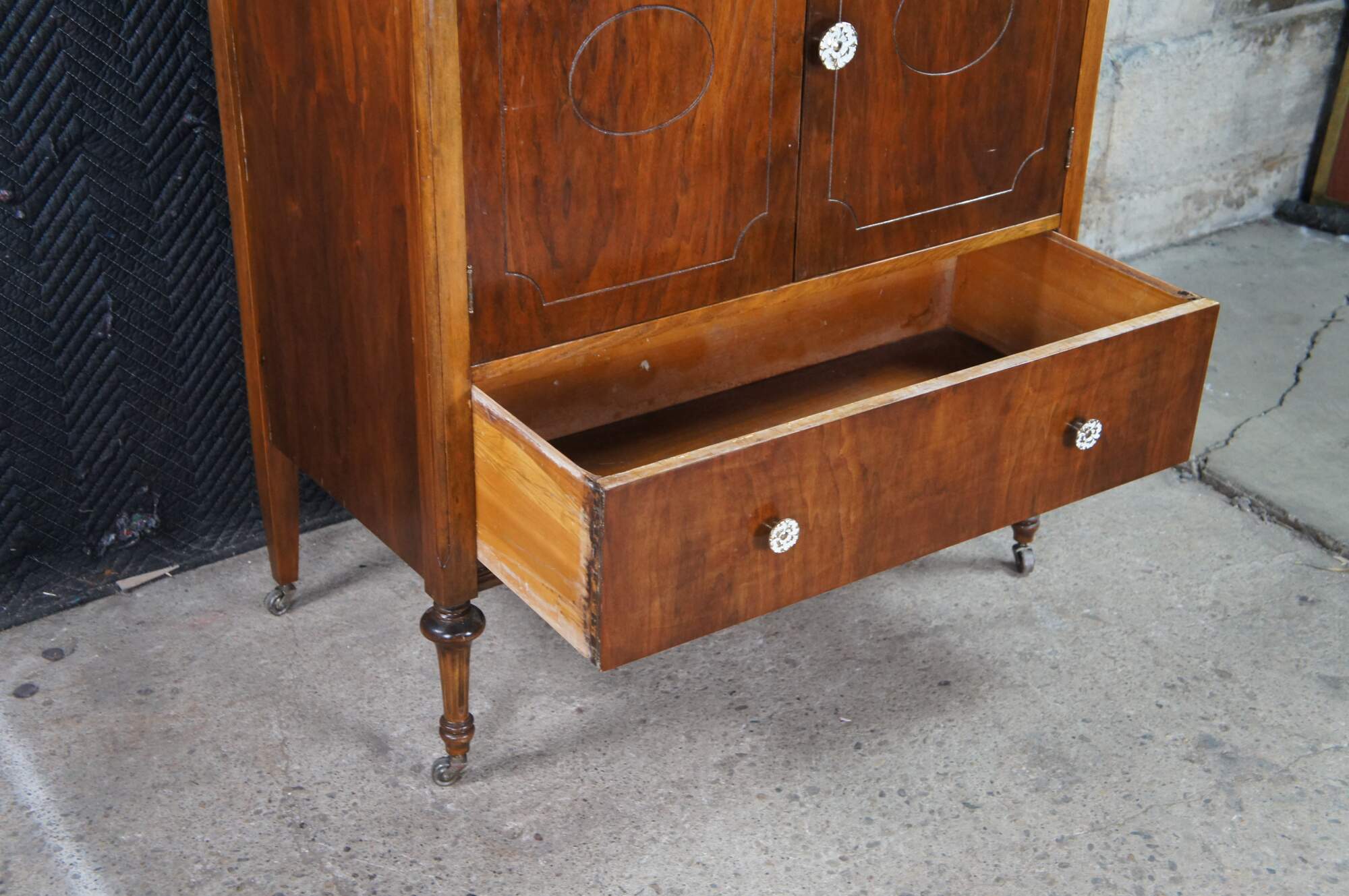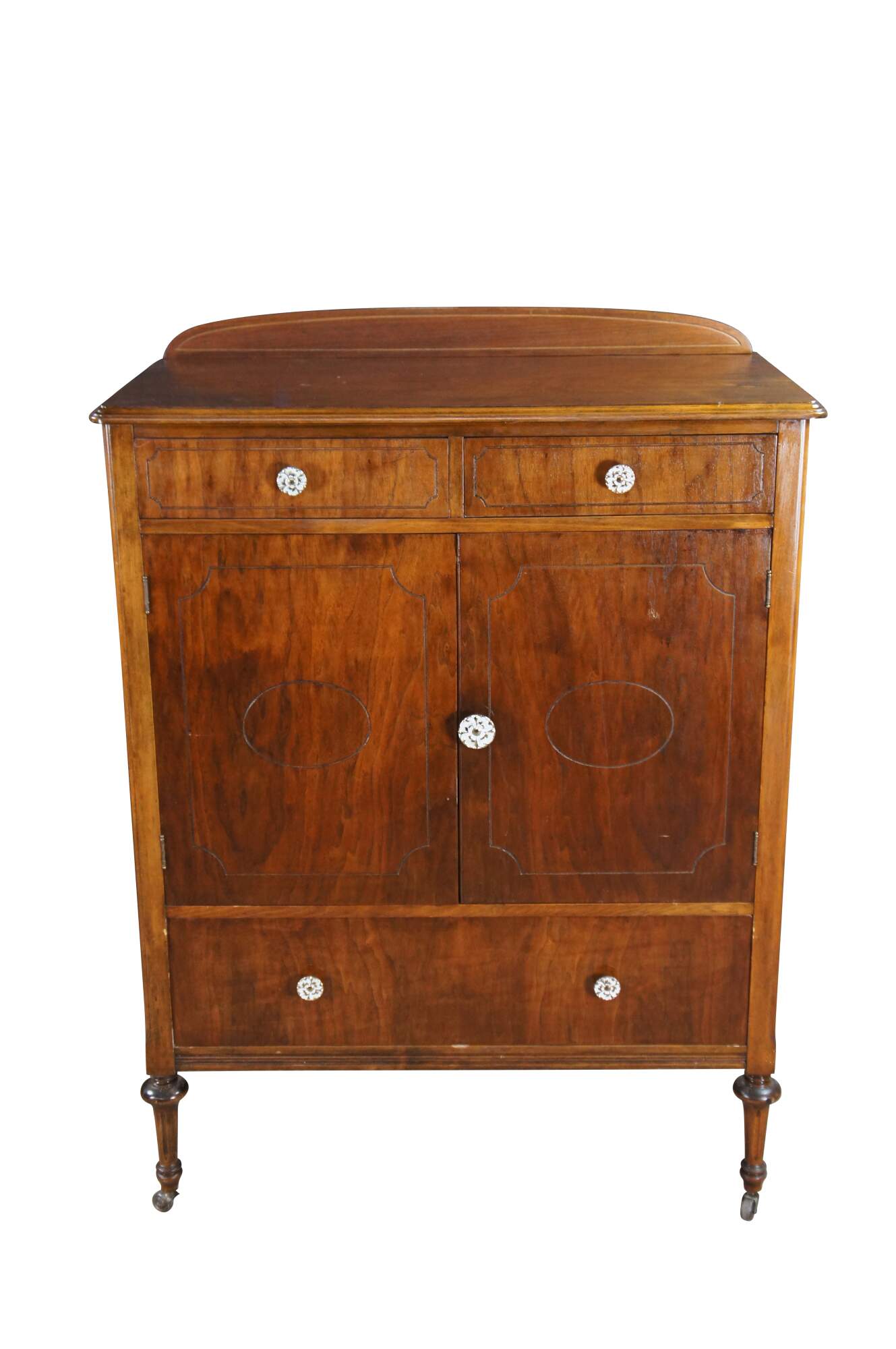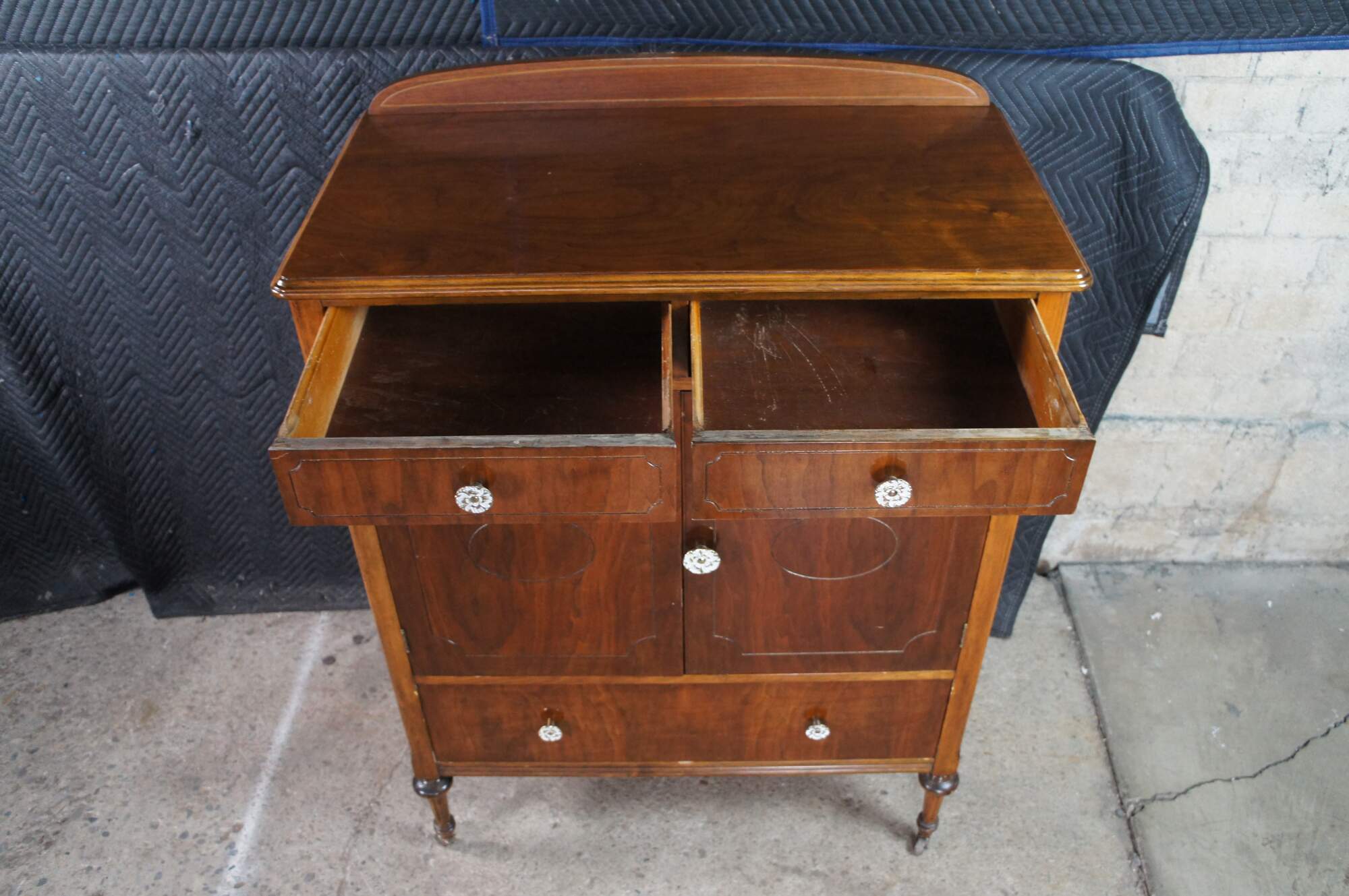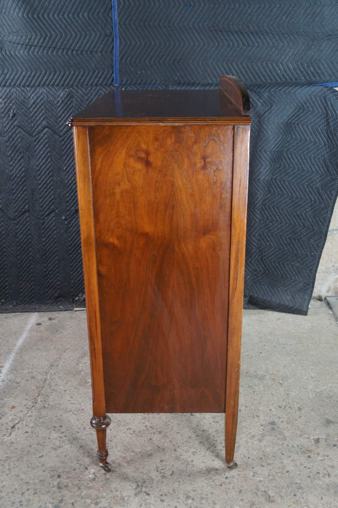 Antique Victorian gentleman's chest. Made of walnut featuring three drawers concealed behind paneled doors, flanked by multiple drawers, and supported by turned tapered fluted legs on casters.