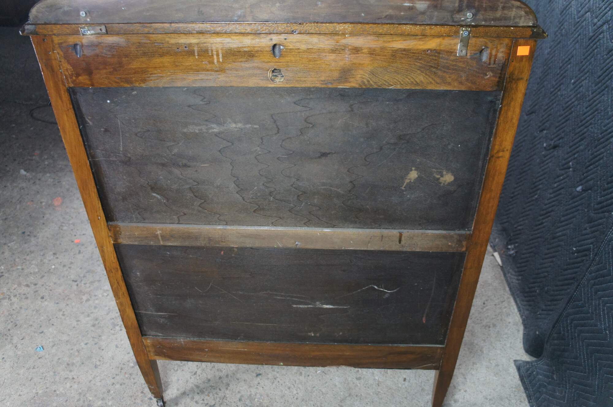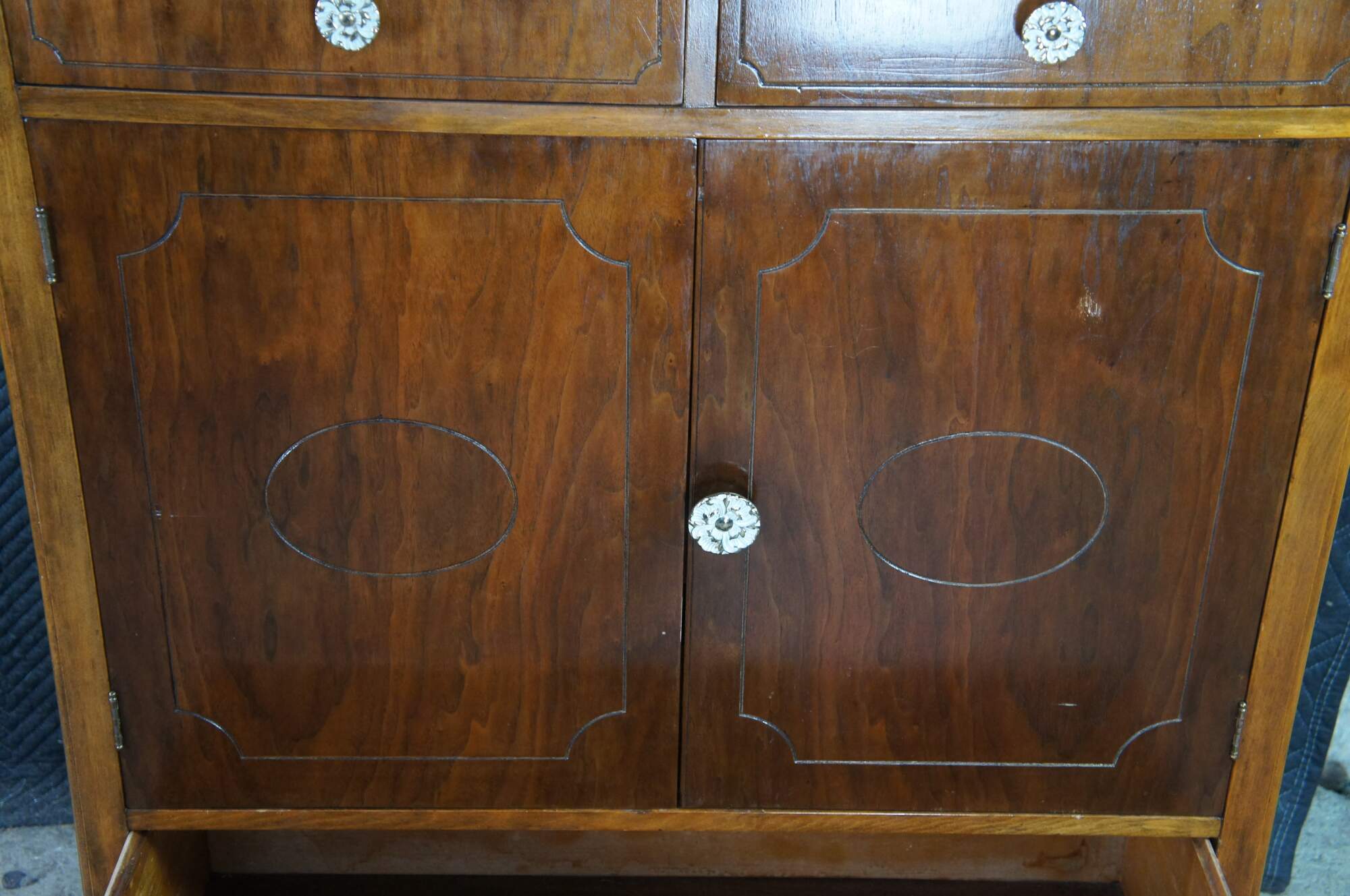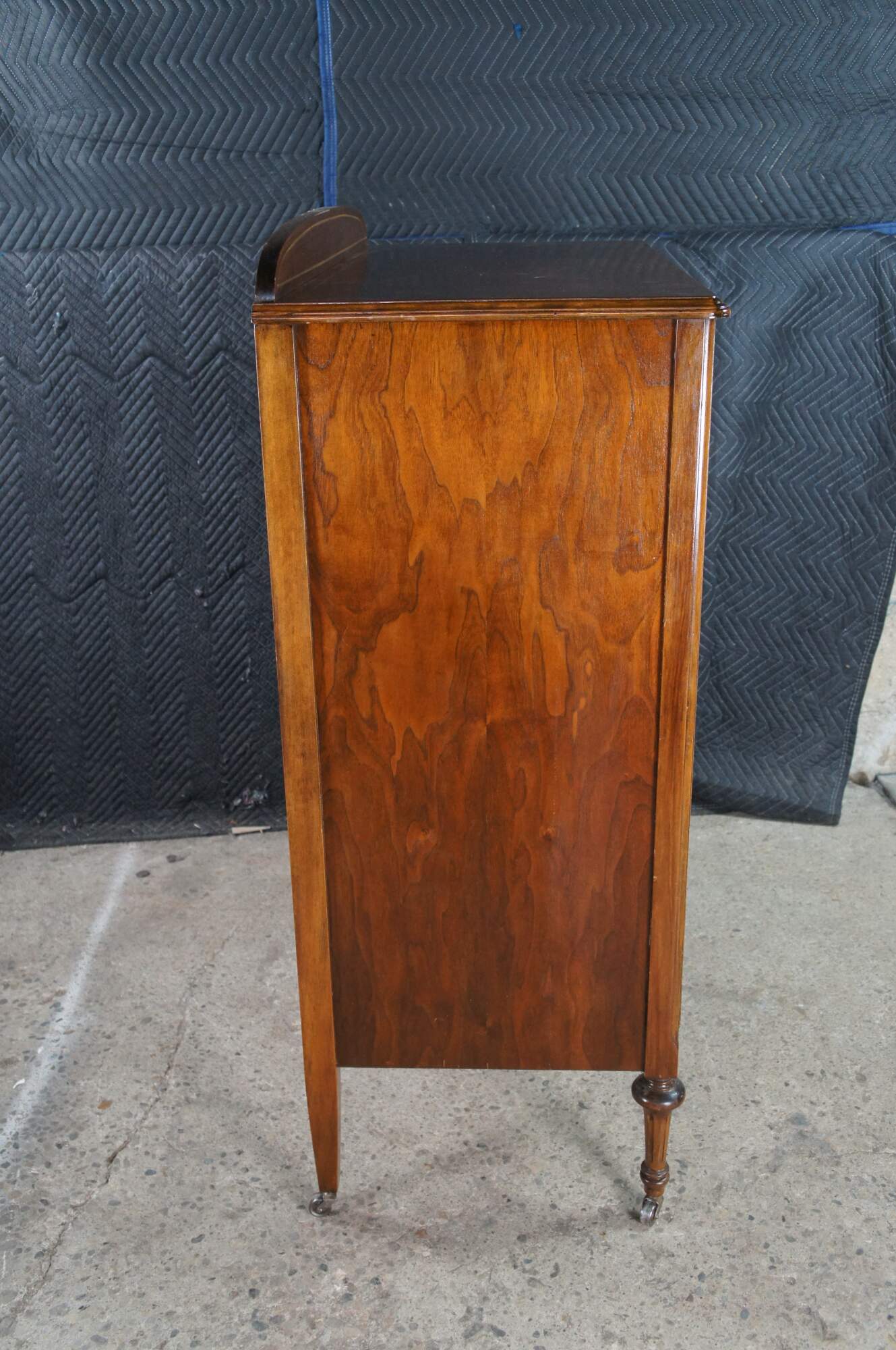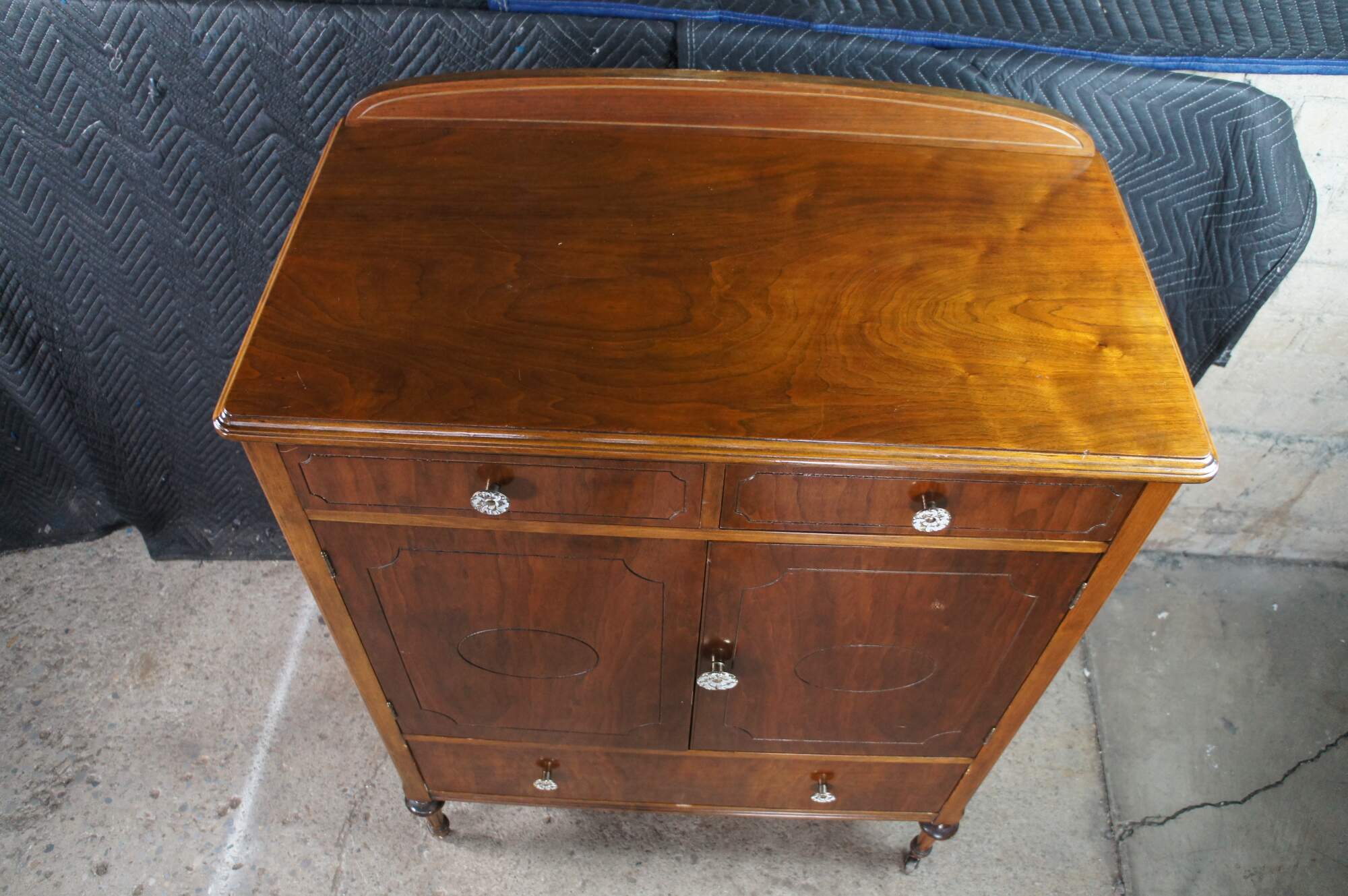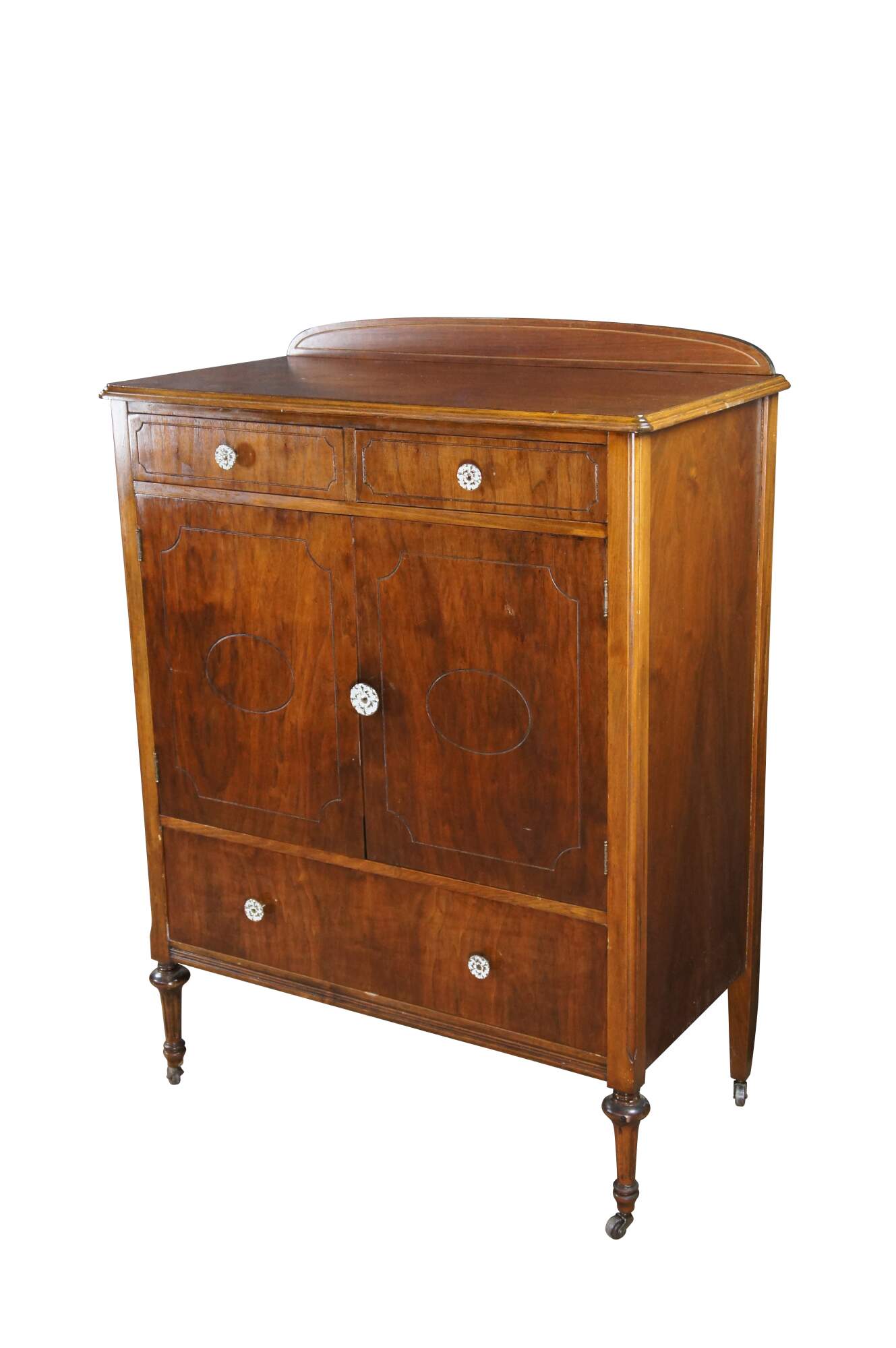 Antique Victorian gentleman's chest. Made of walnut featuring three drawers concealed behind paneled doors, flanked by multiple drawers, and supported by turned tapered fluted legs on casters.