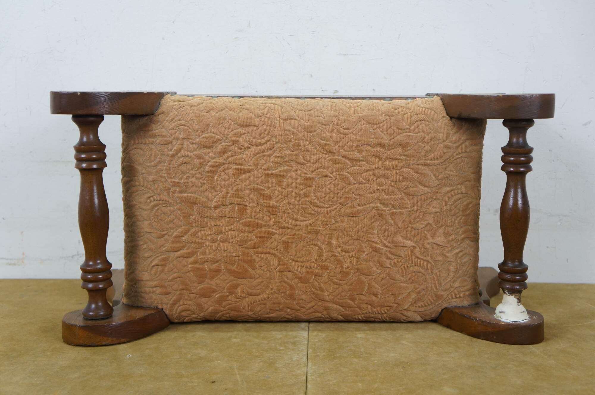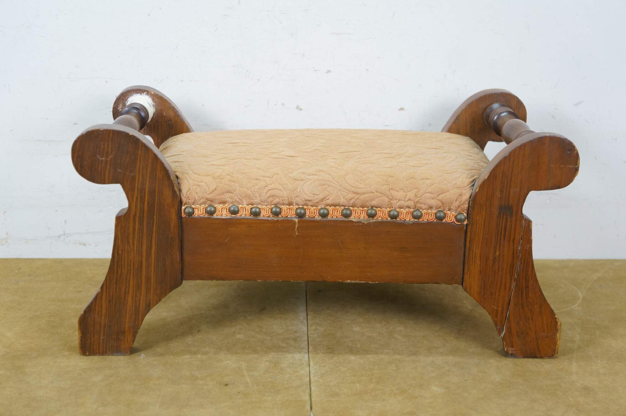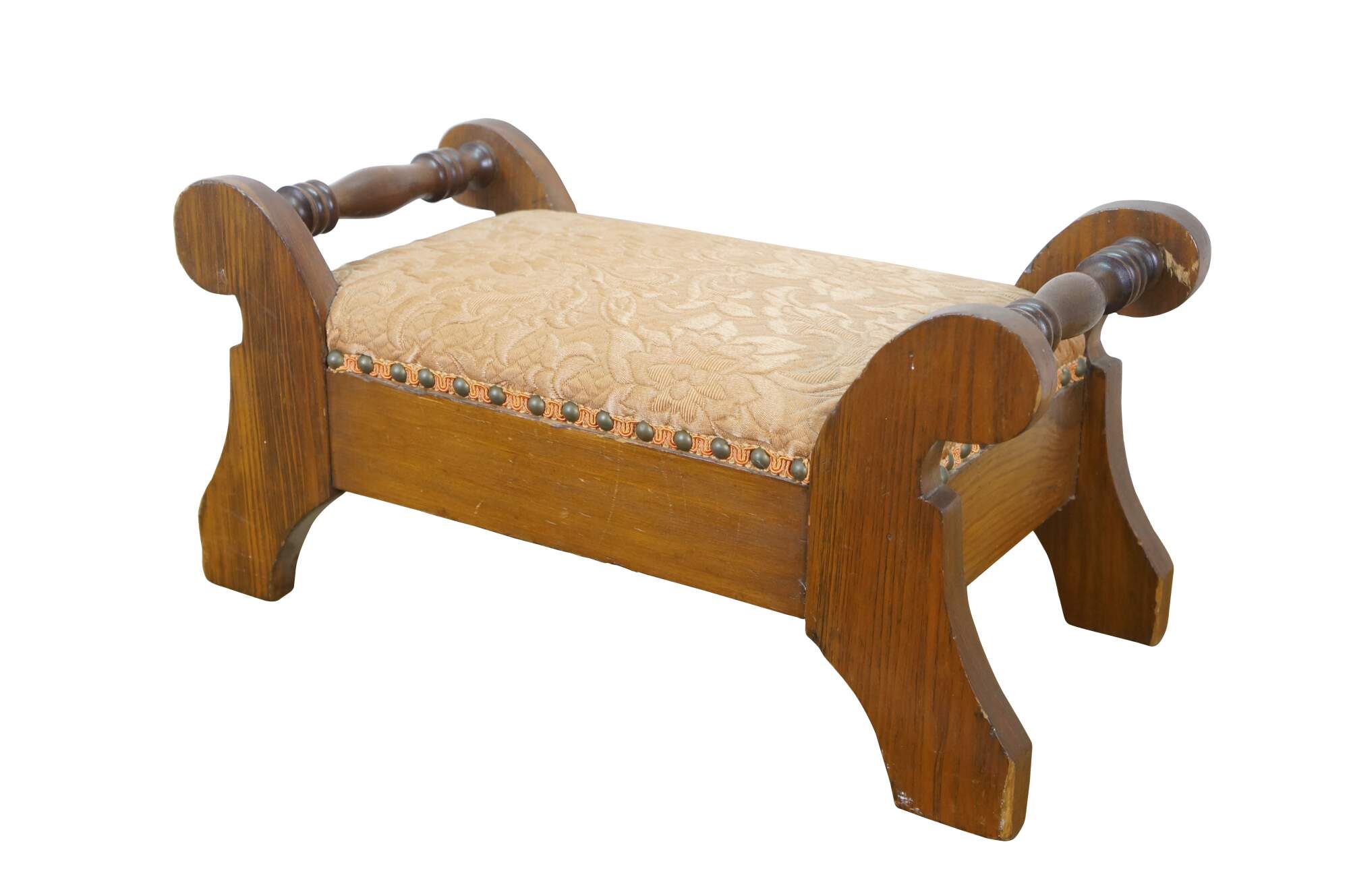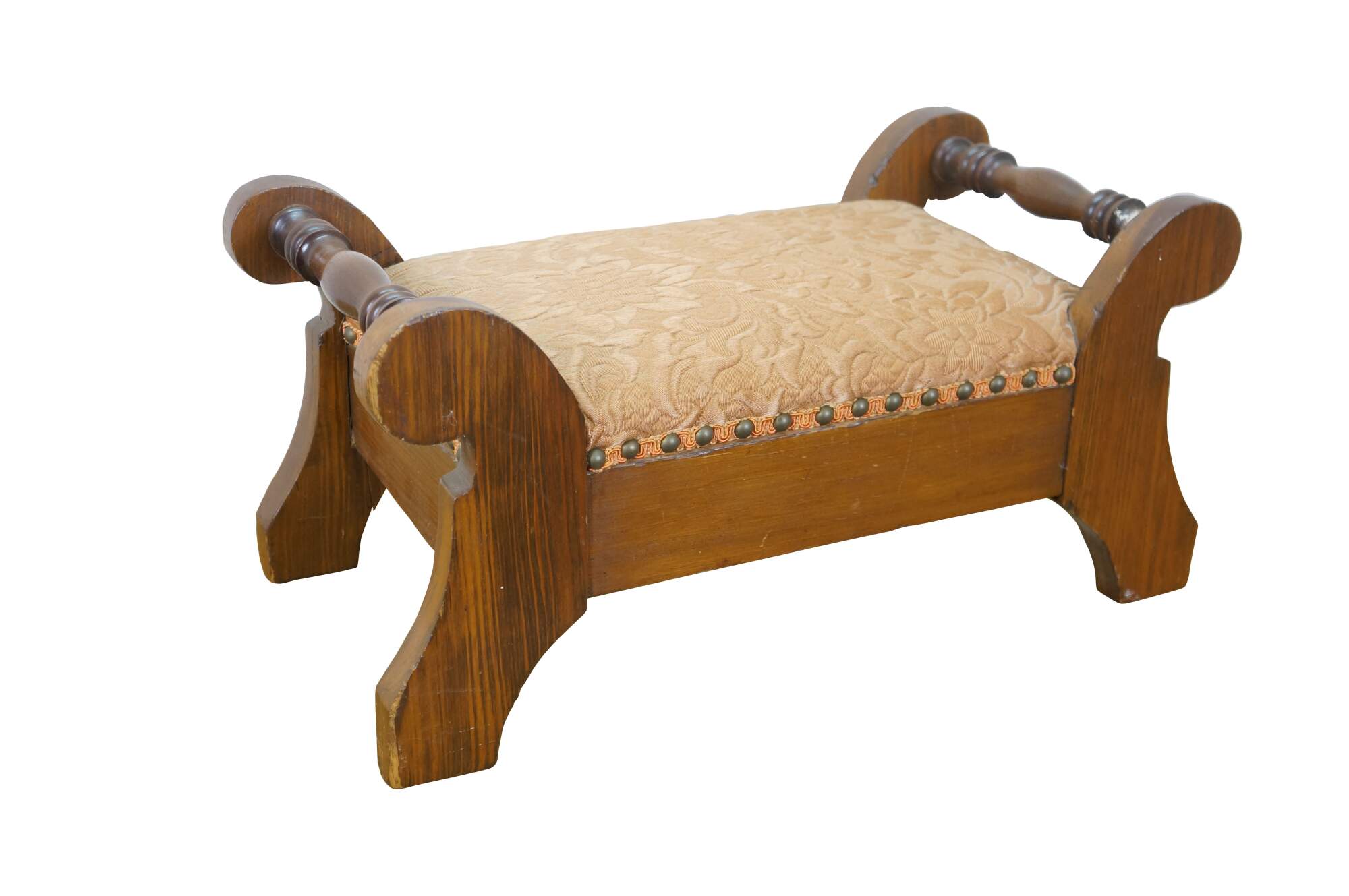 Antique Early American pine foot stool / foot rest - rectangular sleigh shaped frame with turned wood handles, top upholstered in peach tufted floral fabric and nail head trim.