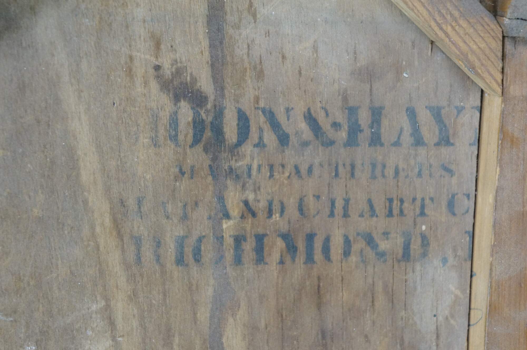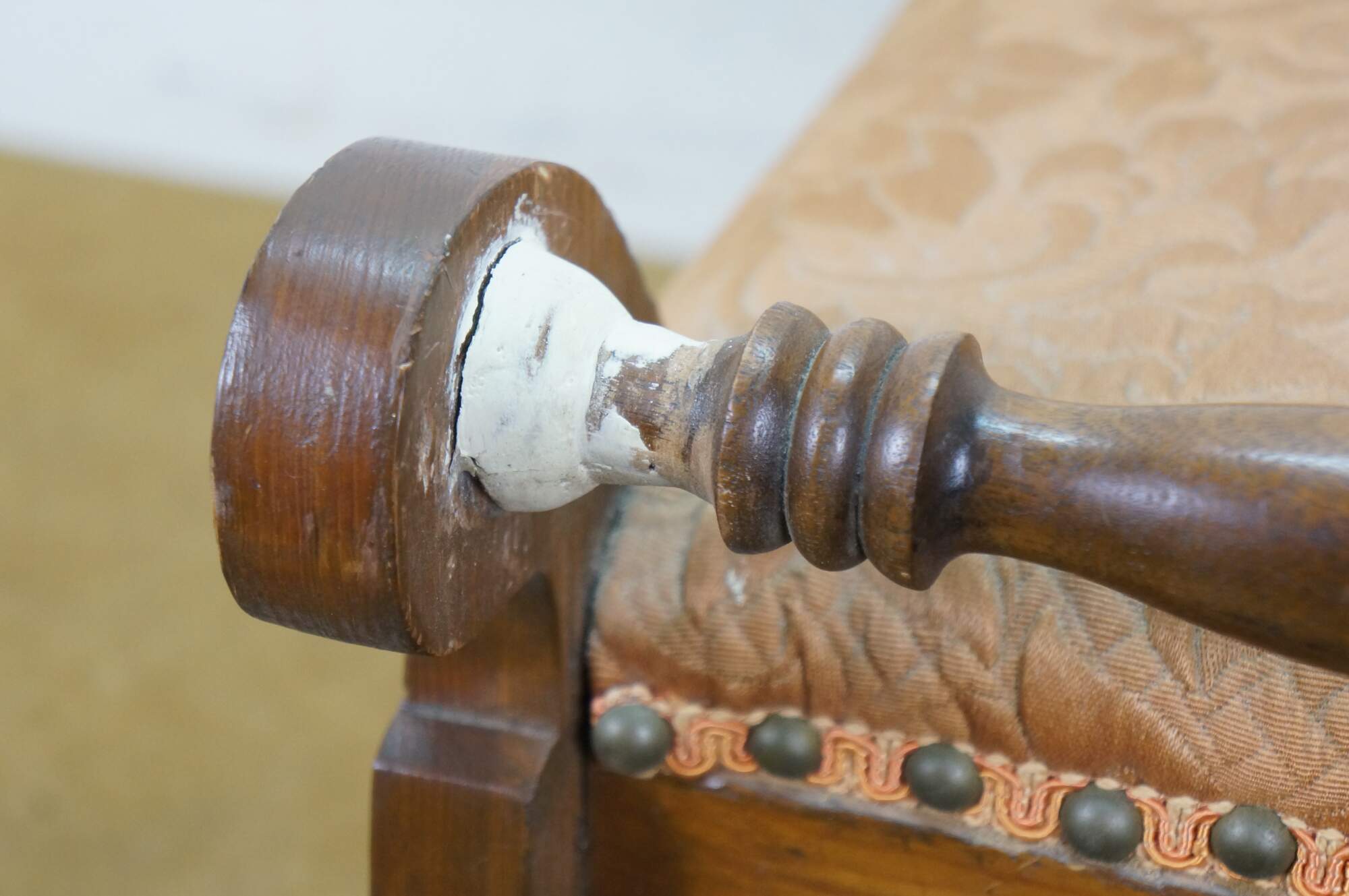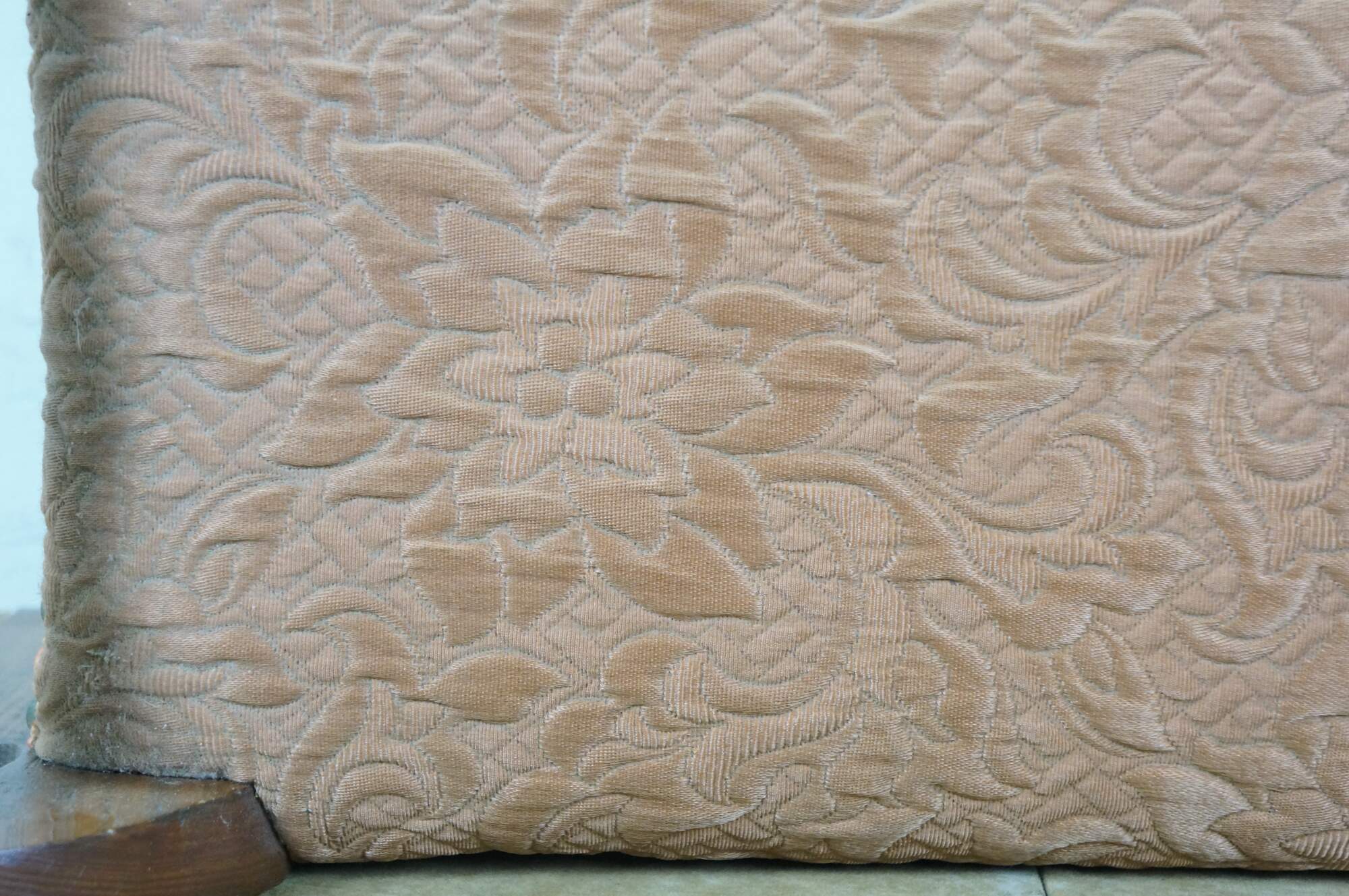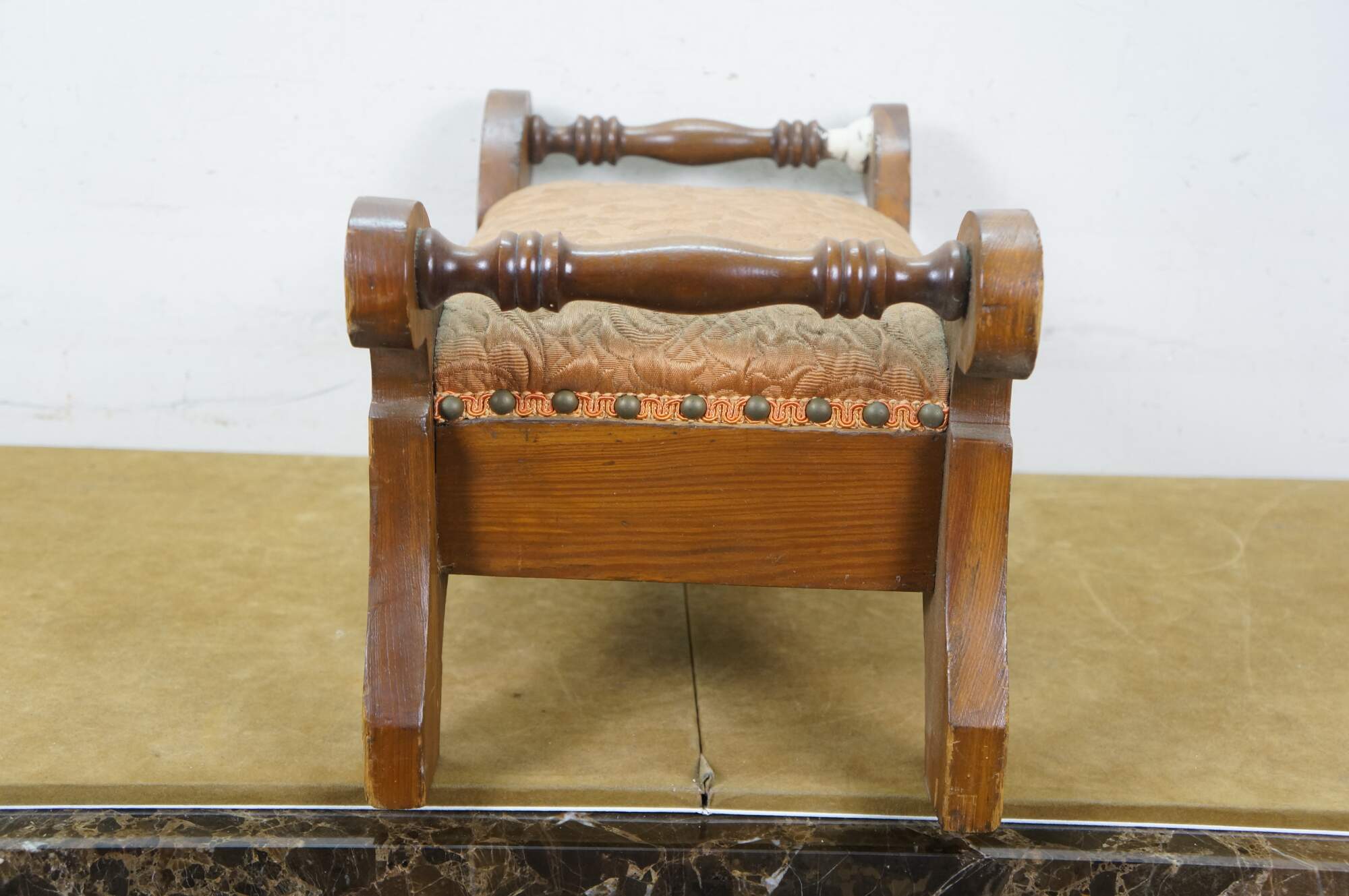 Antique Early American pine foot stool / foot rest - rectangular sleigh shaped frame with turned wood handles, top upholstered in peach tufted floral fabric and nail head trim.