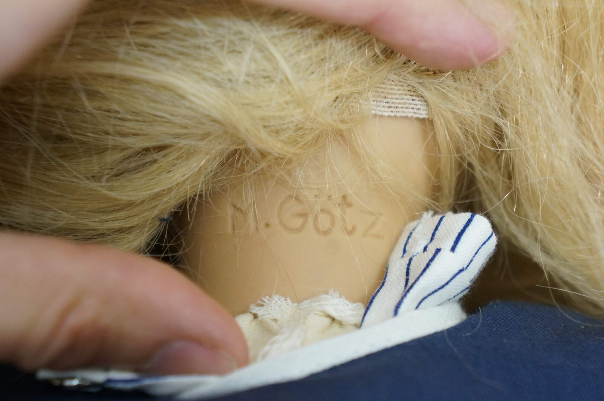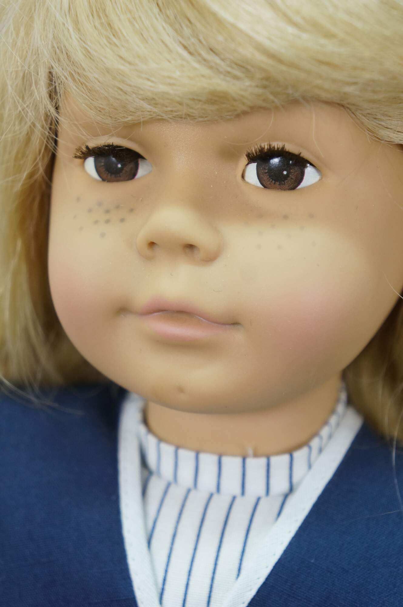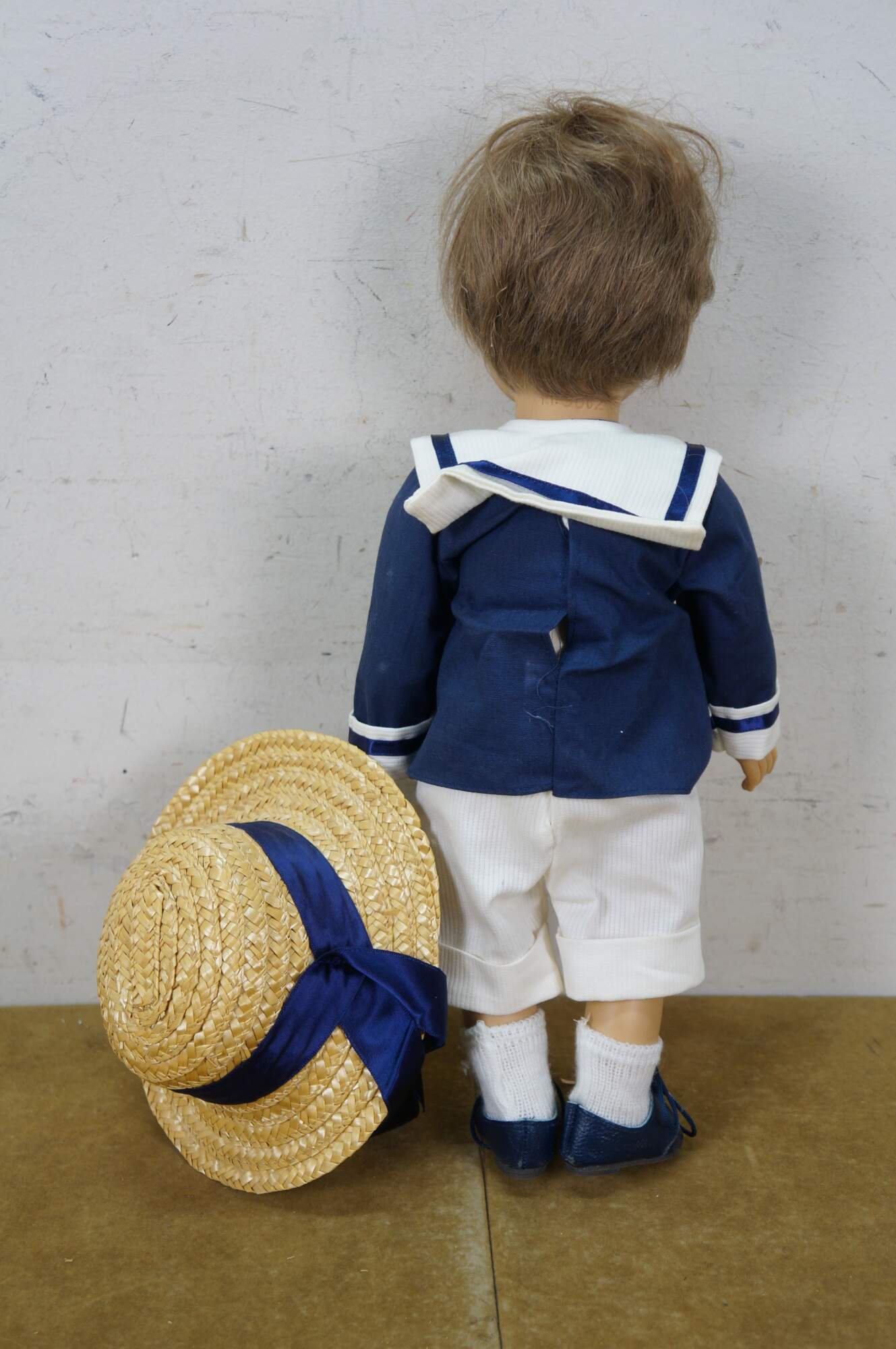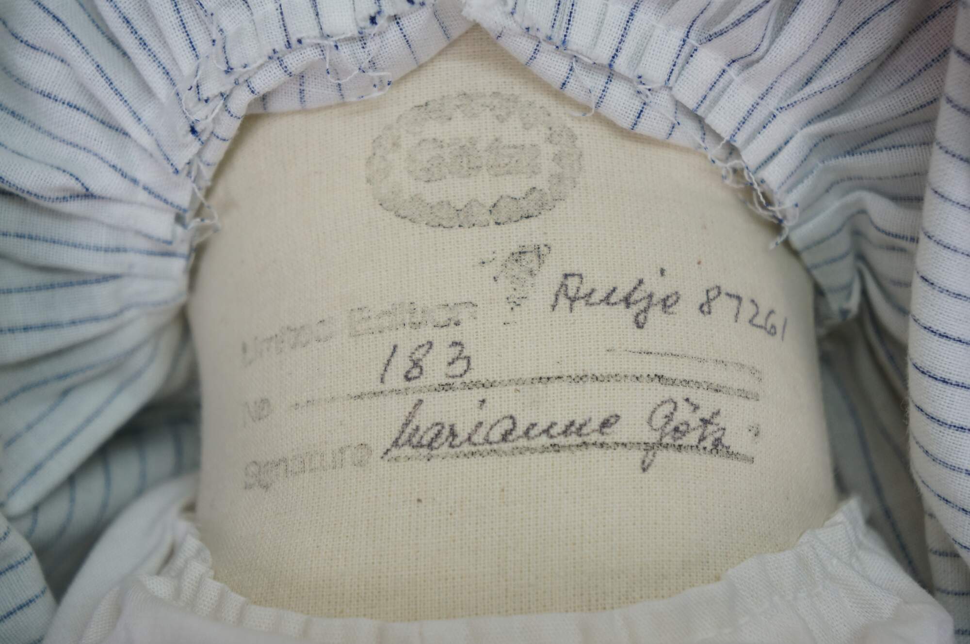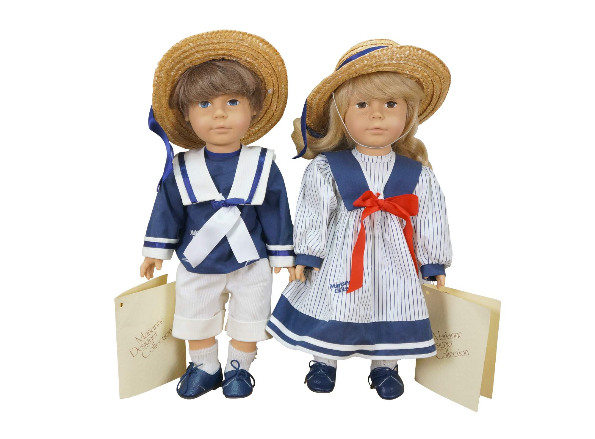 Pair of 1988 limited edition signed German Marianne Gotz dolls, No. 183 and 158 out of 300. Hard vinyl heads, arms, and legs with stuffed cotton bodies. Both dressed in blue and white sailor suits, white socks, blue leather shoes, and straw hats. Boy doll has brown hair and blue sleep eyes with applied lashes. Girl doll has blonde hair, brown sleep eyes with applied lashes, and painted freckles. Signed and numbered on bodies. Includes Certificates of Authenticity.
