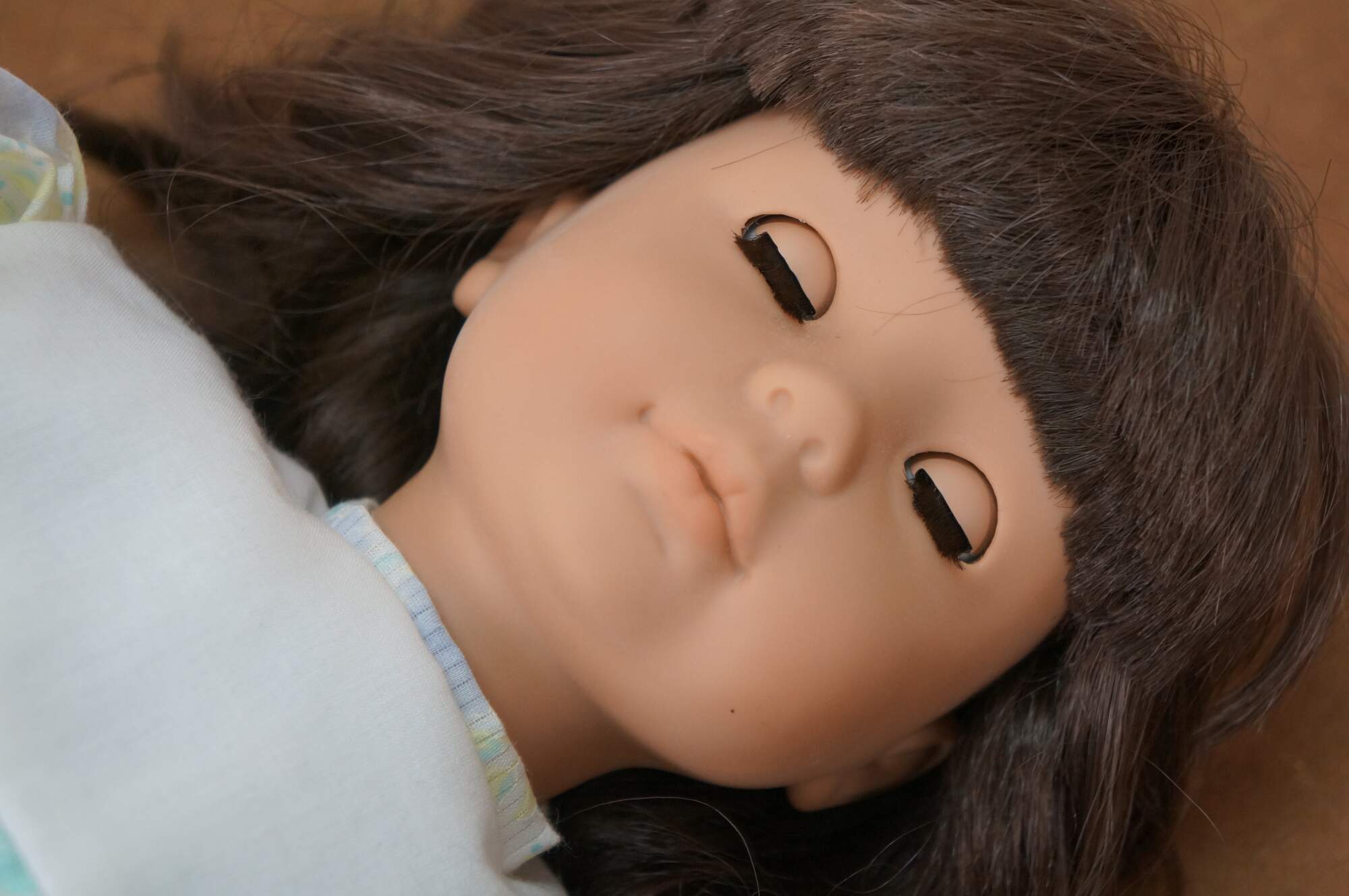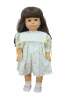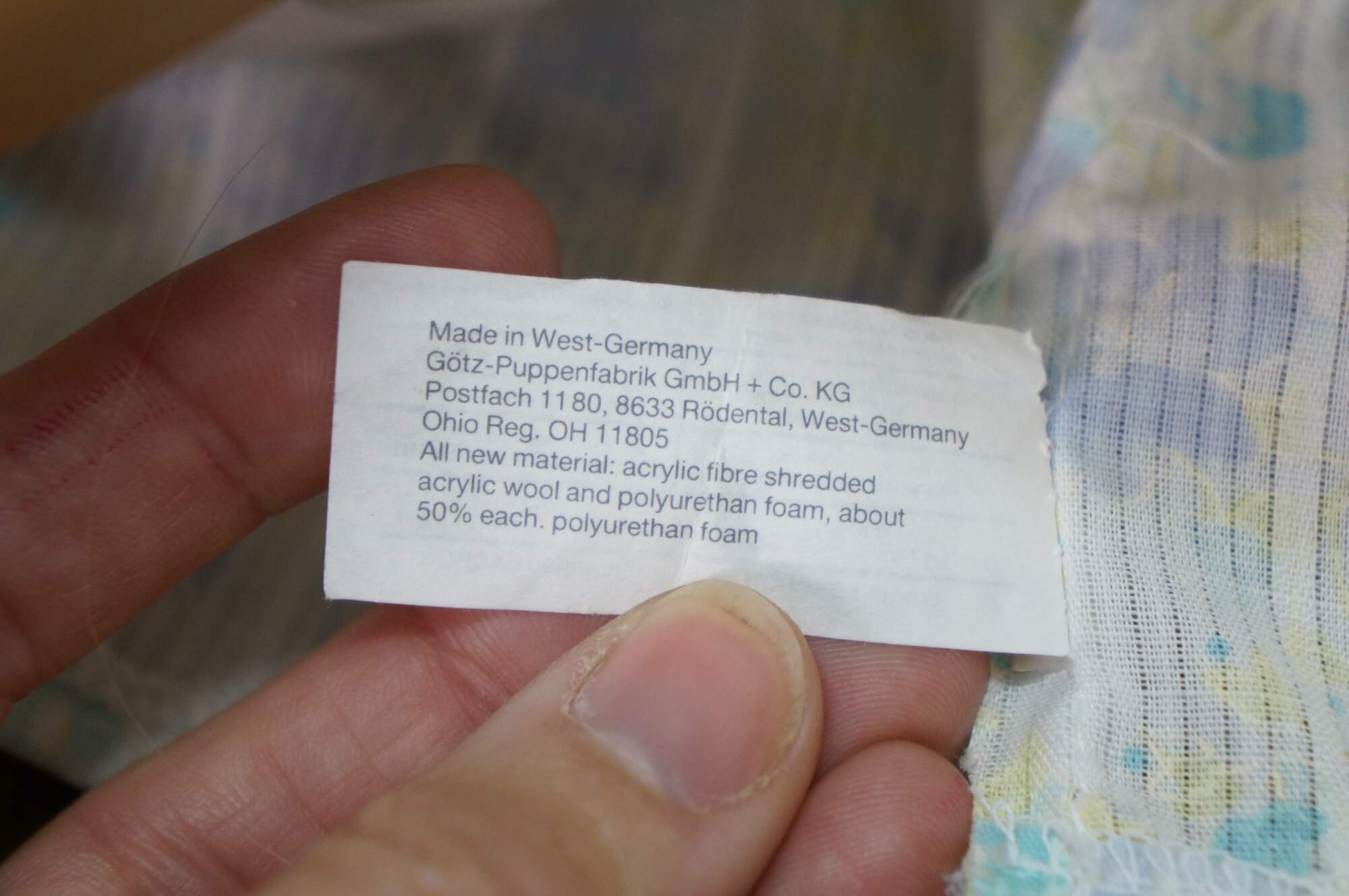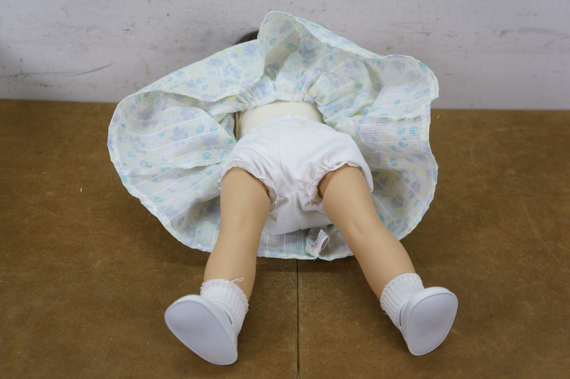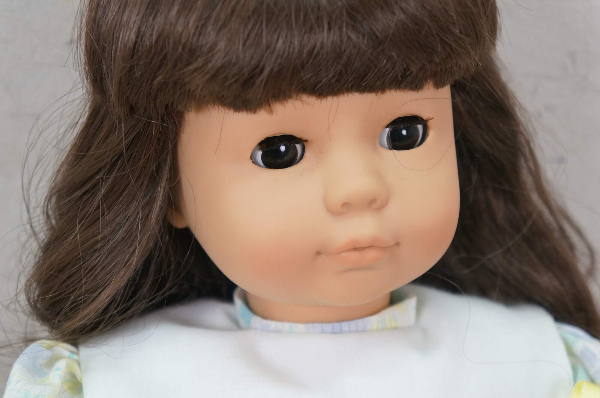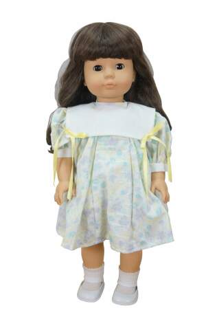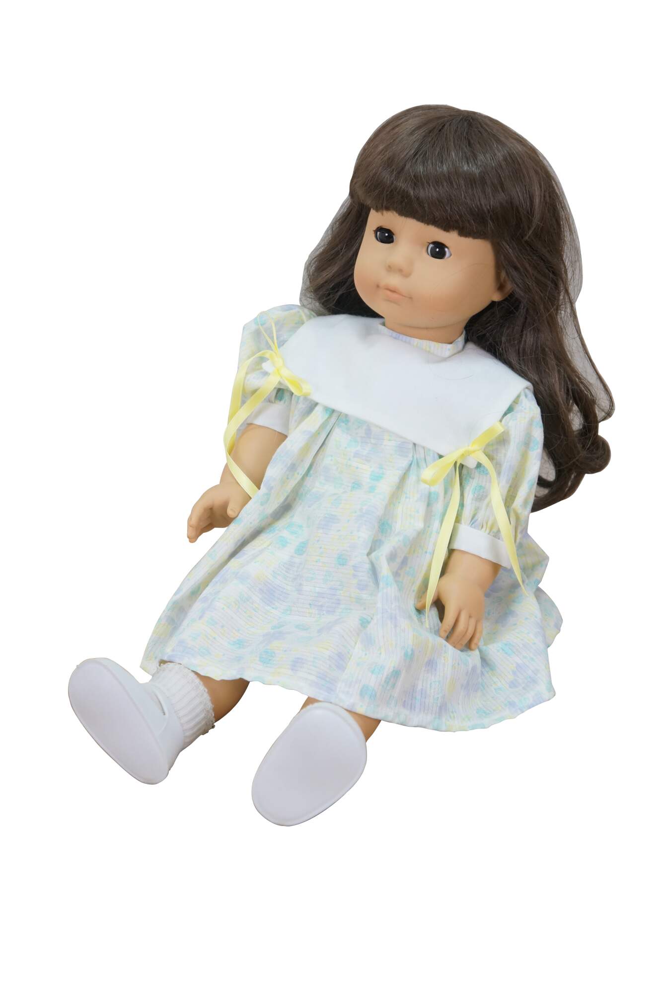 Circa 1980's Gotz-Puppe doll. Hard vinyl head, arms and legs with stuffed cotton body. Slightly parted mouth; brown sleep eyes with applied lashes. Brown hair. Dressed in blue and purple pastel floral print dress with white collar. White bloomers, socks and patent leather shoes. Made in West Germany.