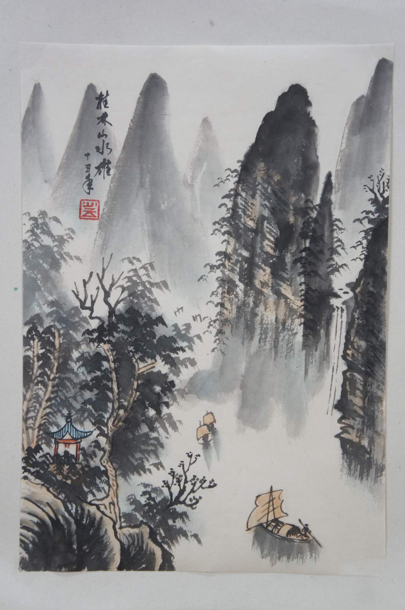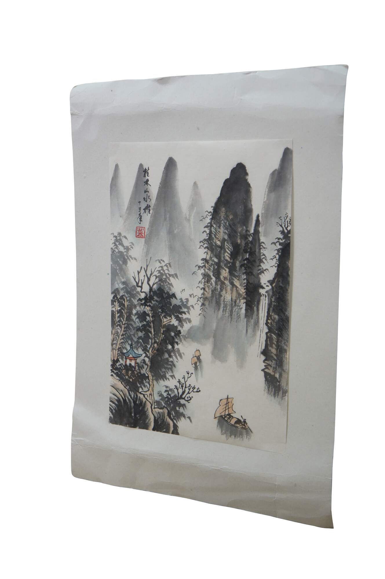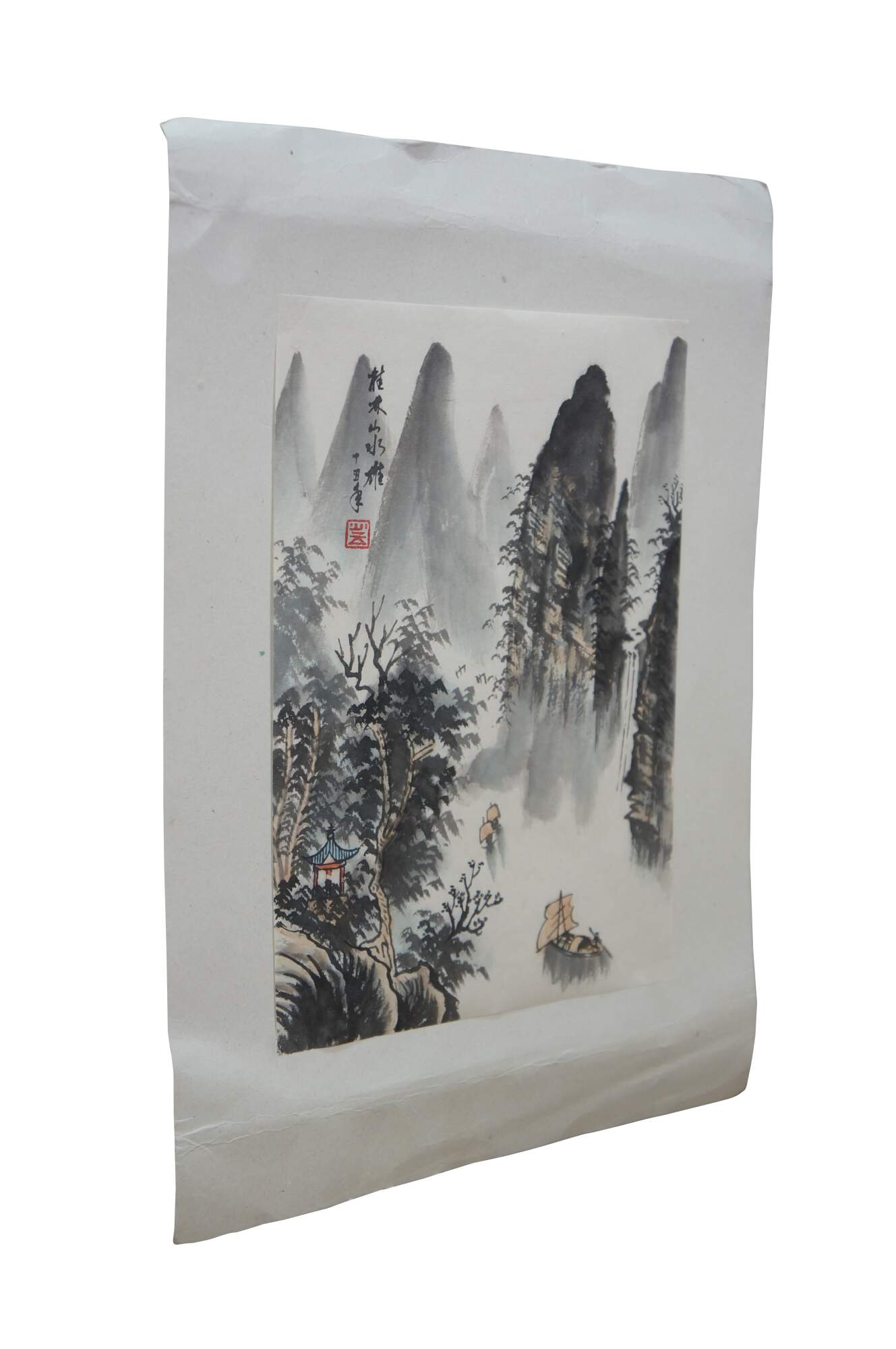 Vintage 20th century Chinese watercolor on paper painting showing a black and white landscape of mountains touched with color and water with a pair of sail boats and red and blue pagoda. Text and red signature seal at top left.