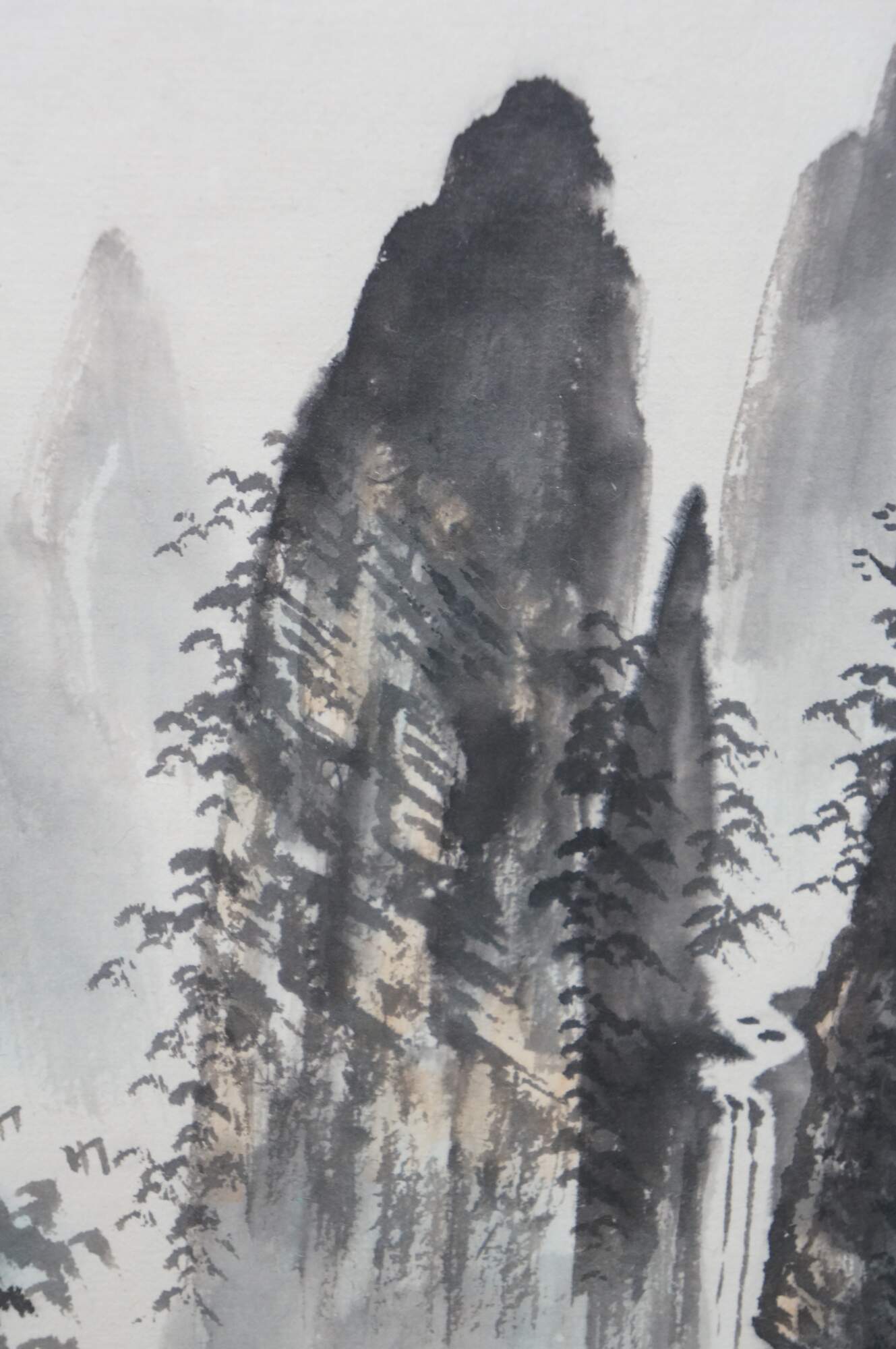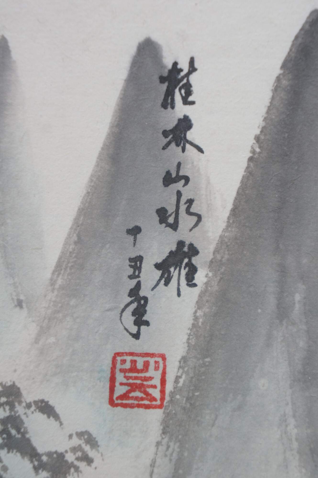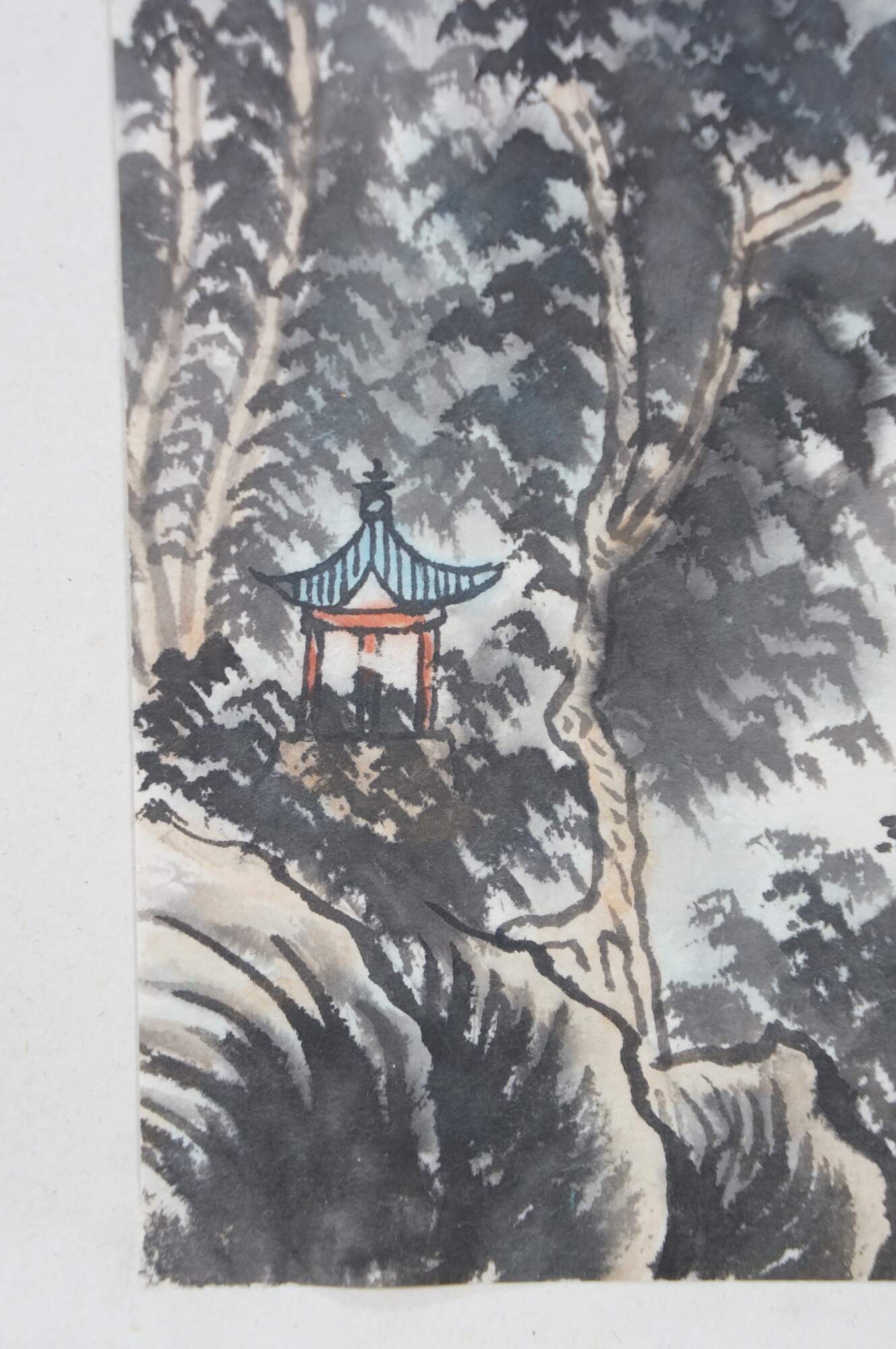 Vintage 20th century Chinese watercolor on paper painting showing a black and white landscape of mountains touched with color and water with a pair of sail boats and red and blue pagoda. Text and red signature seal at top left.