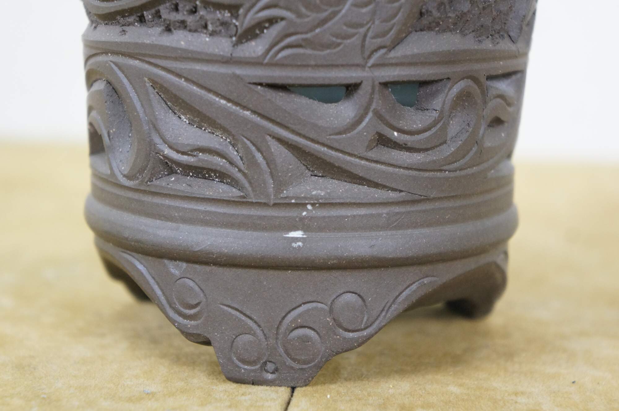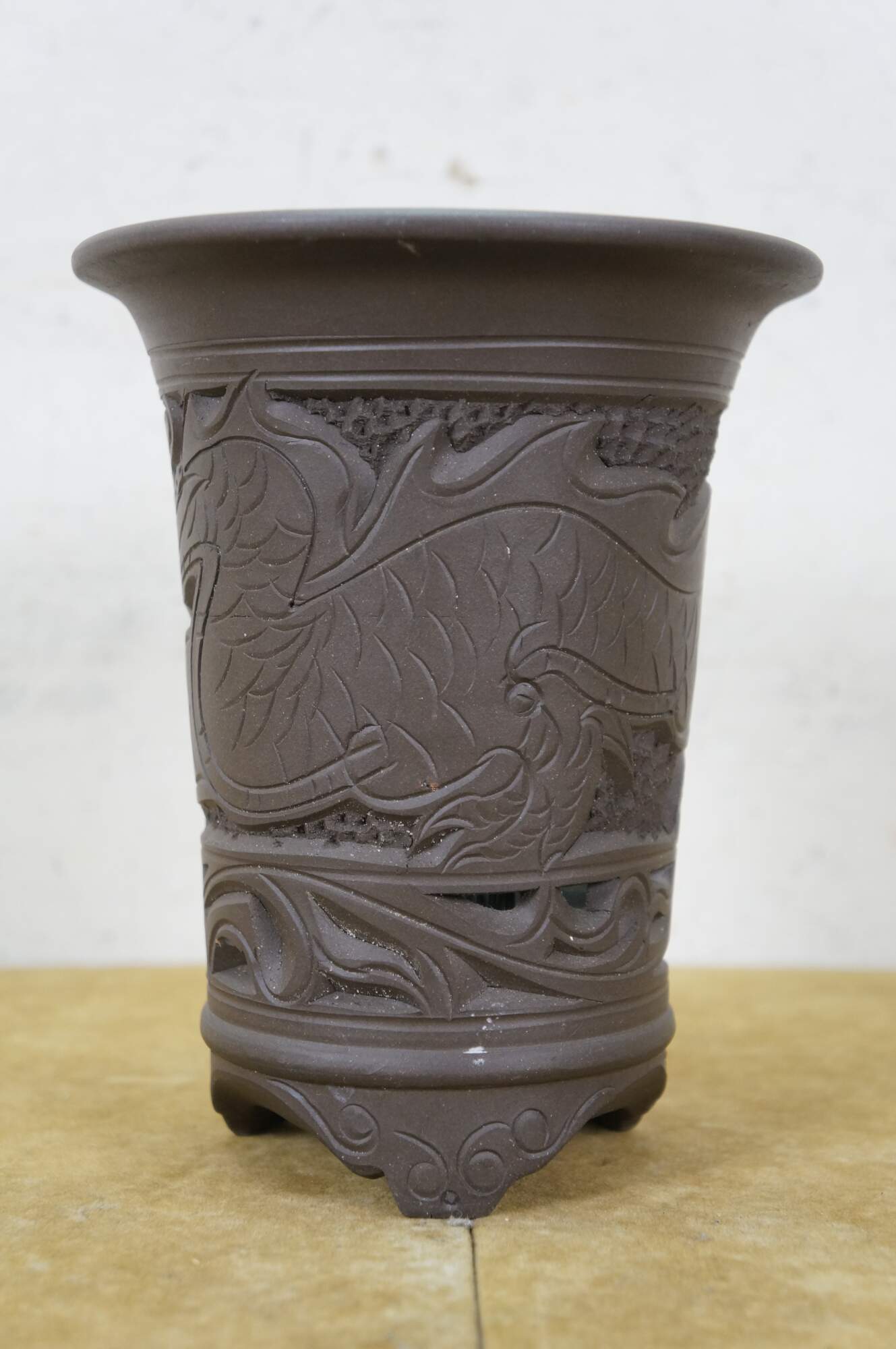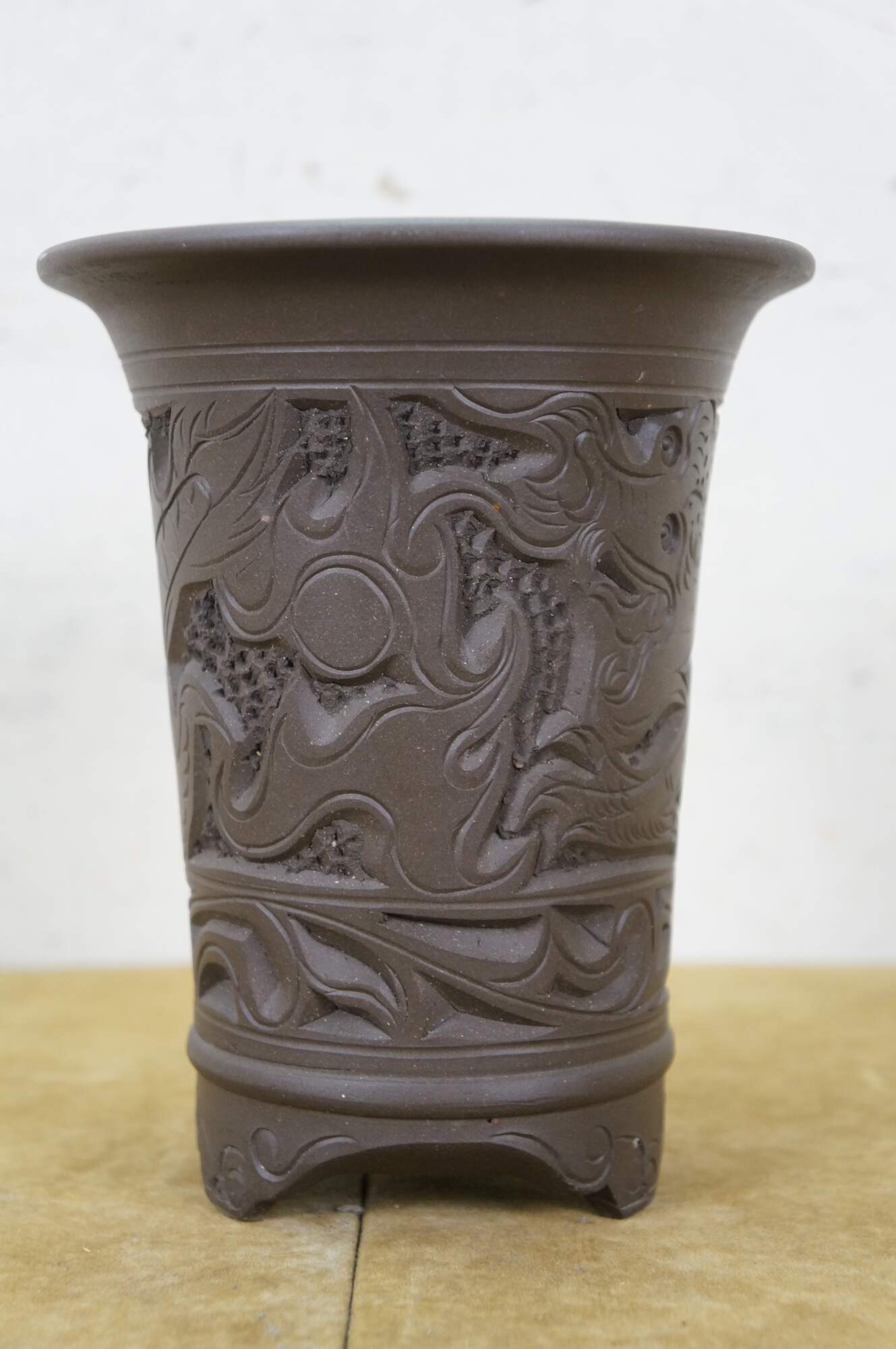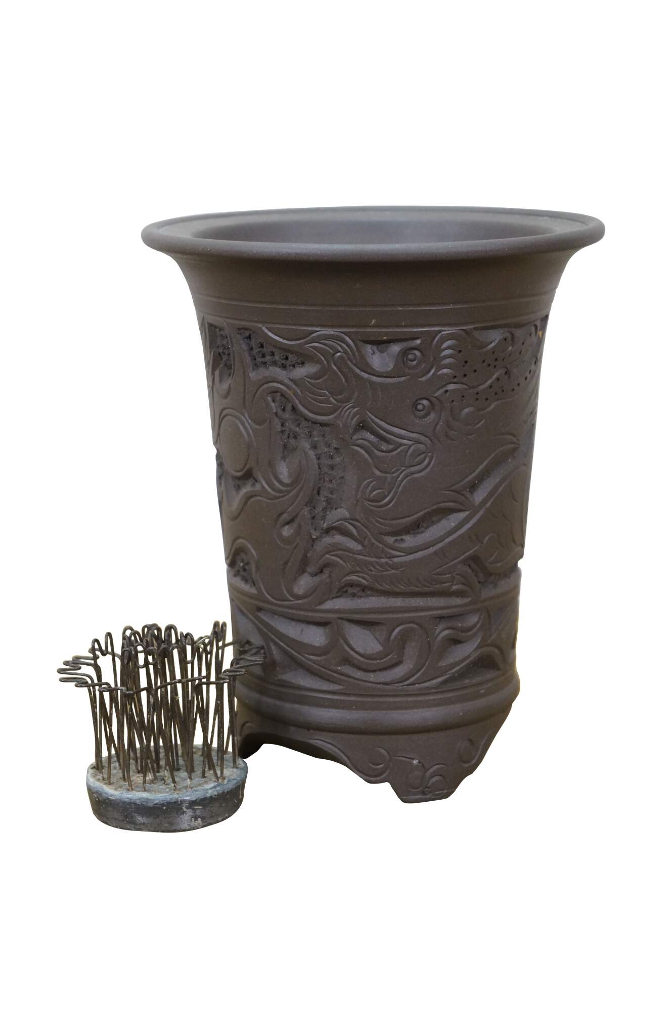 Chinese brown terracotta Bonsai flower pot / vase / planter - unglazed surface carved with a swirling five clawed relief dragon and cloud design, cylindrical body, flared mouth. Large drainage hole in base. Includes an iron and wire Blue Ribbon Flower Holder / flower frog / kusamono tool for arranging plants. The dragon and clouds are a traditional symbol of good luck and prosperity.
