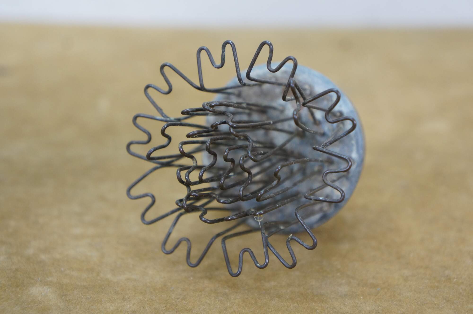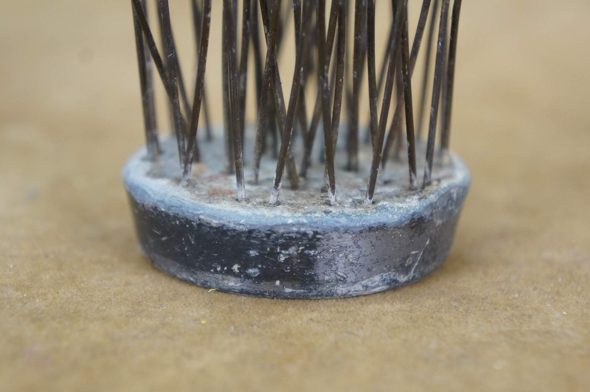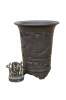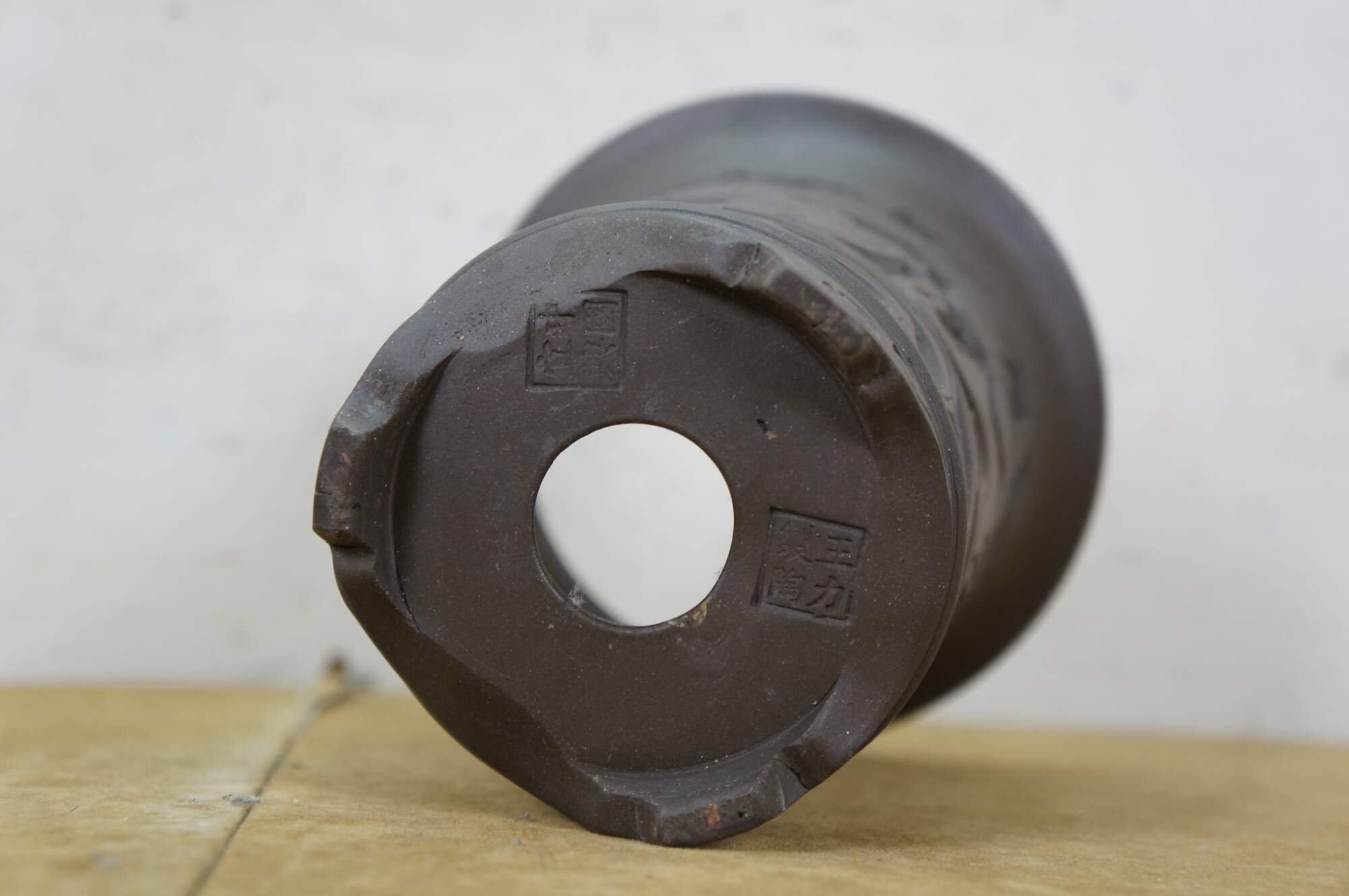 Chinese brown terracotta Bonsai flower pot / vase / planter - unglazed surface carved with a swirling five clawed relief dragon and cloud design, cylindrical body, flared mouth. Large drainage hole in base. Includes an iron and wire Blue Ribbon Flower Holder / flower frog / kusamono tool for arranging plants. The dragon and clouds are a traditional symbol of good luck and prosperity.