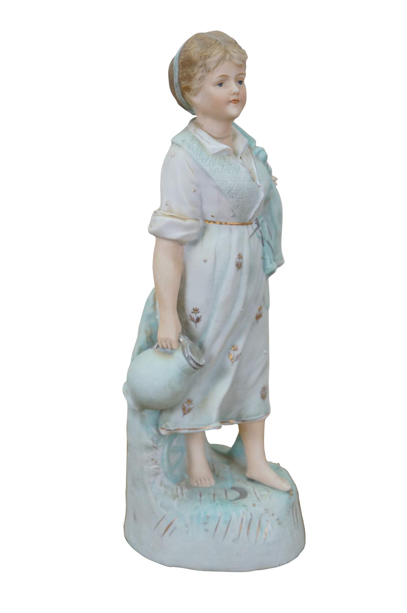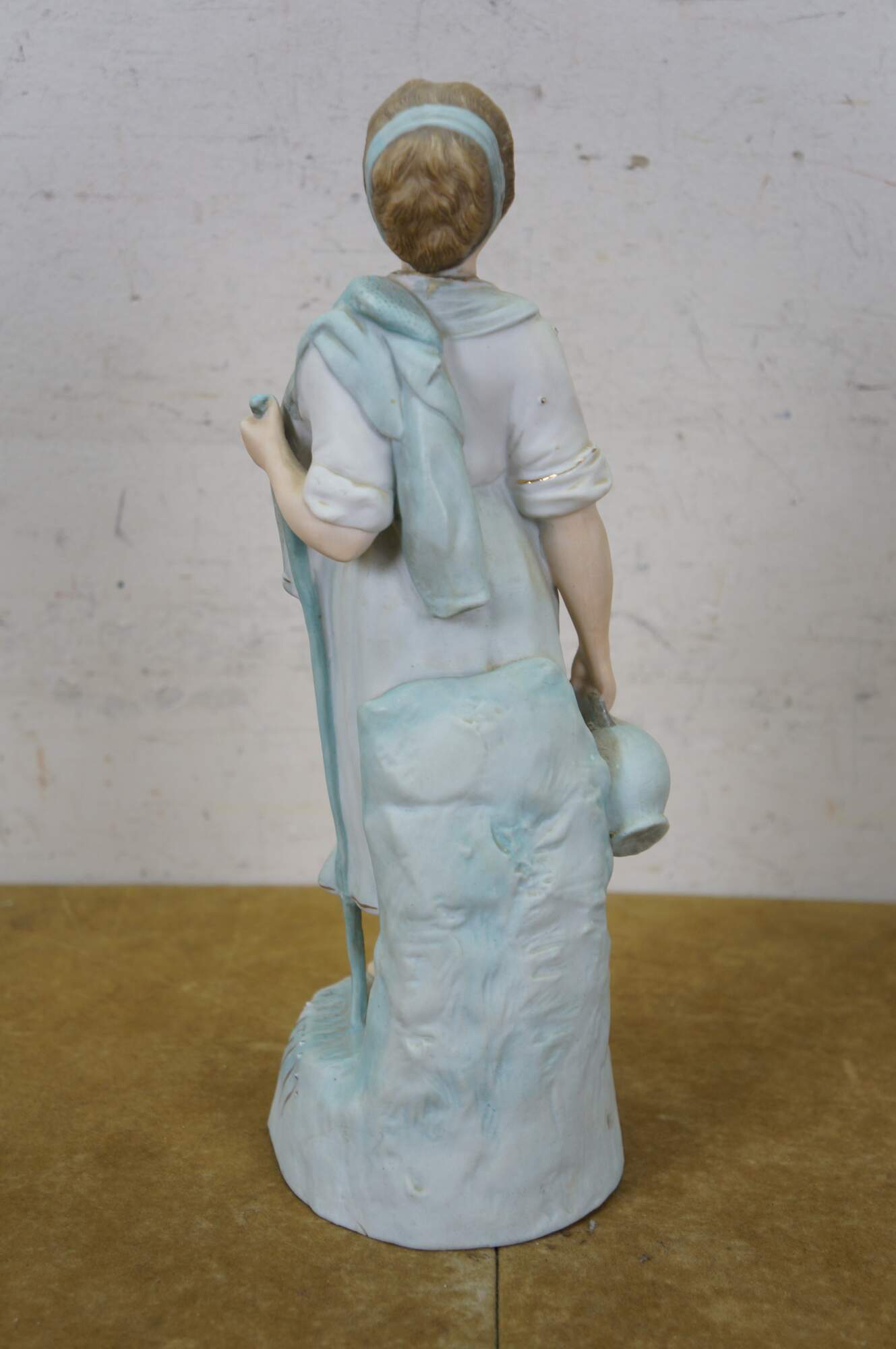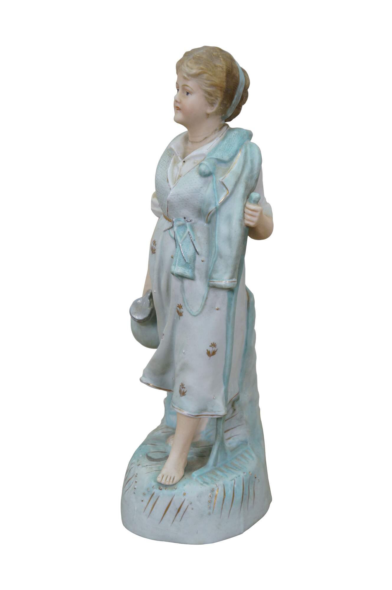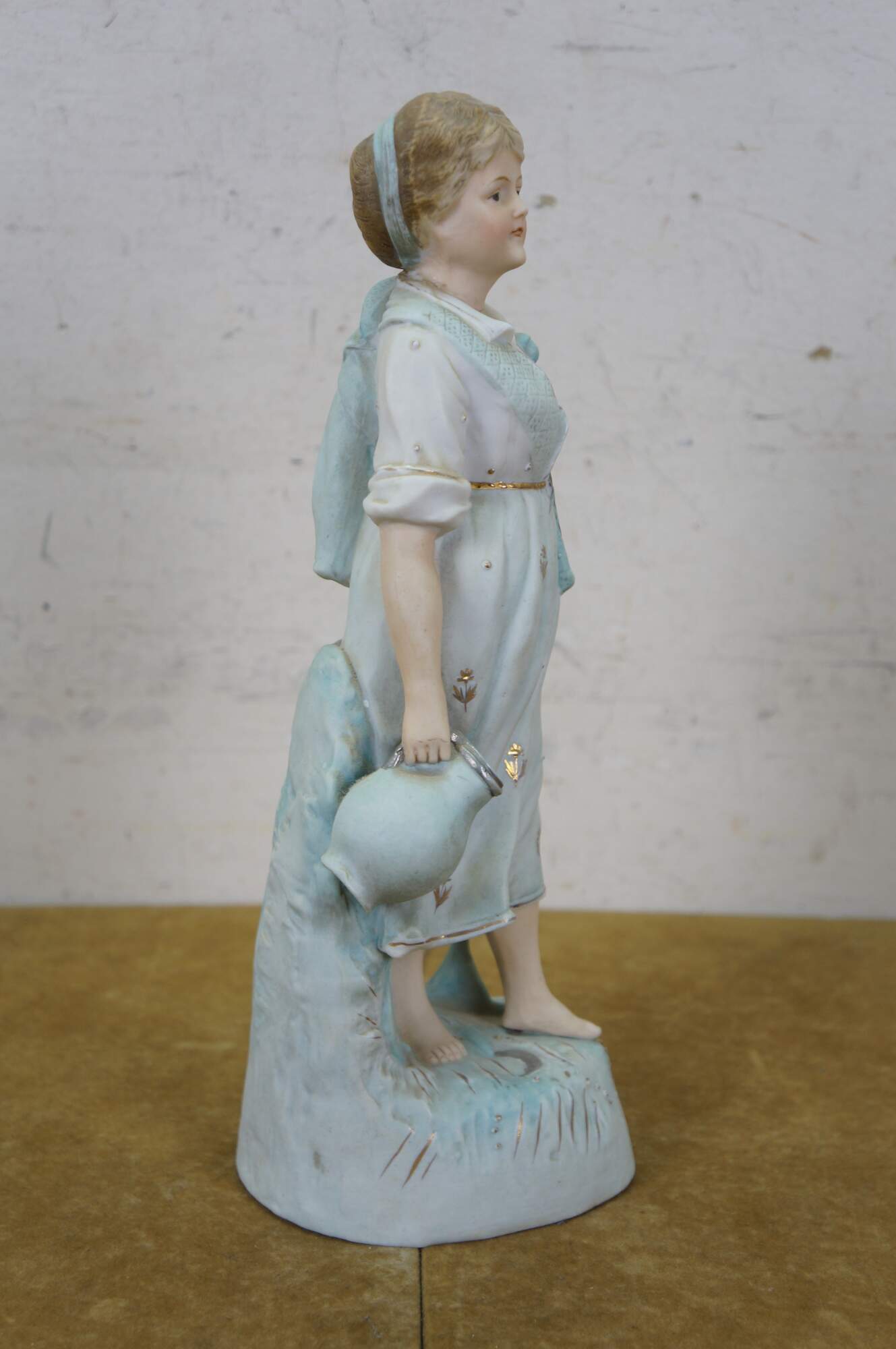 Early to mid 20th century German bisque sculpture / figurine in the shape of a peasant woman in blue and white clothing carrying a jug and a rake.