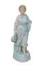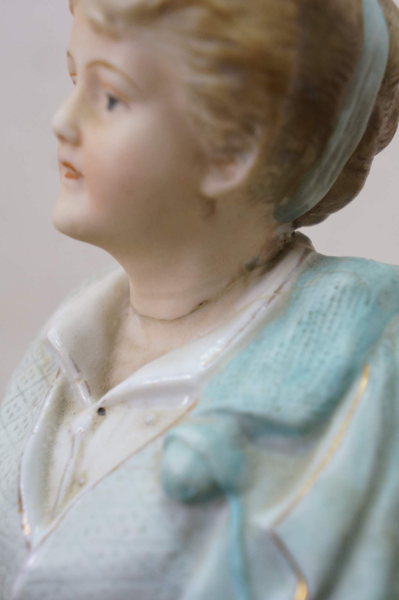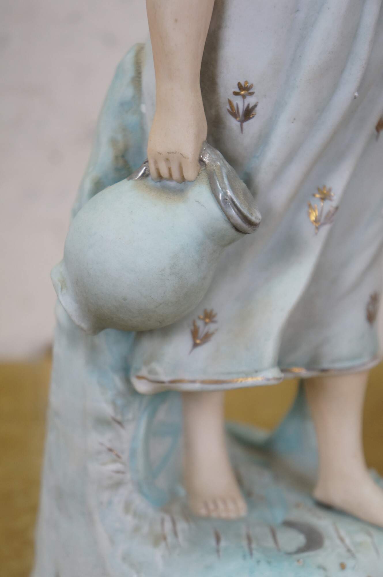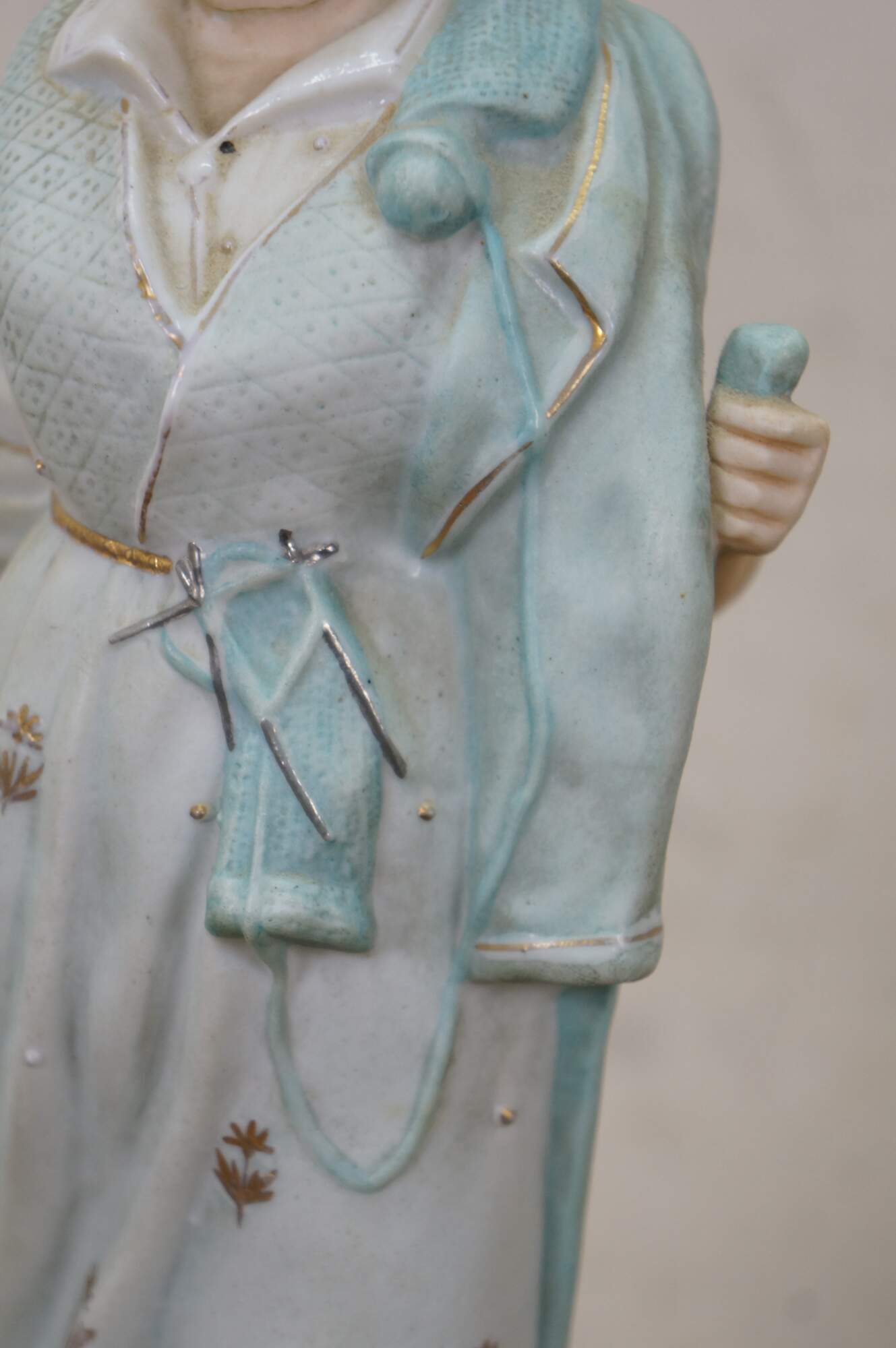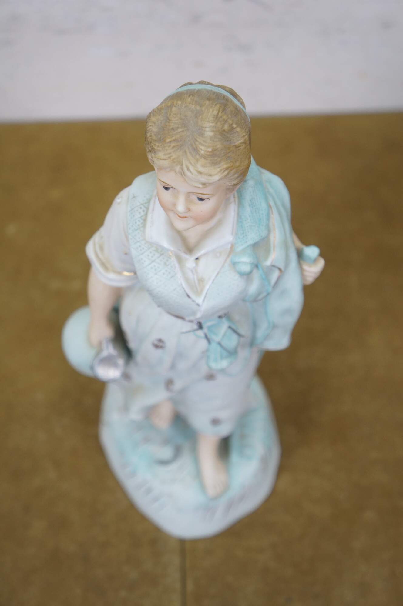 Early to mid 20th century German bisque sculpture / figurine in the shape of a peasant woman in blue and white clothing carrying a jug and a rake.