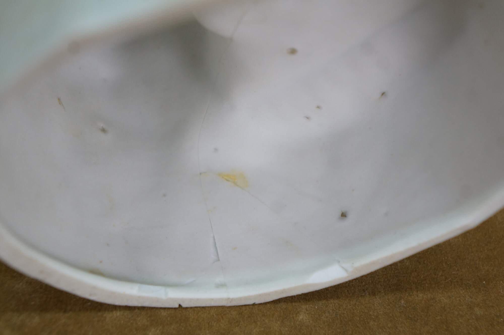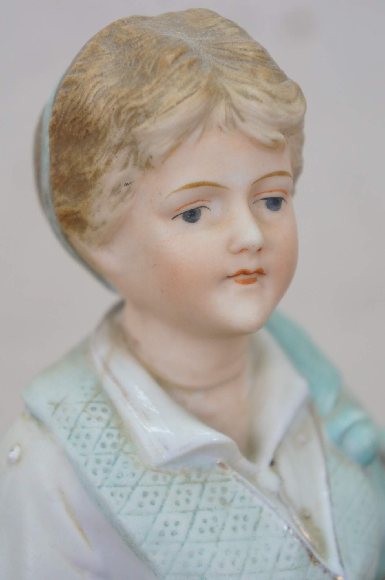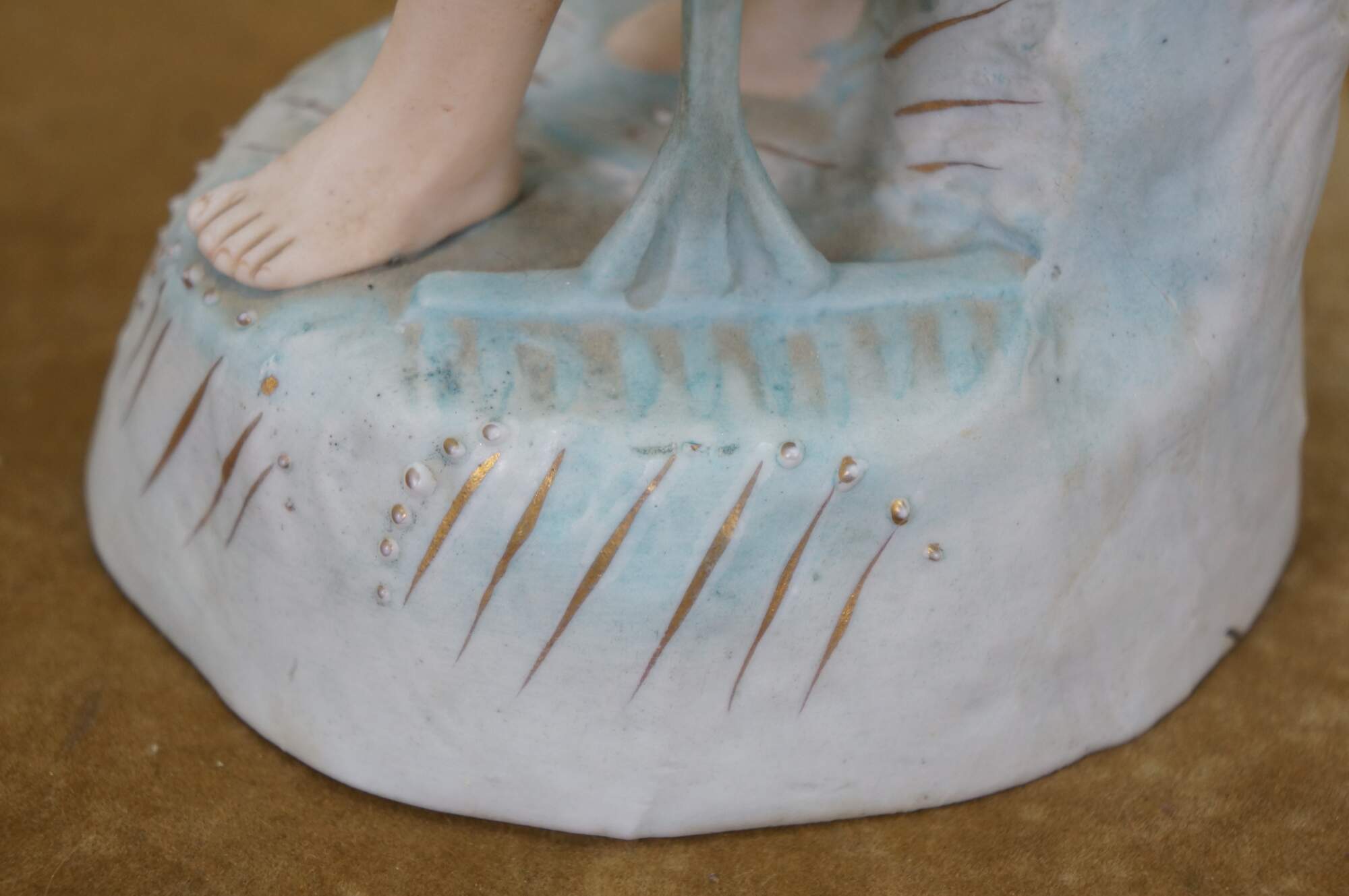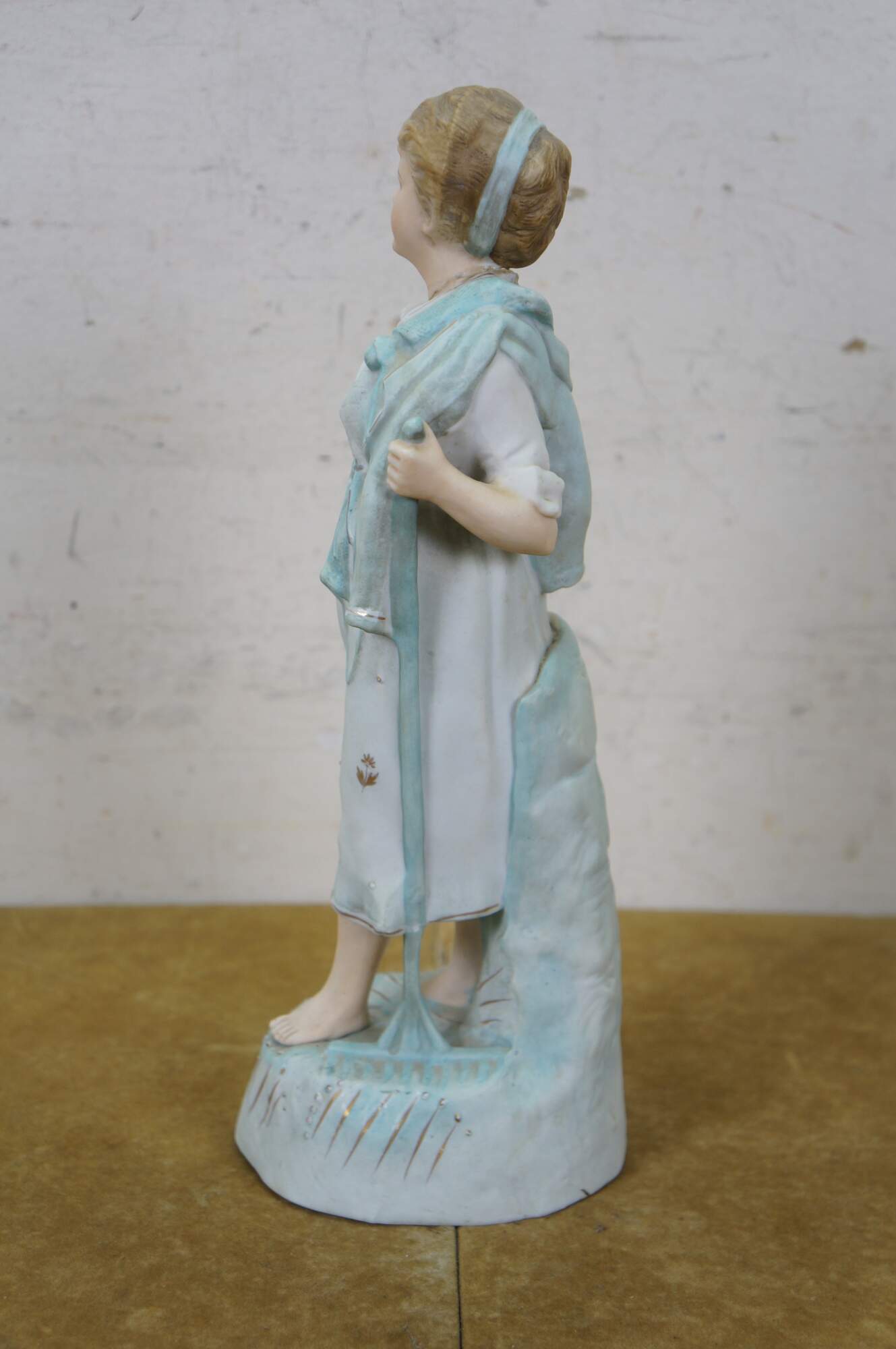 Early to mid 20th century German bisque sculpture / figurine in the shape of a peasant woman in blue and white clothing carrying a jug and a rake.