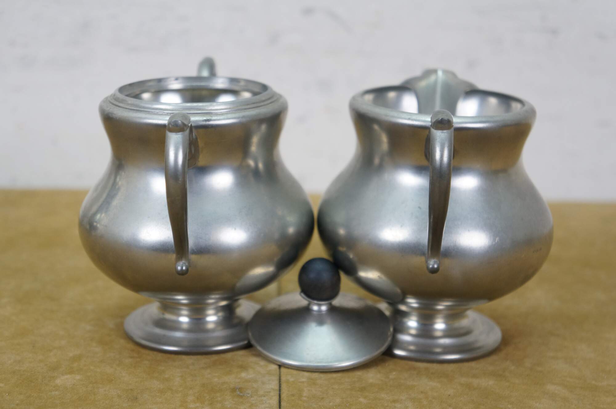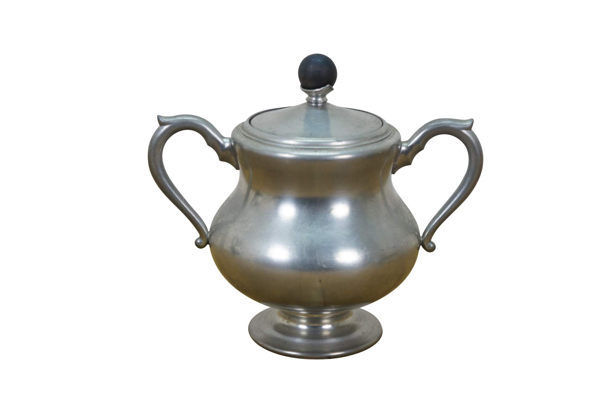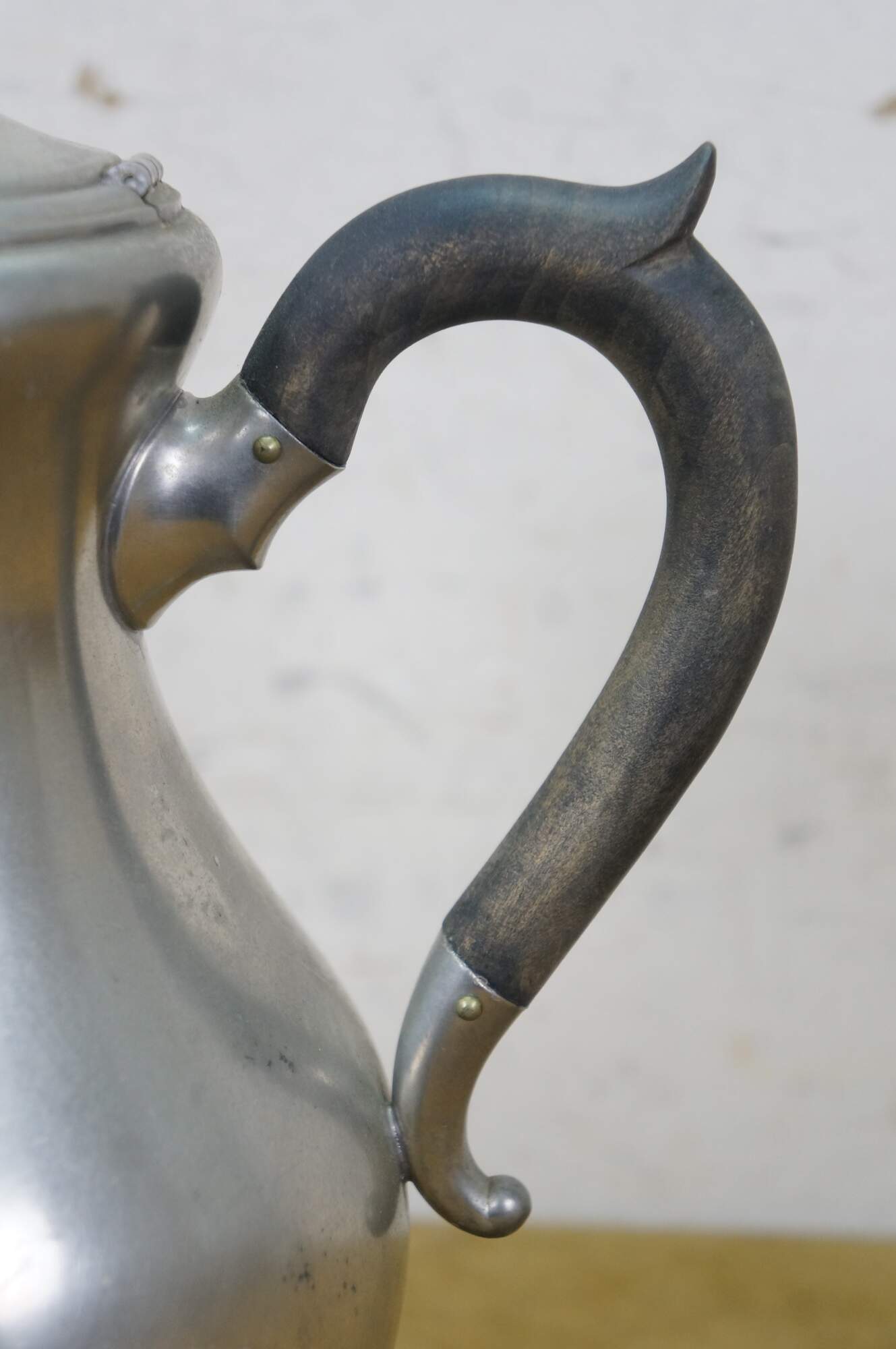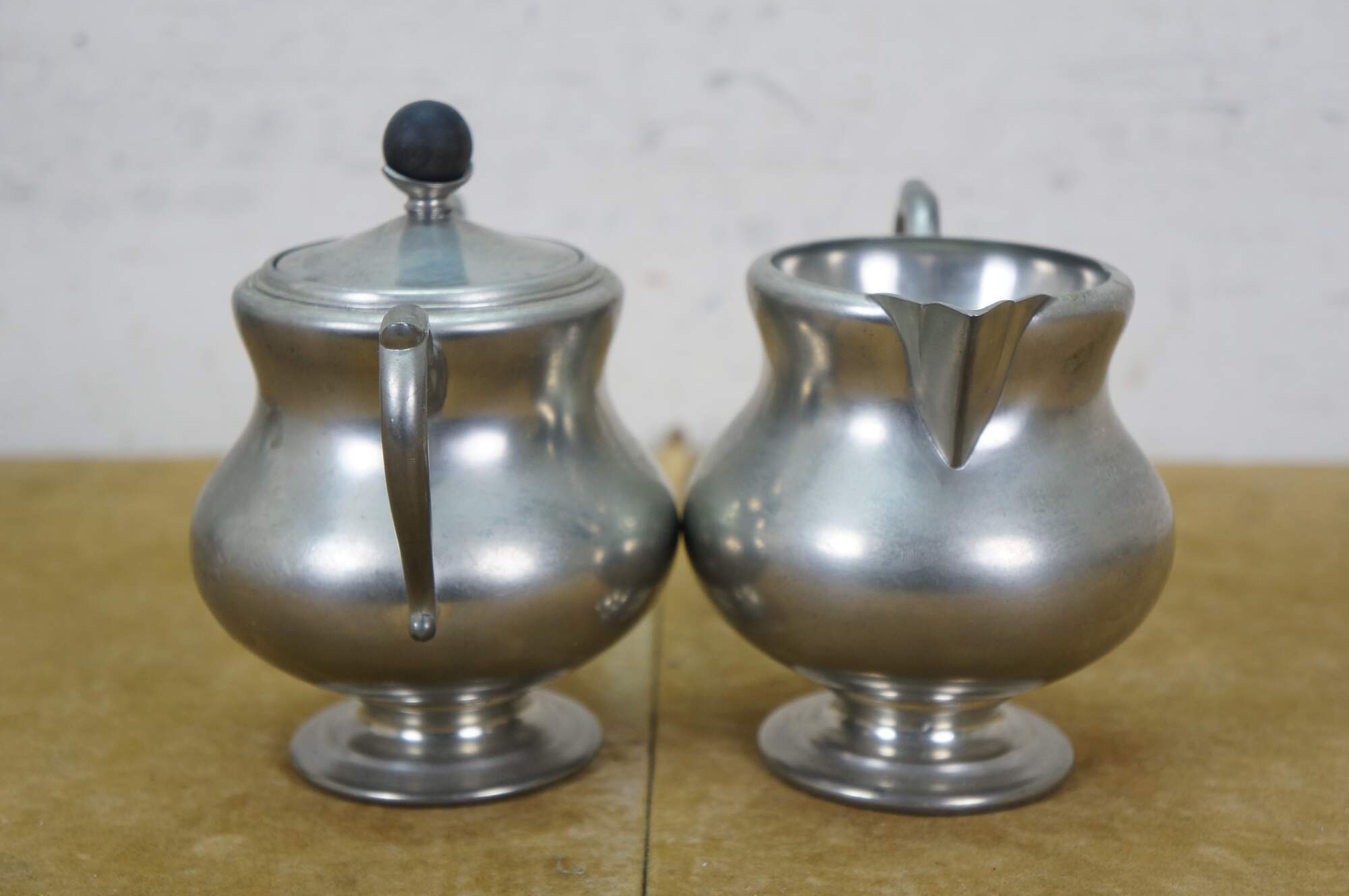 Vintage 20th century KMD Royal Holland Pewter tea set including tea / coffee pot with lid, sugar bowl with lid, and creamer / cream pitcher. Traditional colonial / Victorian styling with wood ball finials and scrolled wood handle on the teapot.