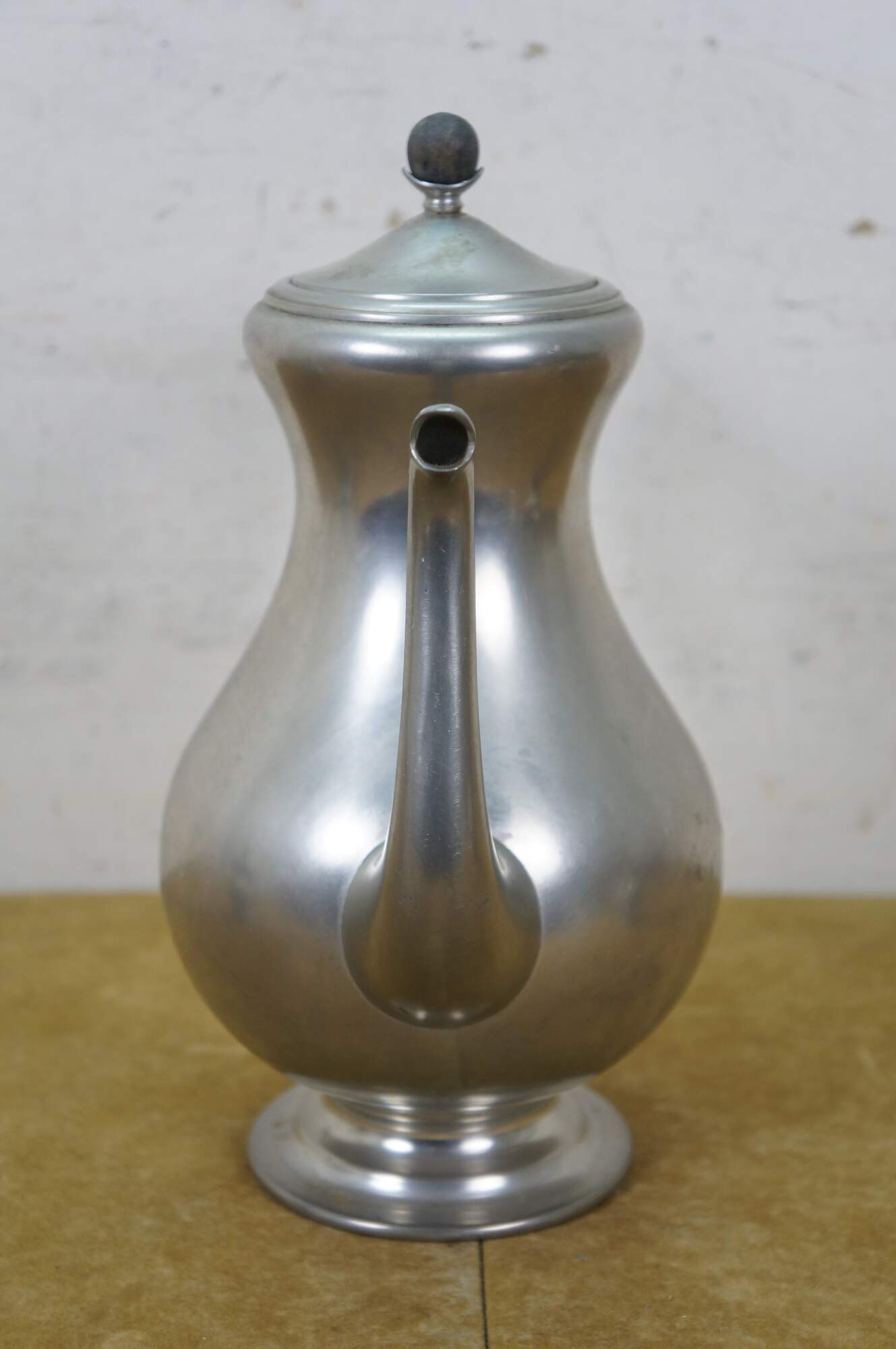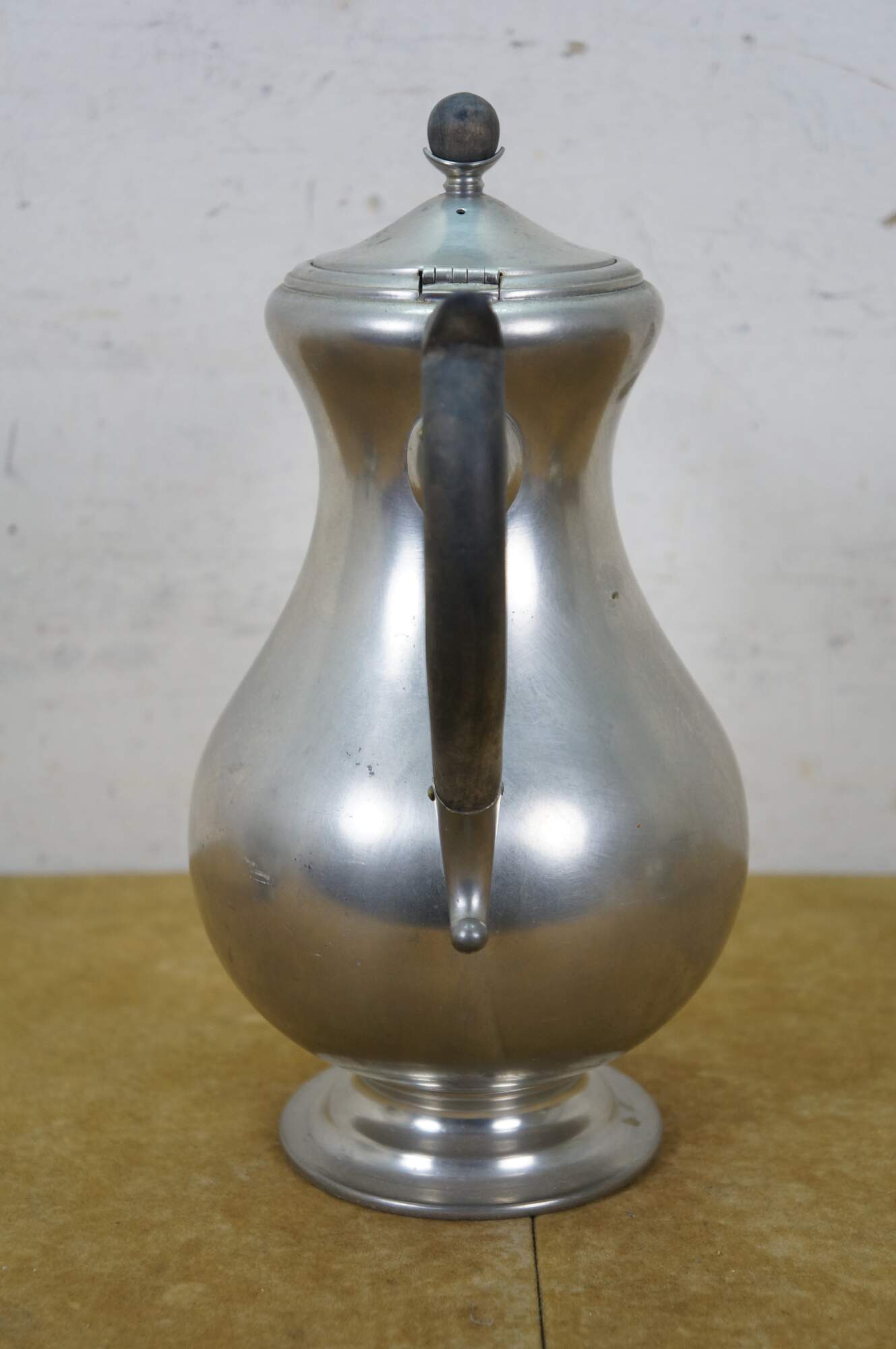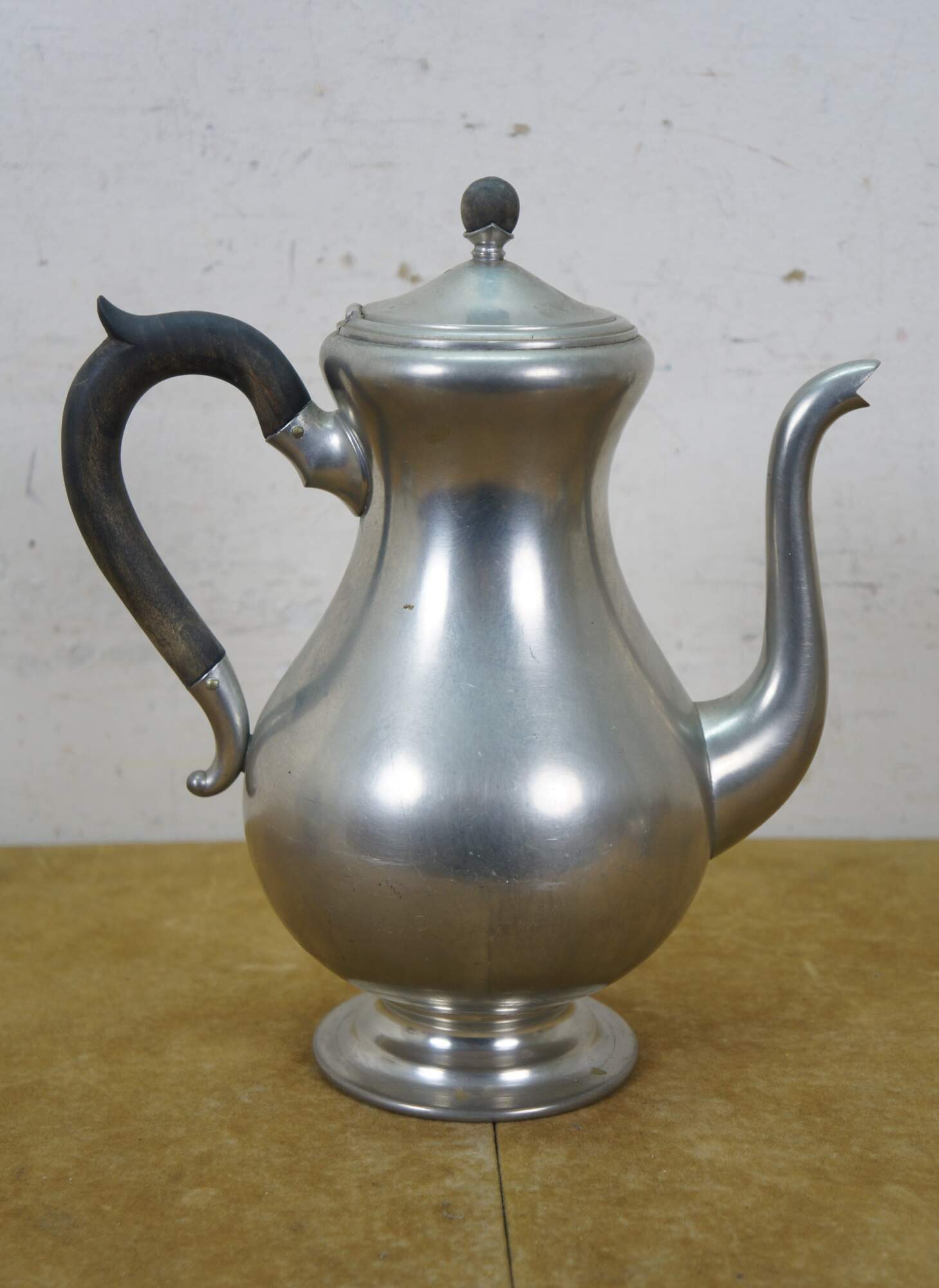 Vintage 20th century KMD Royal Holland Pewter tea set including tea / coffee pot with lid, sugar bowl with lid, and creamer / cream pitcher. Traditional colonial / Victorian styling with wood ball finials and scrolled wood handle on the teapot.