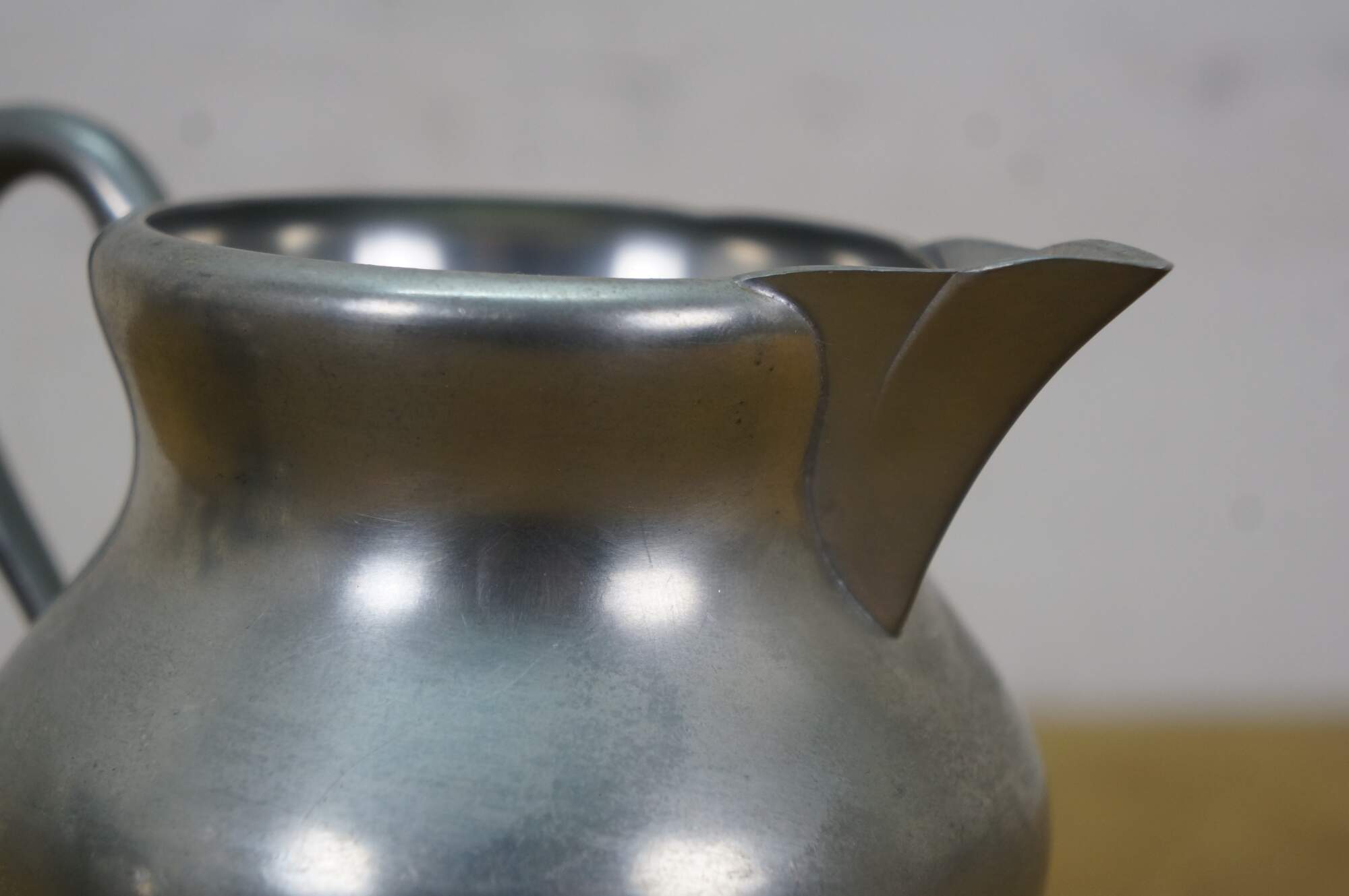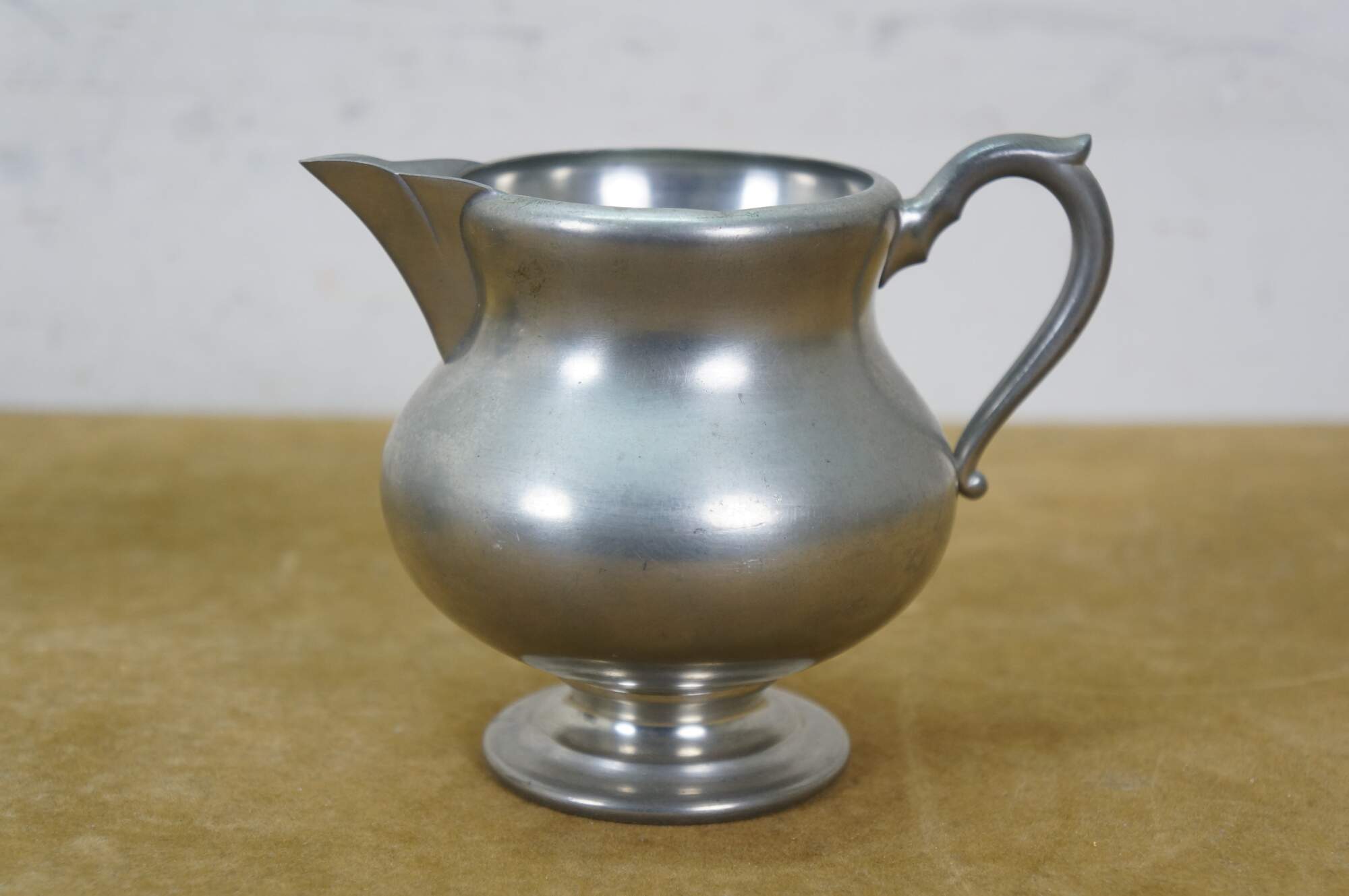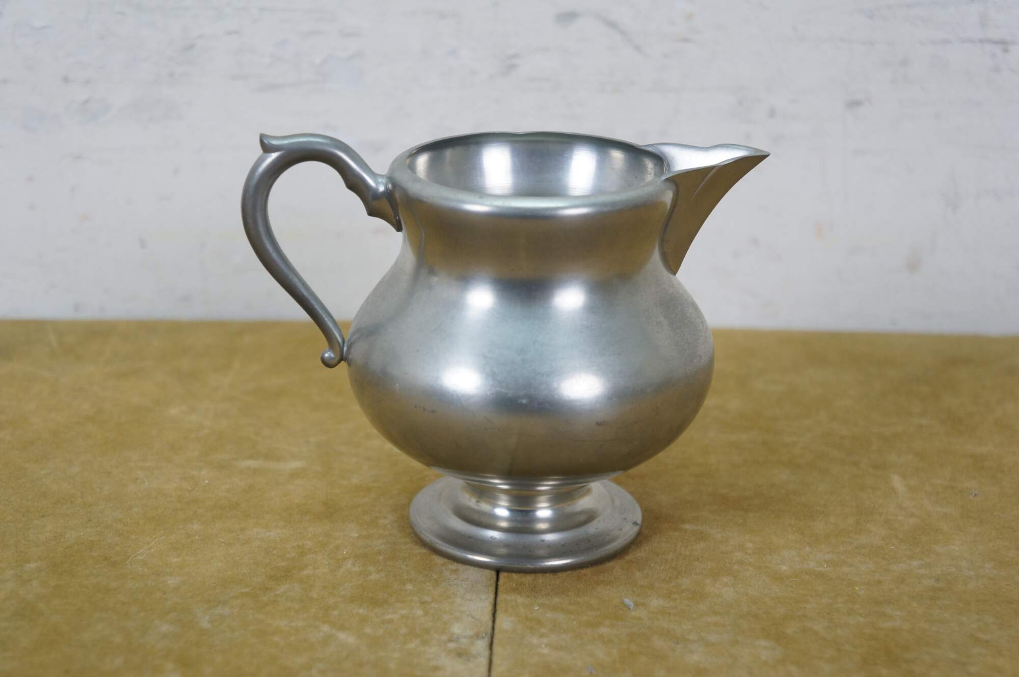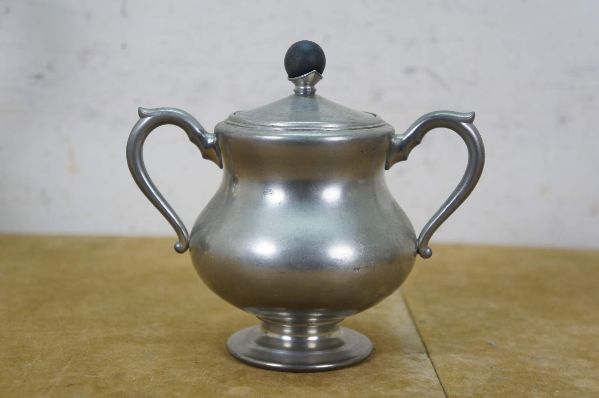 Vintage 20th century KMD Royal Holland Pewter tea set including tea / coffee pot with lid, sugar bowl with lid, and creamer / cream pitcher. Traditional colonial / Victorian styling with wood ball finials and scrolled wood handle on the teapot.