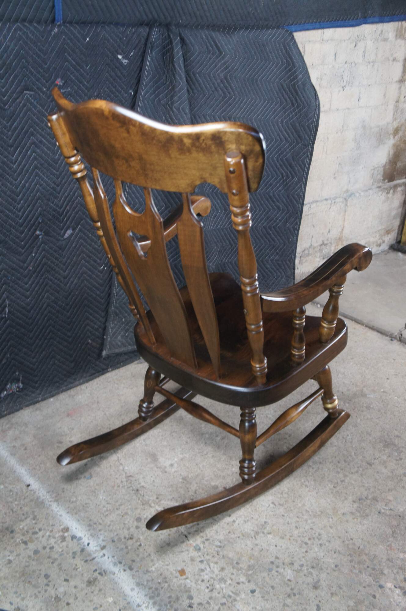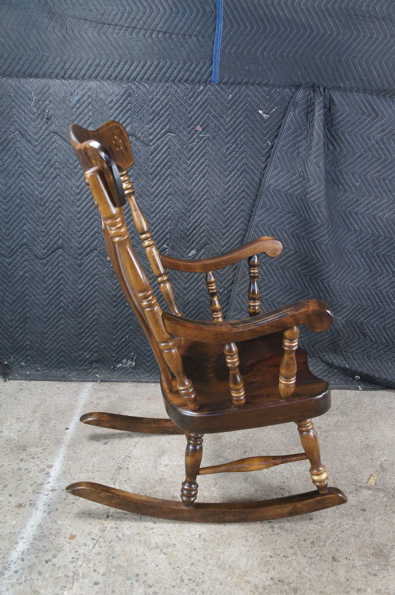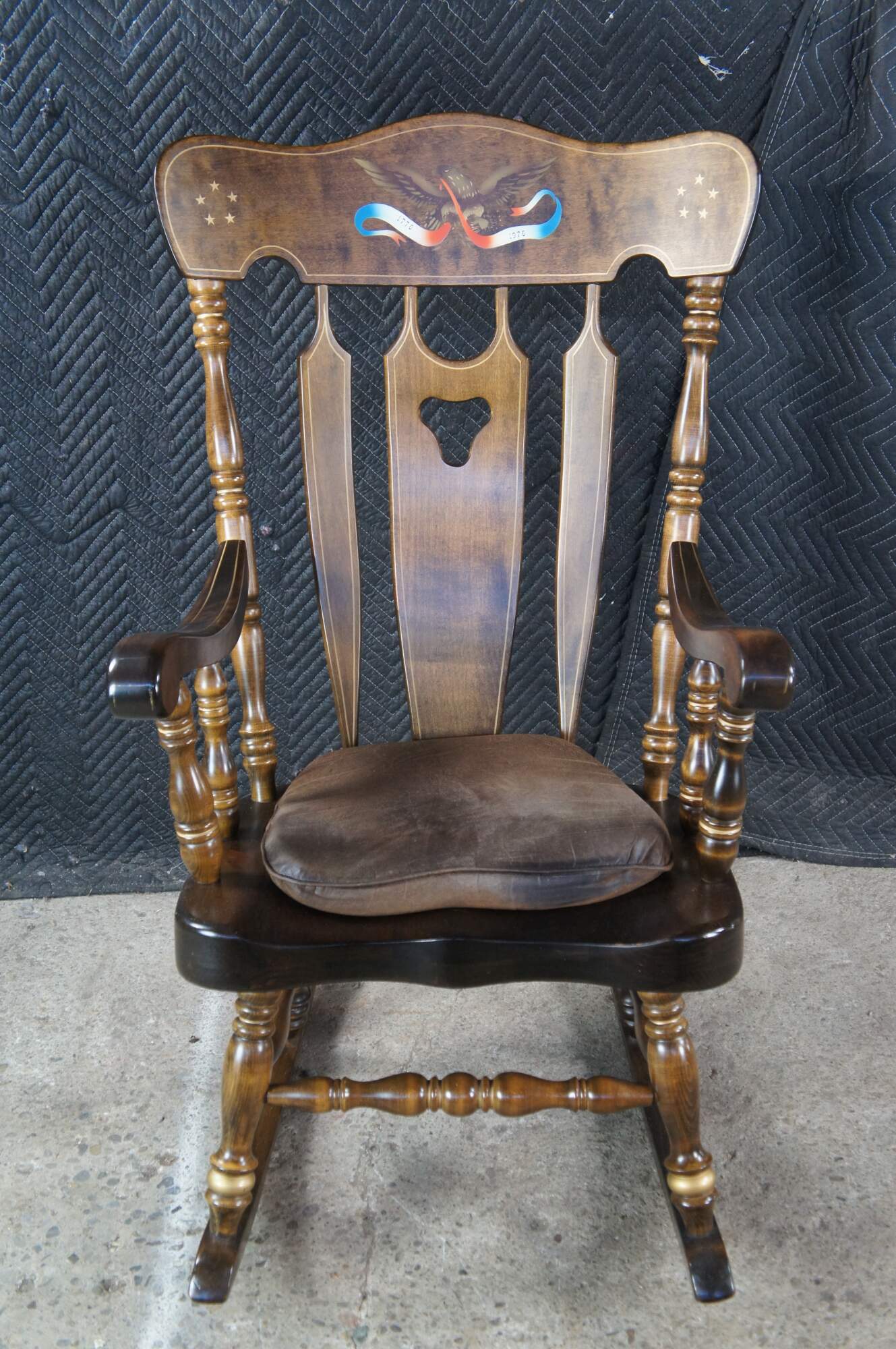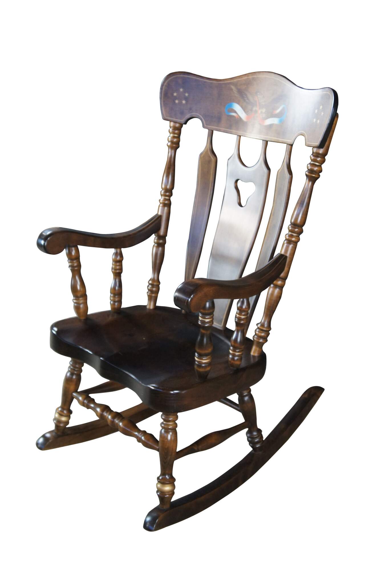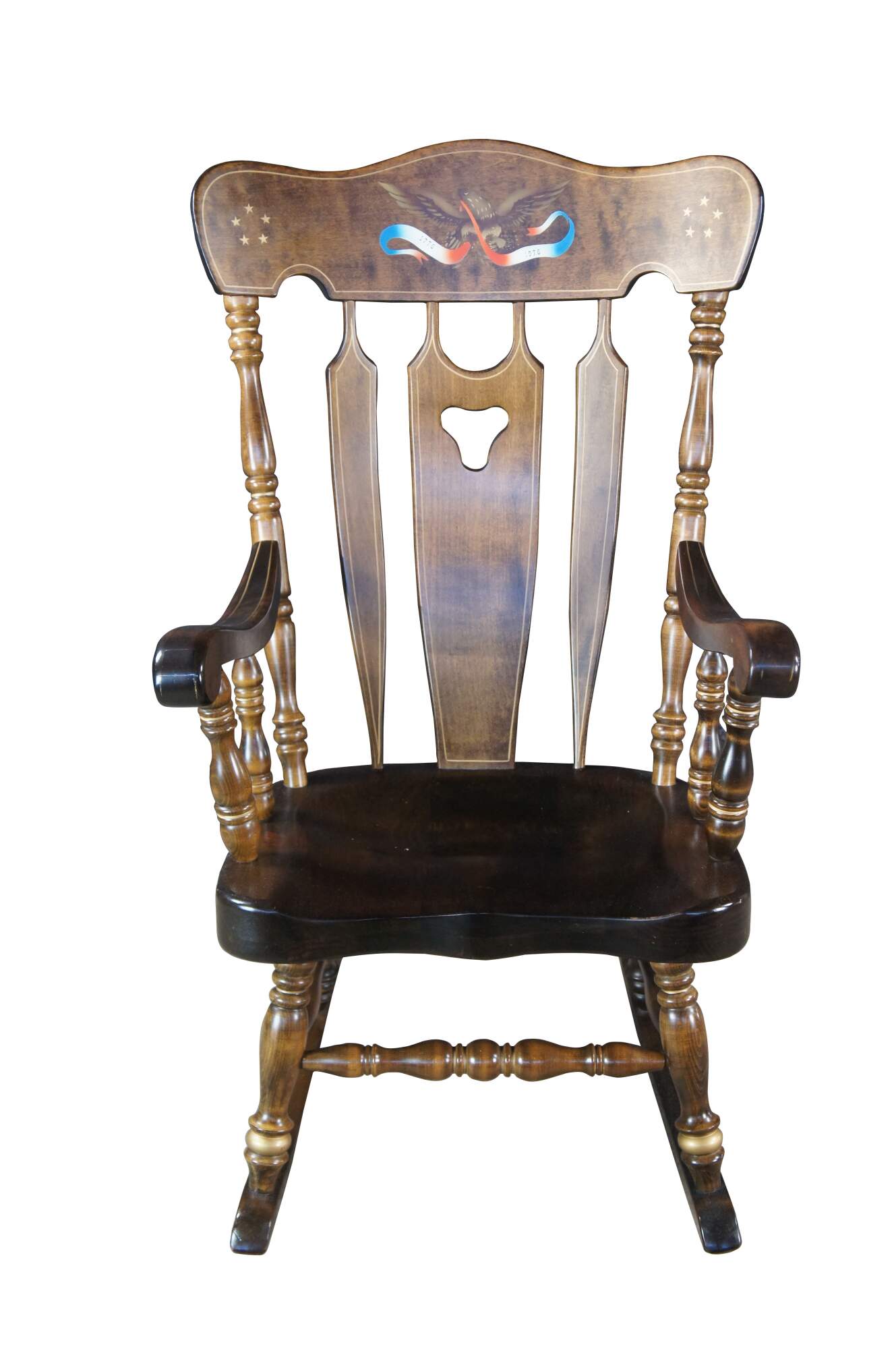 Antique rocking chair by S. Bent & Bros. Made of Maple featuring colonial styling with slatted back and turned posts with a stenciled American Eagle 1776-1976 banner and stars. 833 1174.