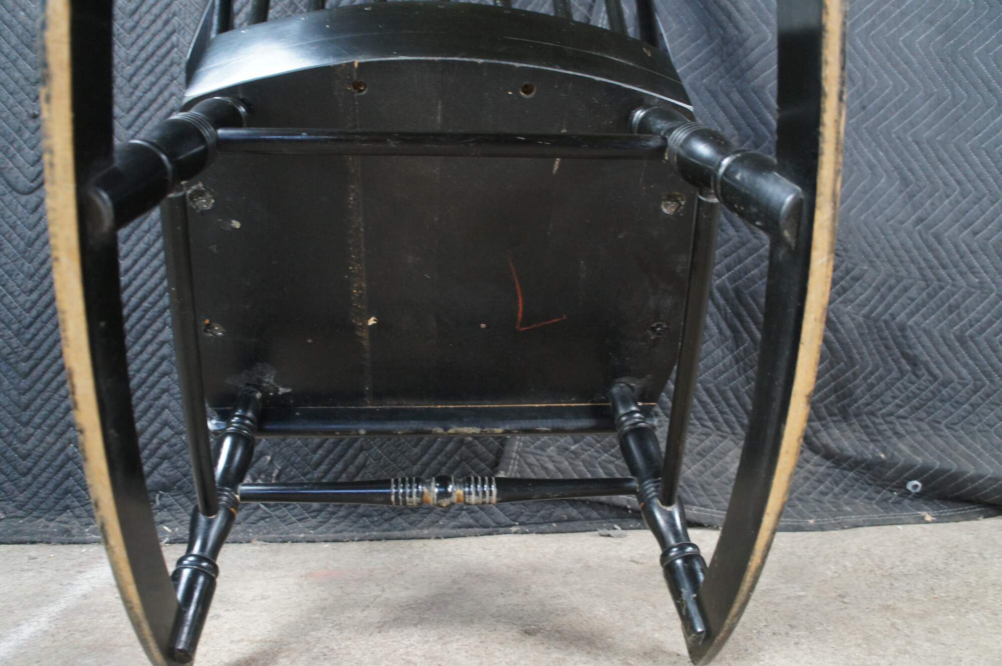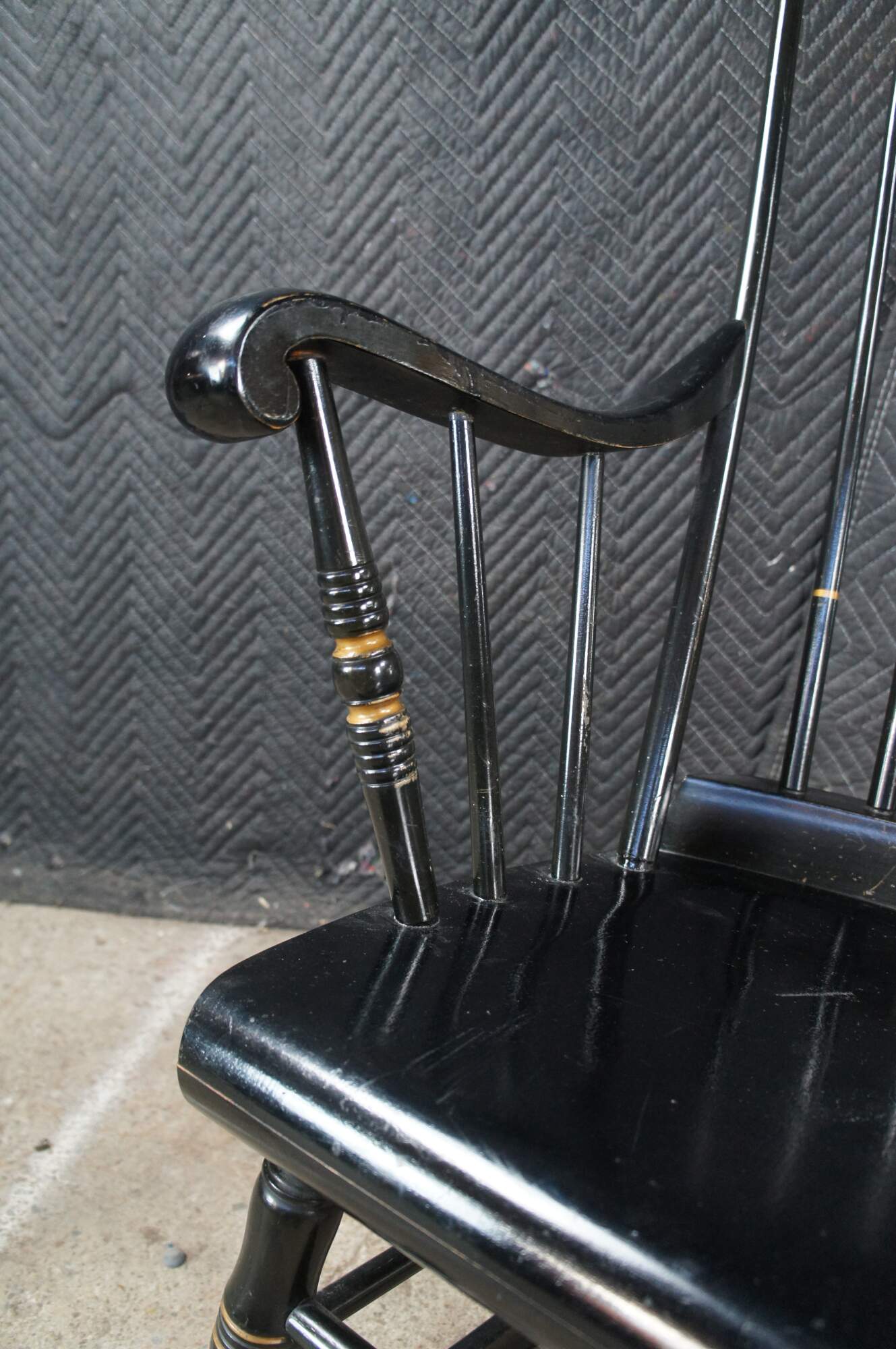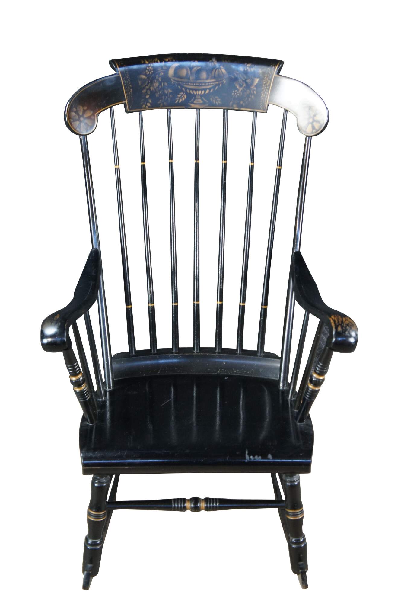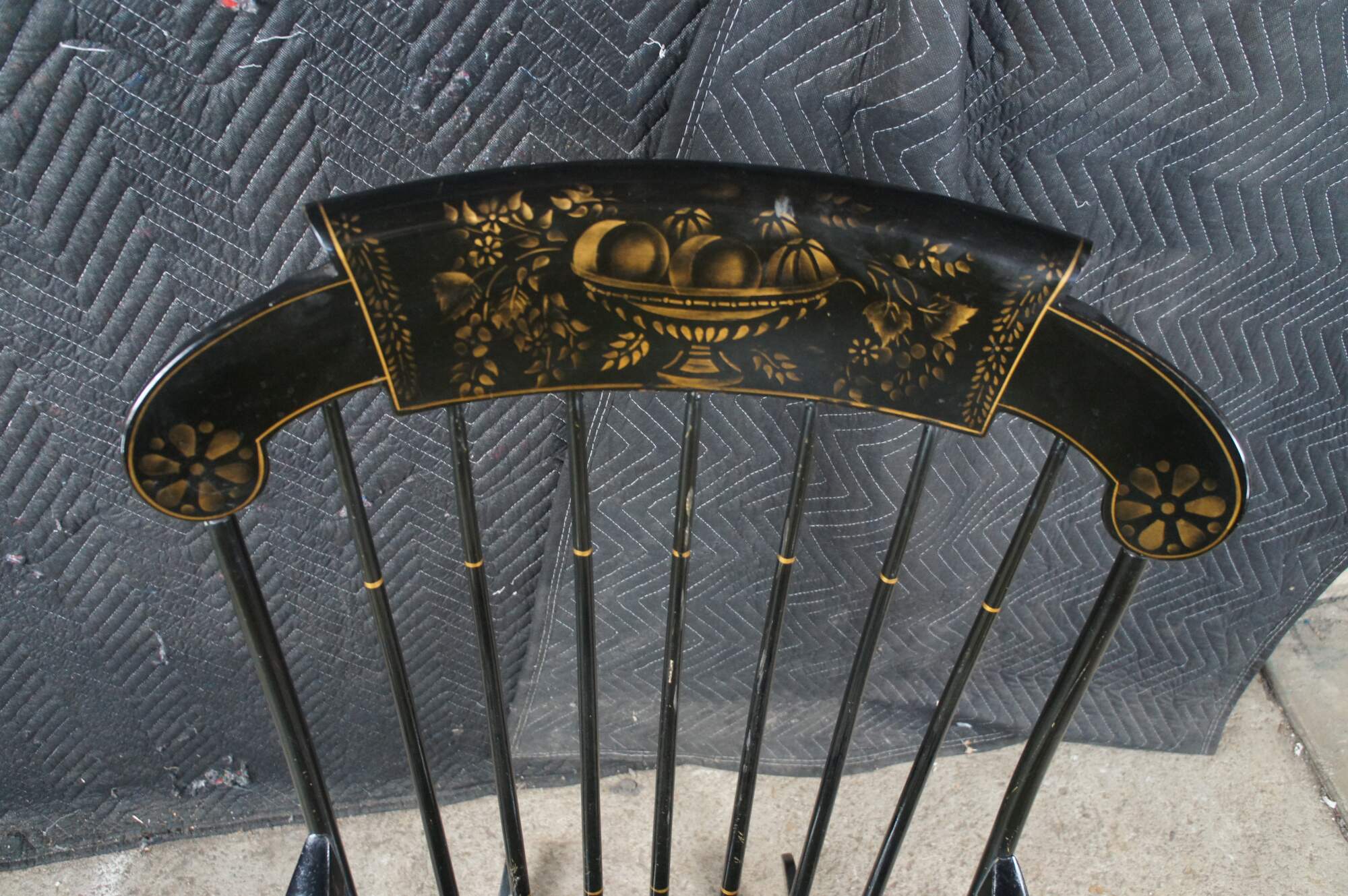 Antique black harvest Colonial Windsor Hitchcock style rocking armchair / rocker featuring an ebonized finish with gold accents and stenciled fruit.